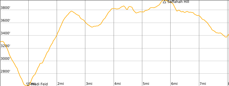 Starting Point: Wadi Feid connector trailhead on Jhair-Feid Road below village of Jhair (Elev. 3300 feet / 1000 meters)