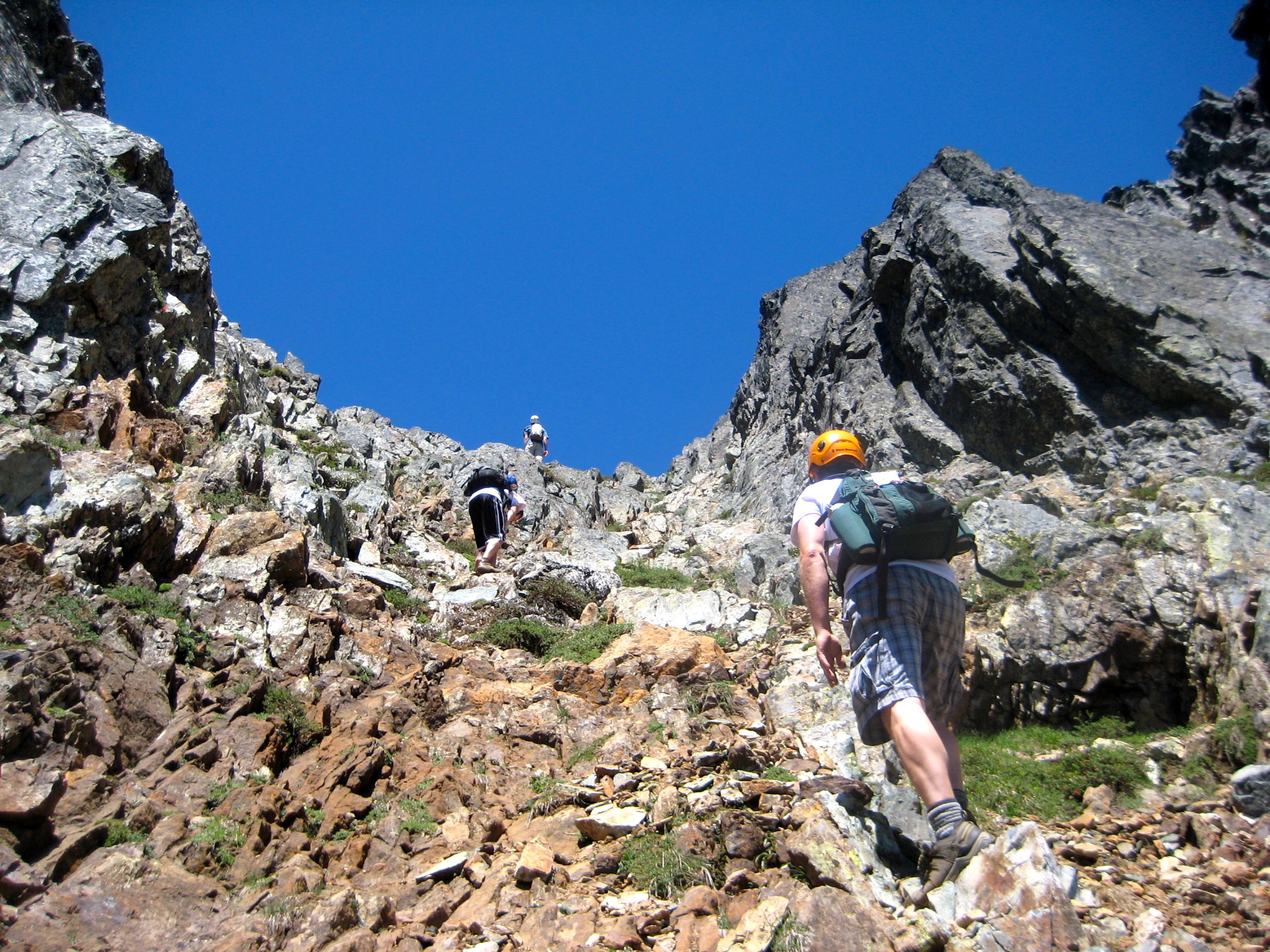 Mountain climbers scramble up a steep rocky slope on Kaleetan Peak