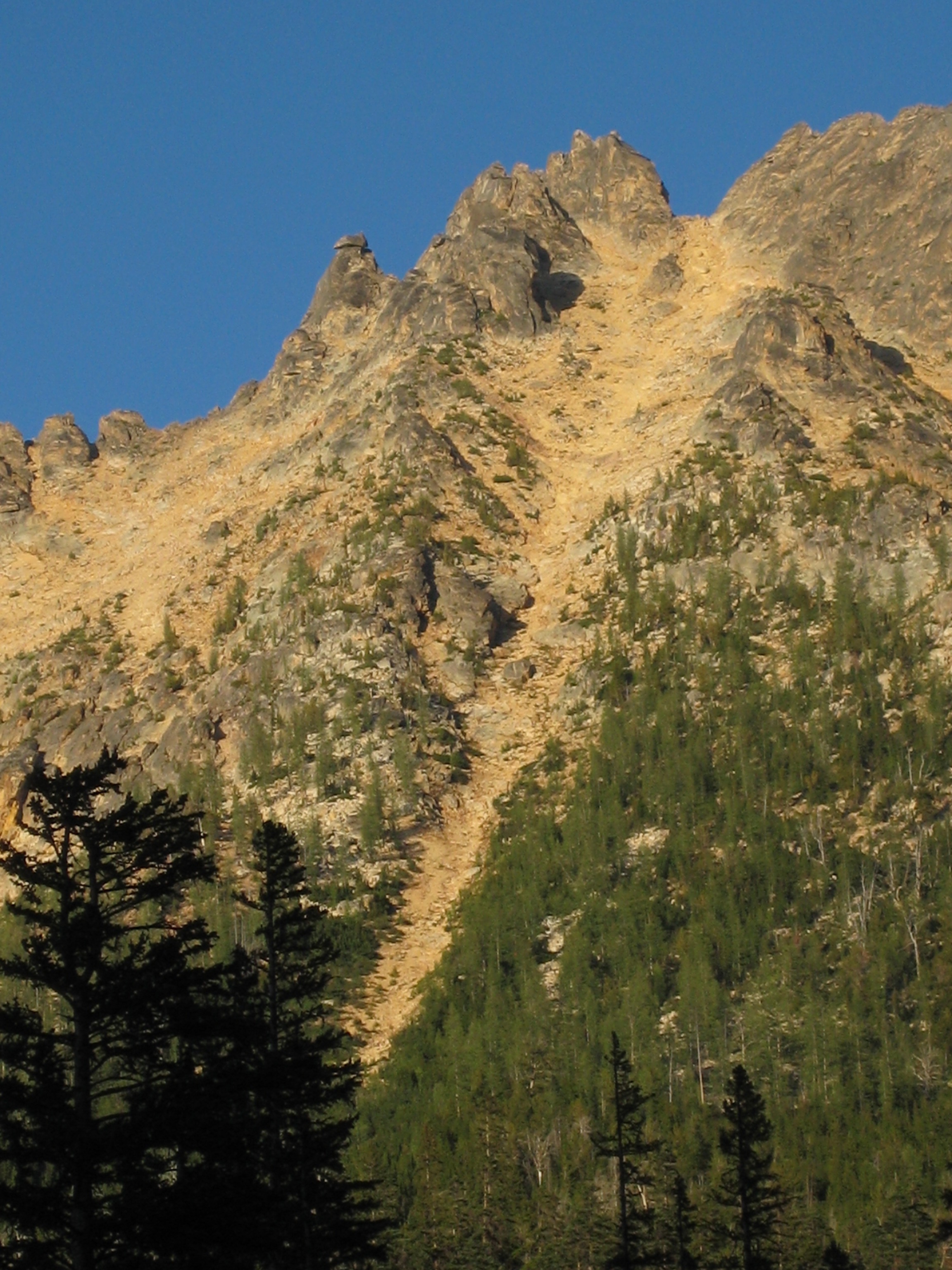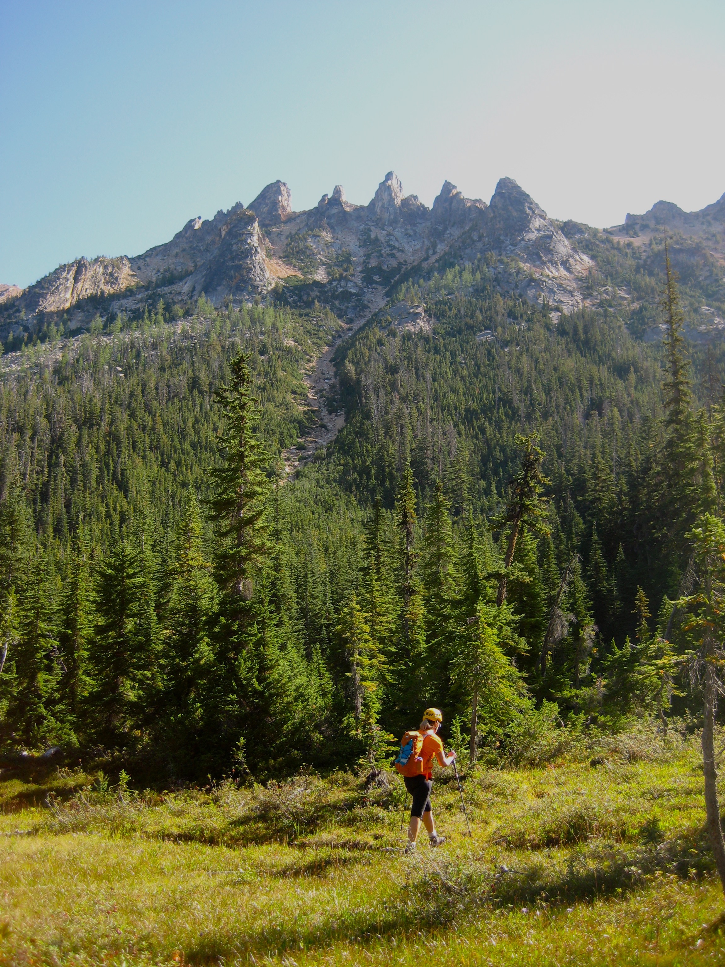 We left the Early Winters Hairpin and began hiking up the climber’s path until directly underneath a long, prominent gully that descends from a point south of Big Kangaroo. After crossing an open meadow and thrashing several hundred feet up some dense forest, we popped out right at the bottom of the gully.