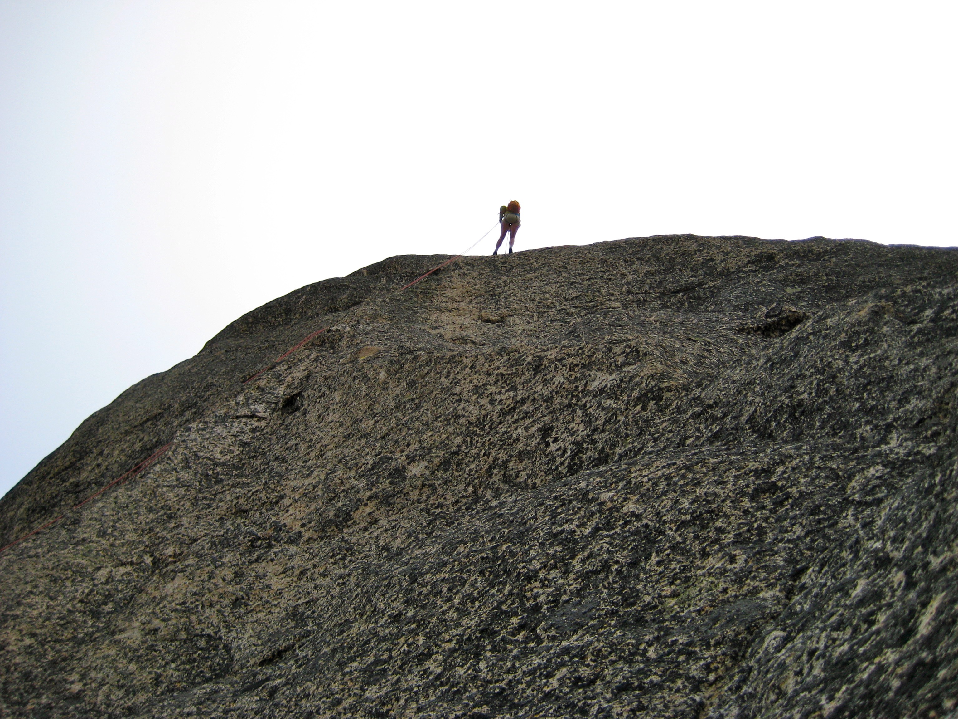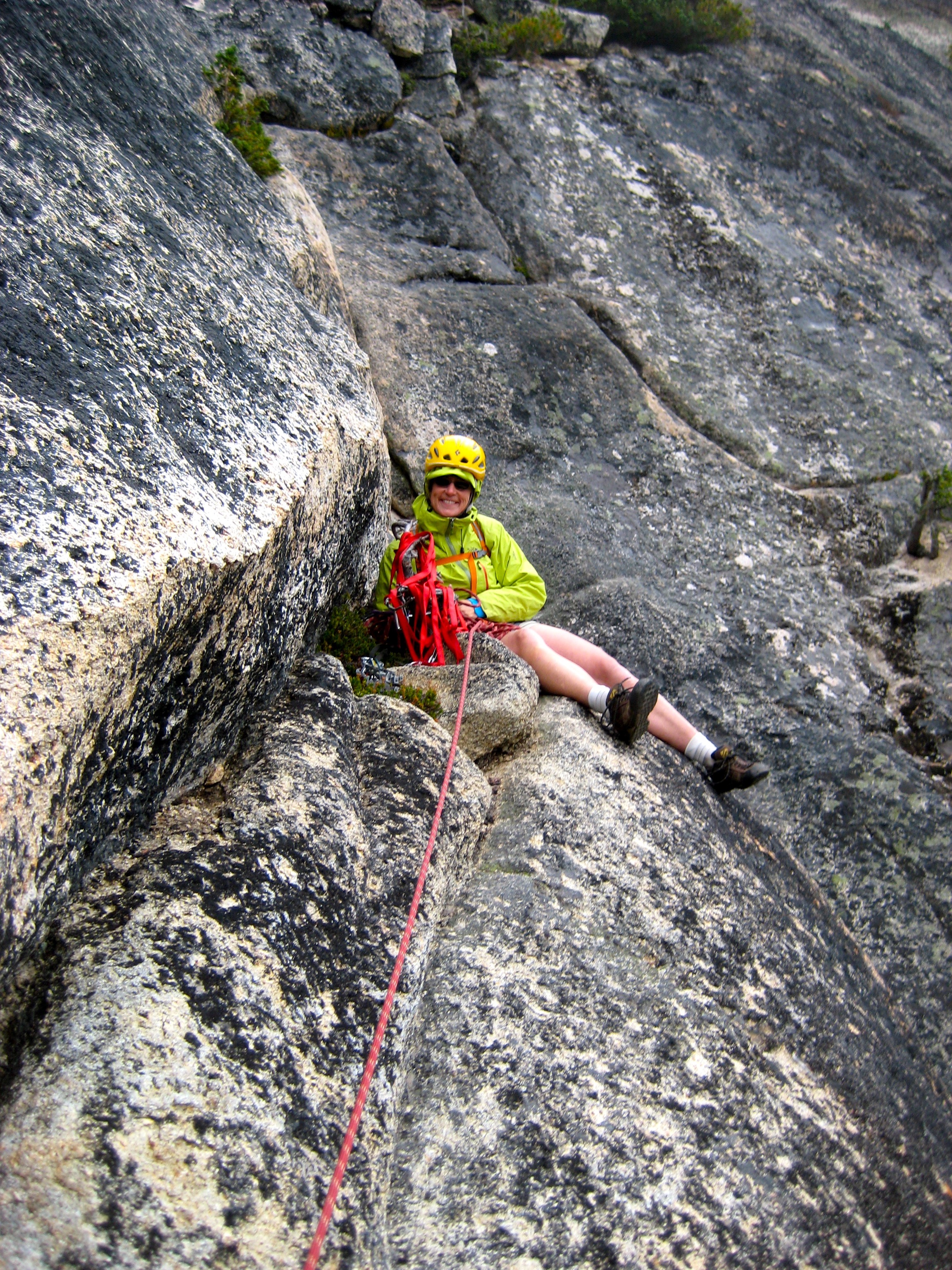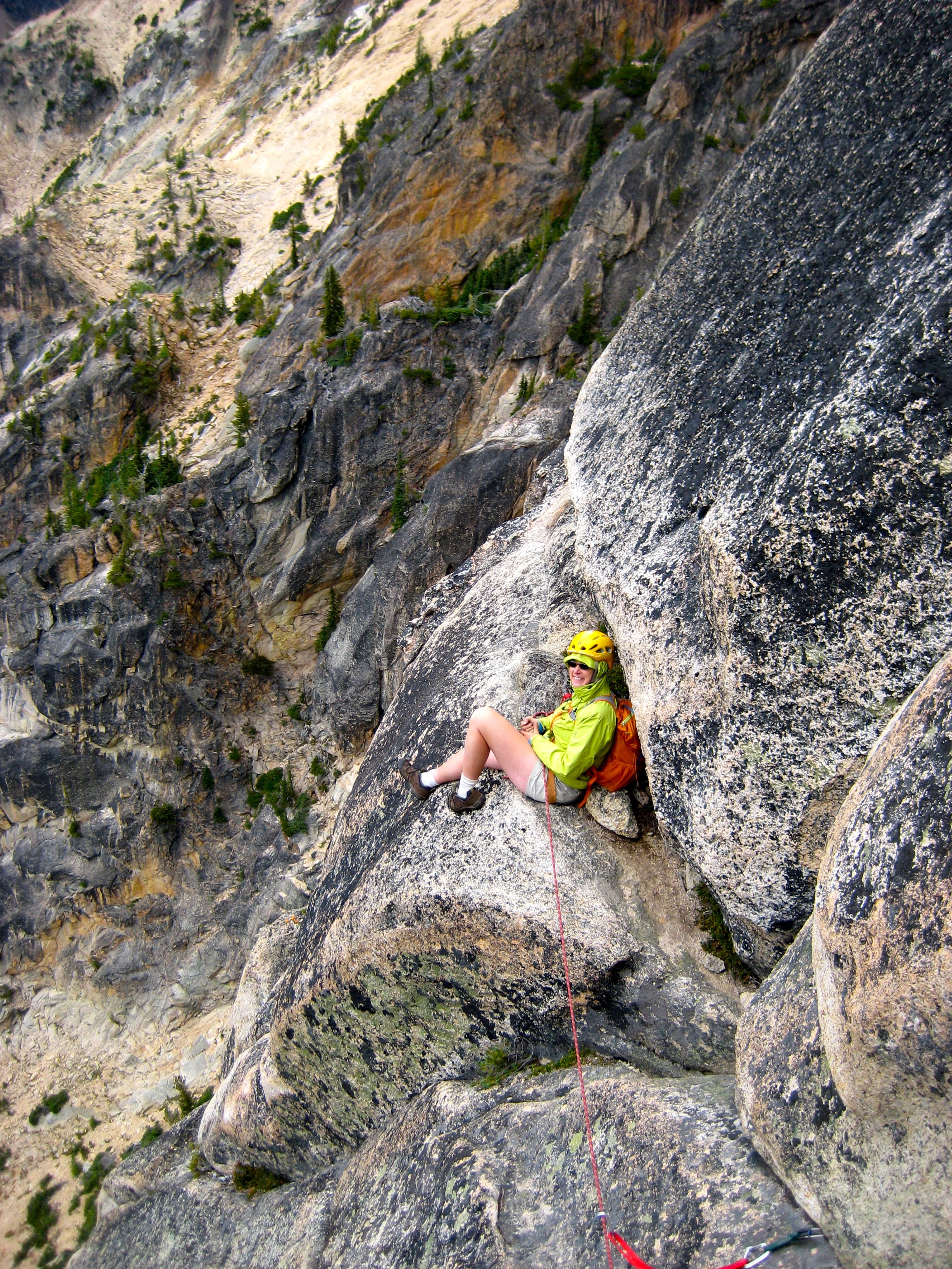 Once we found the three-bolt anchor station, it was time to rope in for a white-knuckle rappel over a sharp lip and down the vertical face. This hairy rappel was the mental crux of the whole climb for us. It didn’t help that one strand of rope got blown into a crack 50 feet off the descent line, requiring a dicey detour to pull it loose. Our 50-meter rope just barely reached the next rappel station, from which one more full-length rap got us to some down-climbable terrain above the high notch.