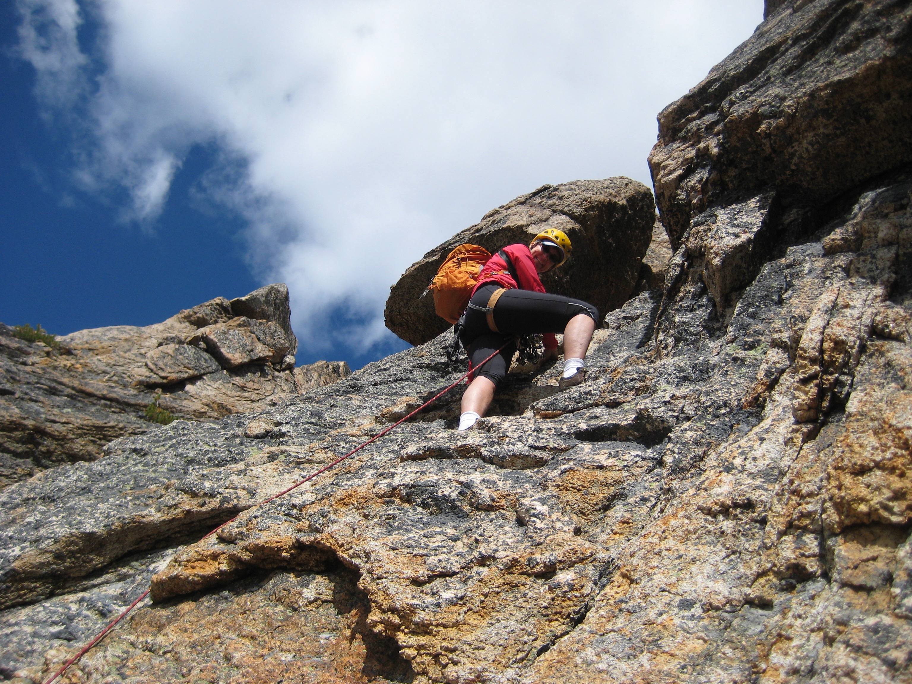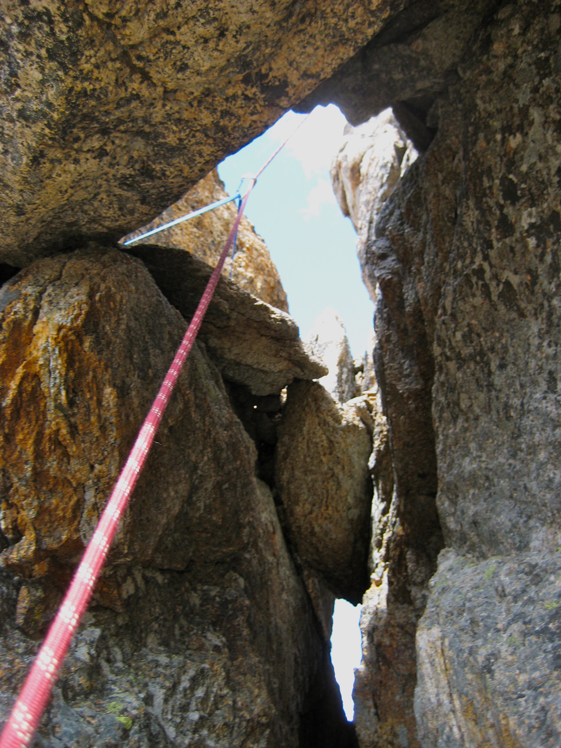 We roped up below a large chockstone and climbed through a nifty cannonhole at the gully’s head. A short pitch of Class 4-5 rock led past a rappel station and over to the eastern side of the ridge.