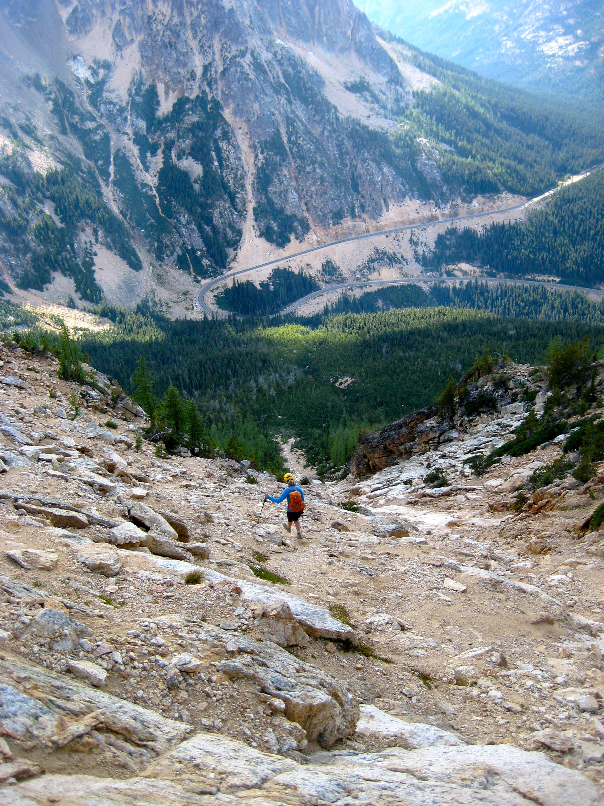 After two rappels, we were below the chockstone and ready to descend. Rather than retracing our up-route back to the southerly gully, we tried dropping straight down a northerly gully that pointed toward the SR-20 hairpin. This actually went pretty well, and we arrived at our car by early evening (3.3 hours from summit).