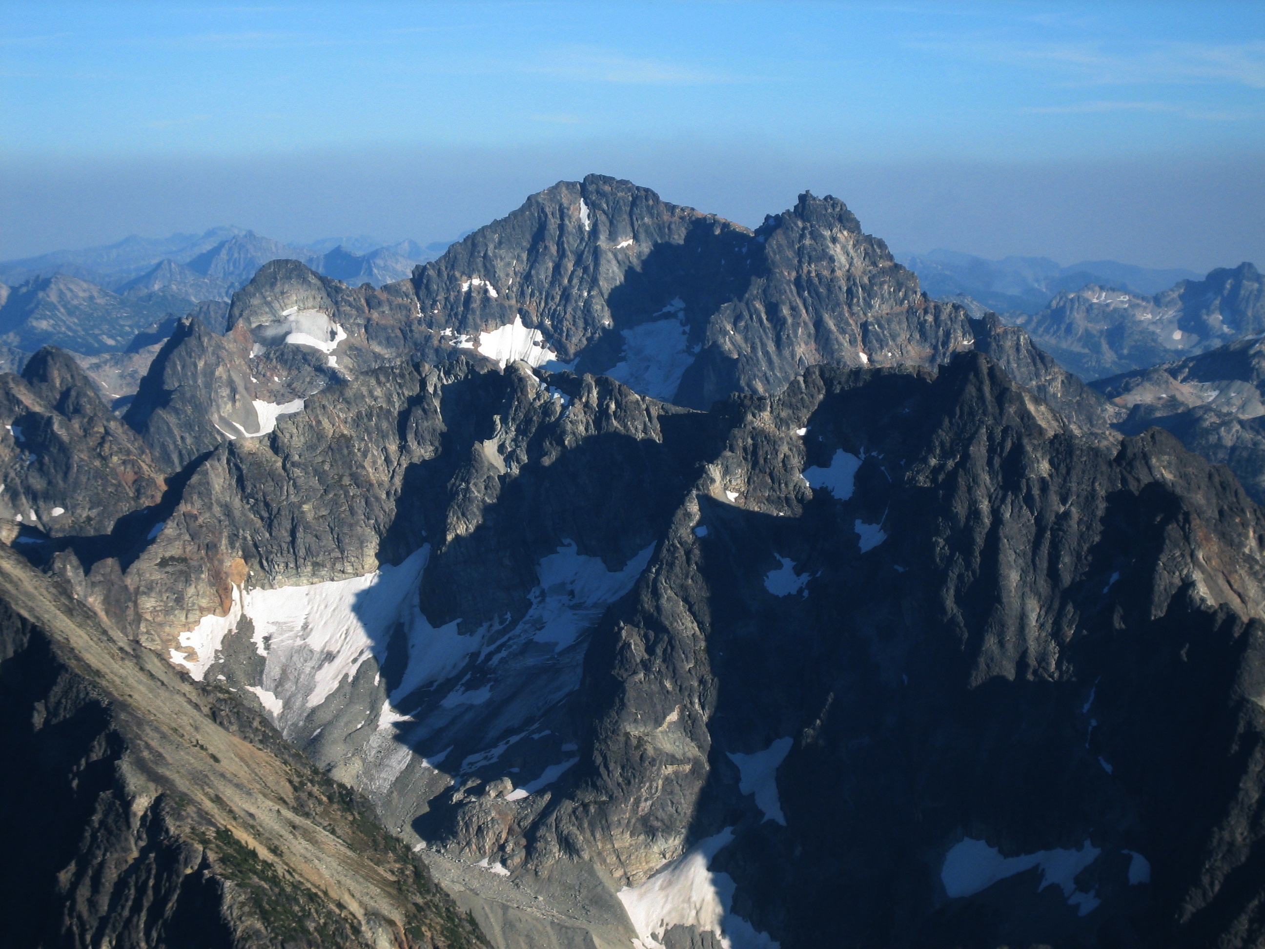 I did a weekend climb of Katsuk Peak on Ragged Ridge with Kevin W. I’d attempted this climb on a similarly sunny August weekend last year but got only as far as Newhalem, at which point a radiator blowout sent me back to Sedro-Woolley. The $300 towing & repair bill hurt almost as much as having to spend a bluebird Saturday watching NASCAR races in a repair shop. Thankfully, there were no such automotive dramatics this year.