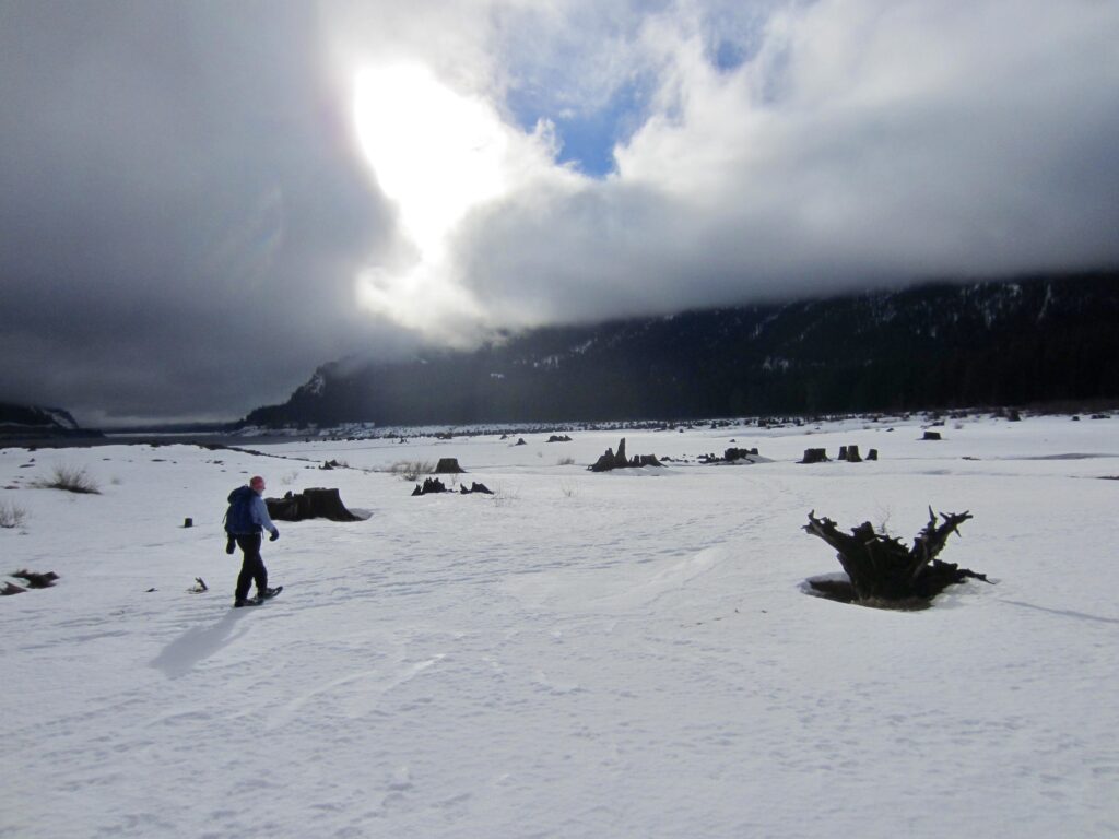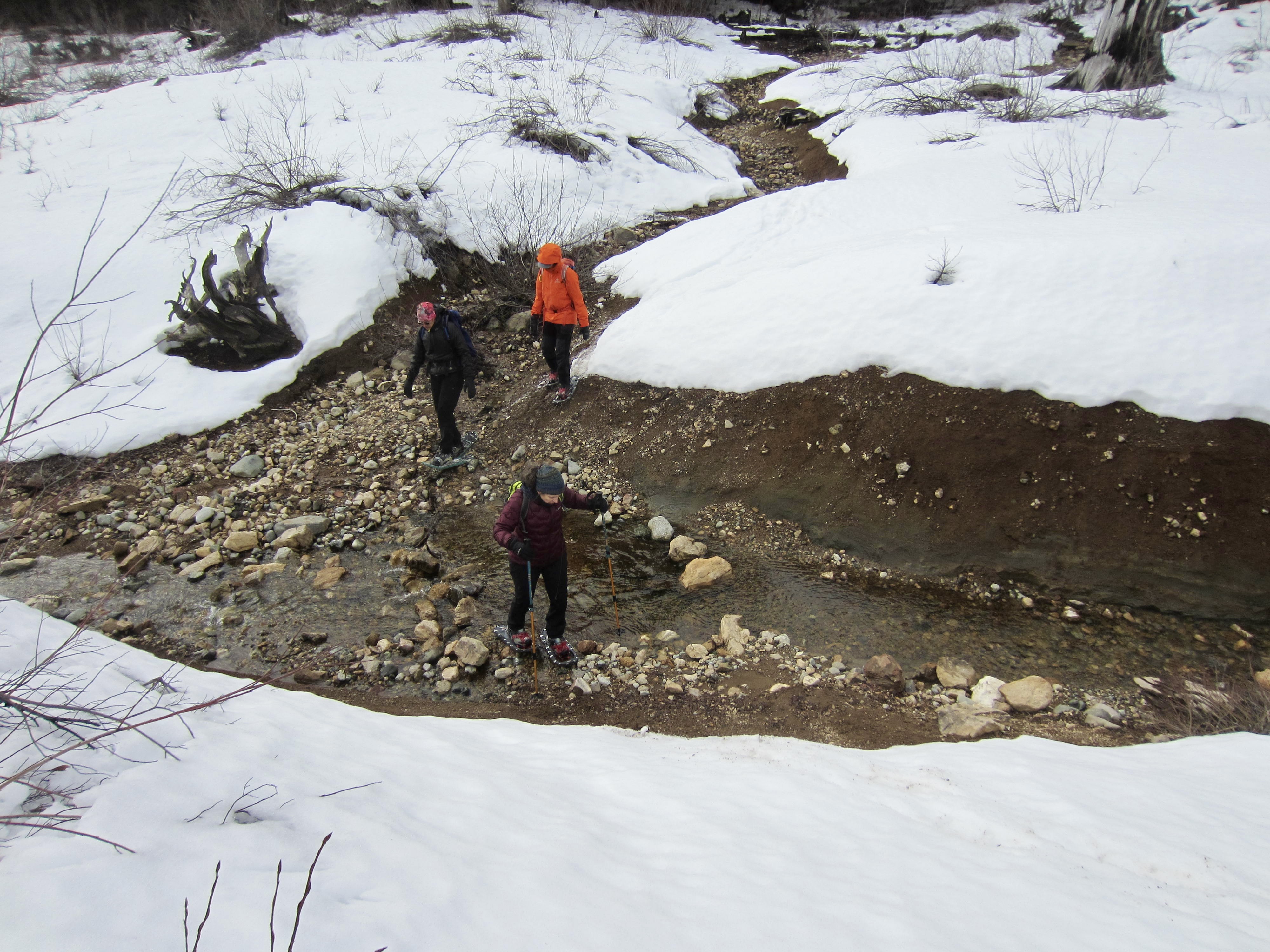 We continued our snowshoe trek by turning right and walking southward across the drawdown flats. Our route took us over several melted-out stream channels, most of which were fairly narrow and had only a few inches of water. However, Mill Creek was considerably wider and deeper, so it required some careful rock-hopping while wearing snowshoes.