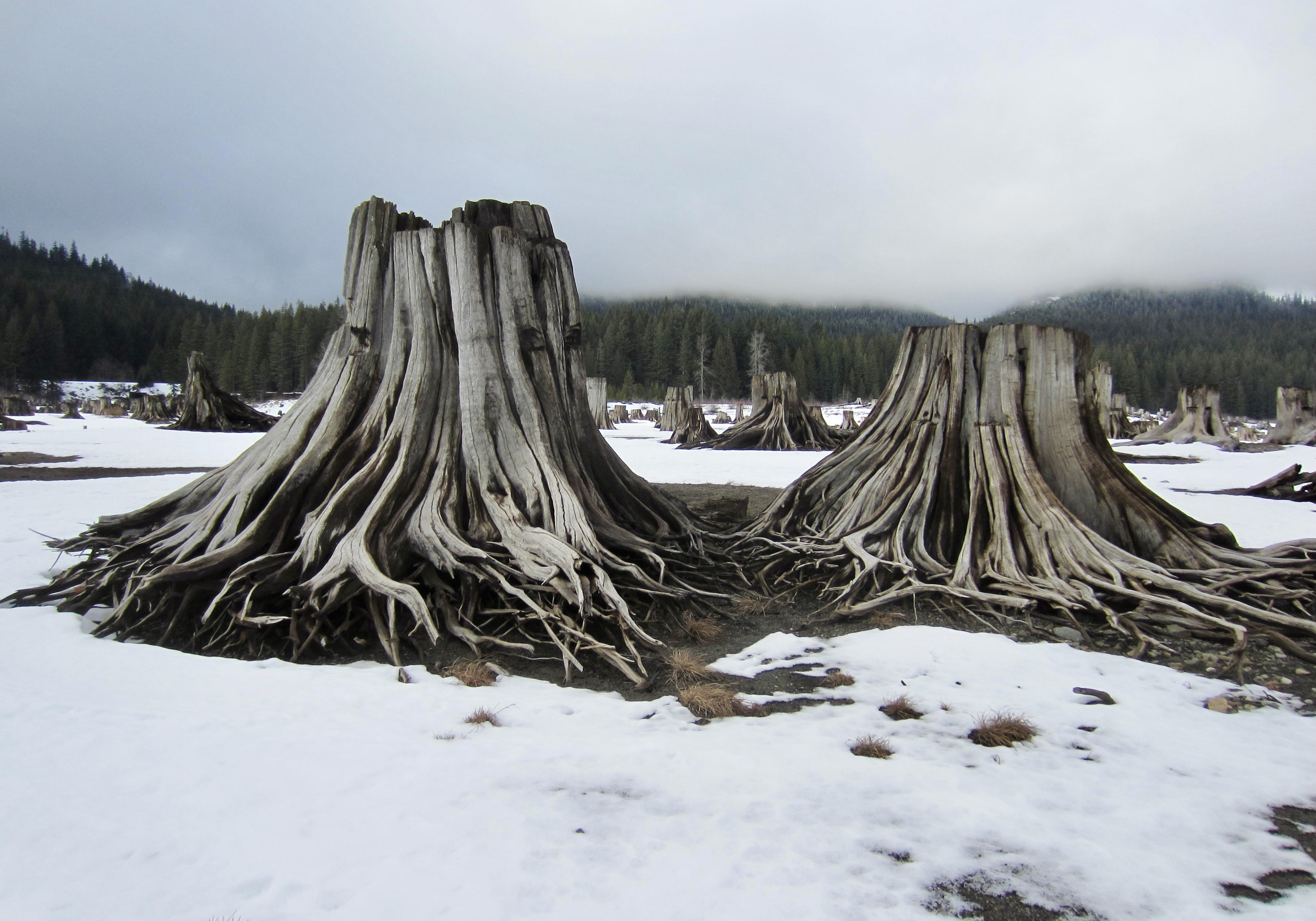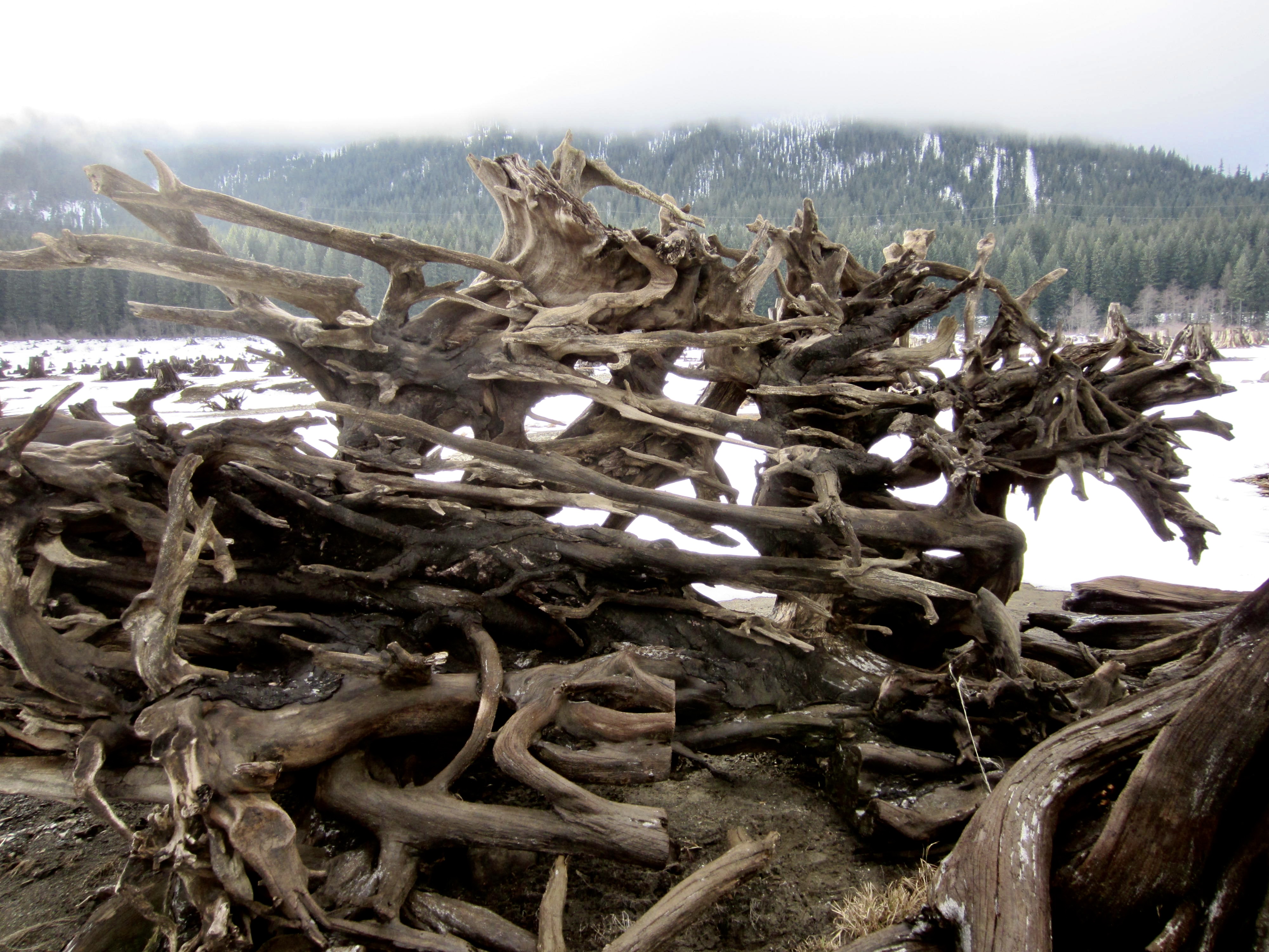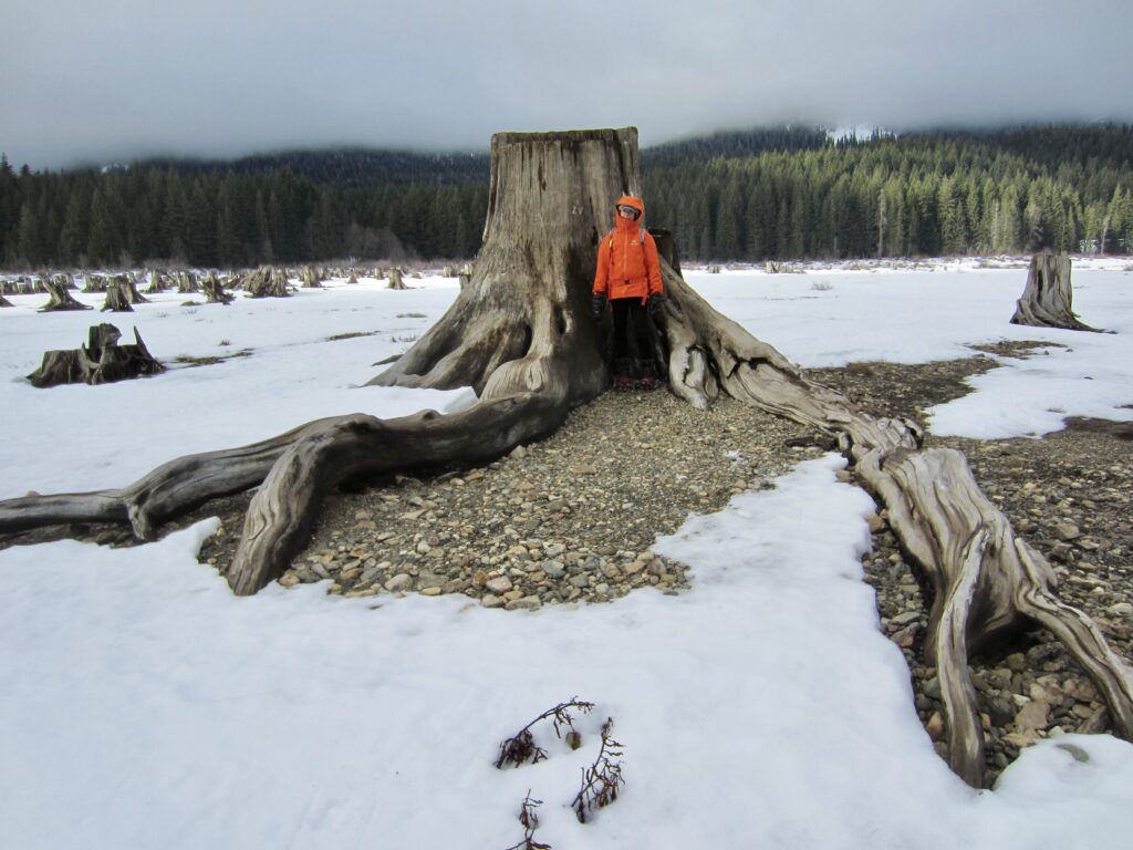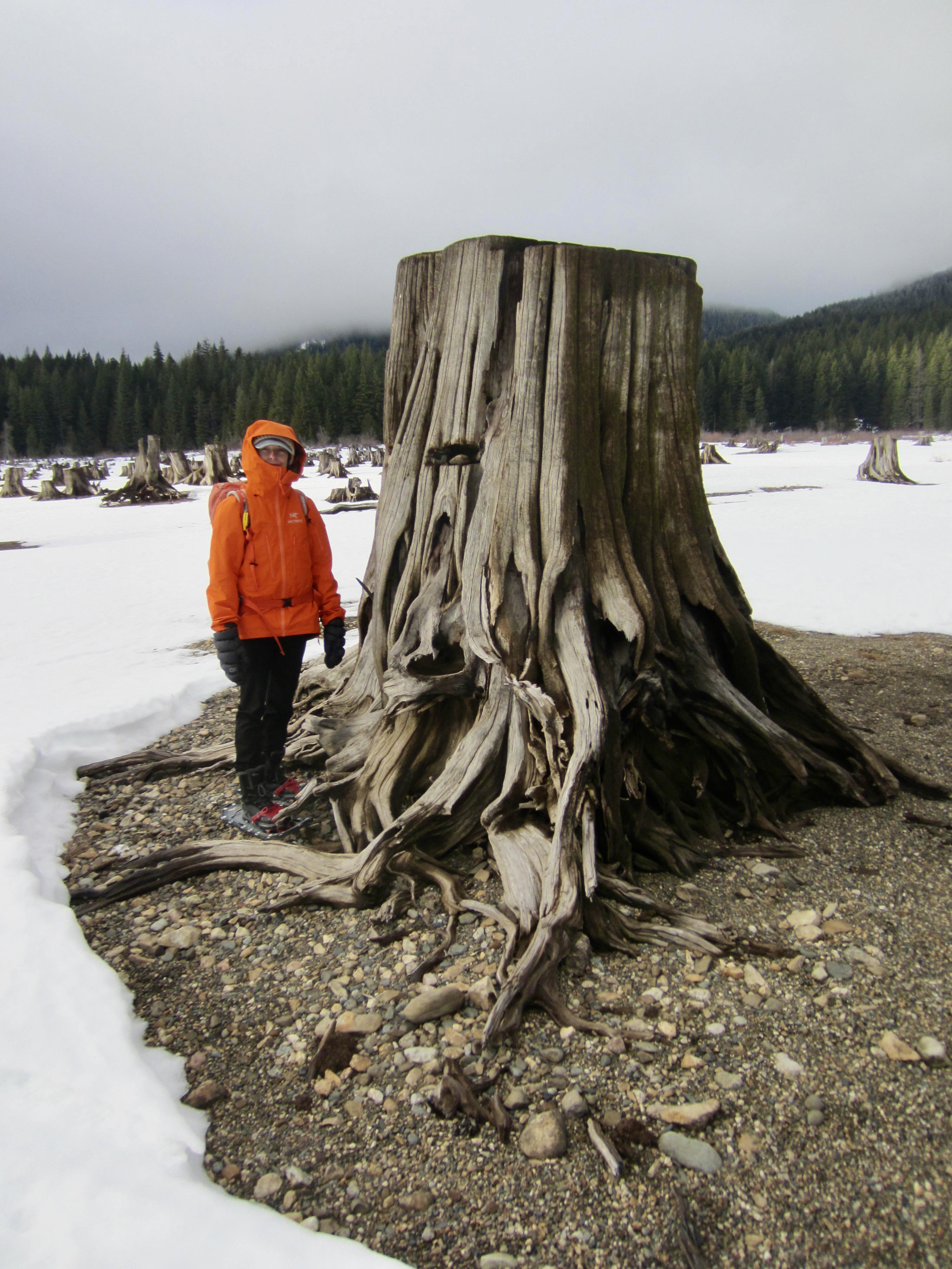 For the next hour, we wandered through Keechelus Lake Flats and marveled at the old-growth tree trunks. Having been seasonally submerged for over a century, these stumps are now stripped clean of all bark and surrounding regolith, thereby leaving their roots and cores fully exposed.