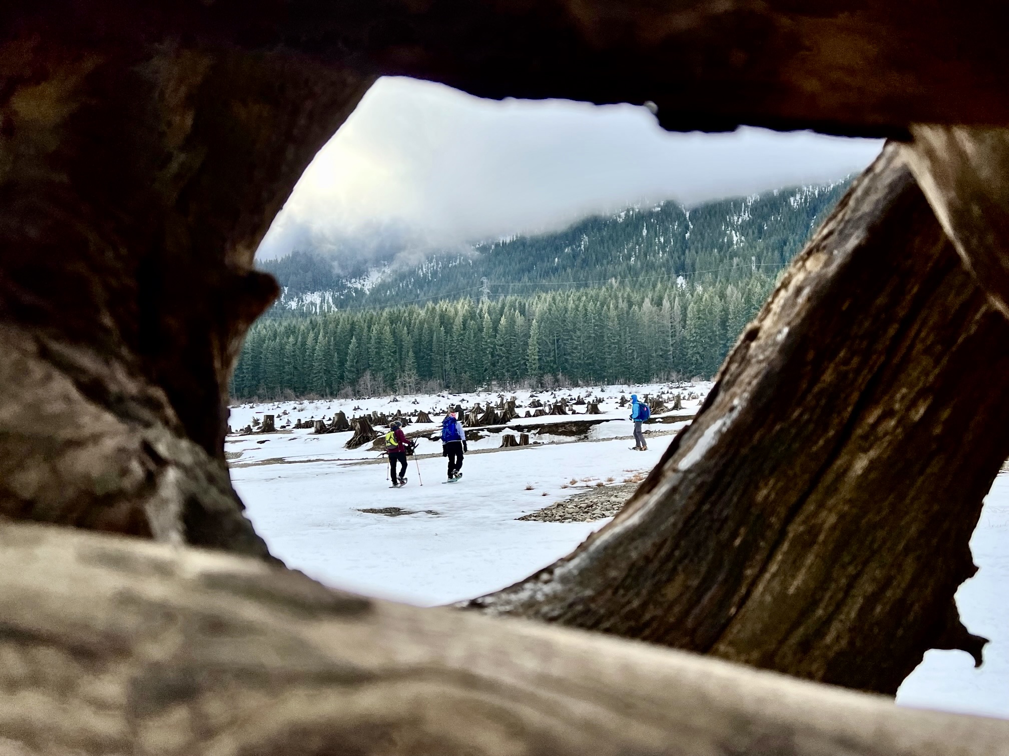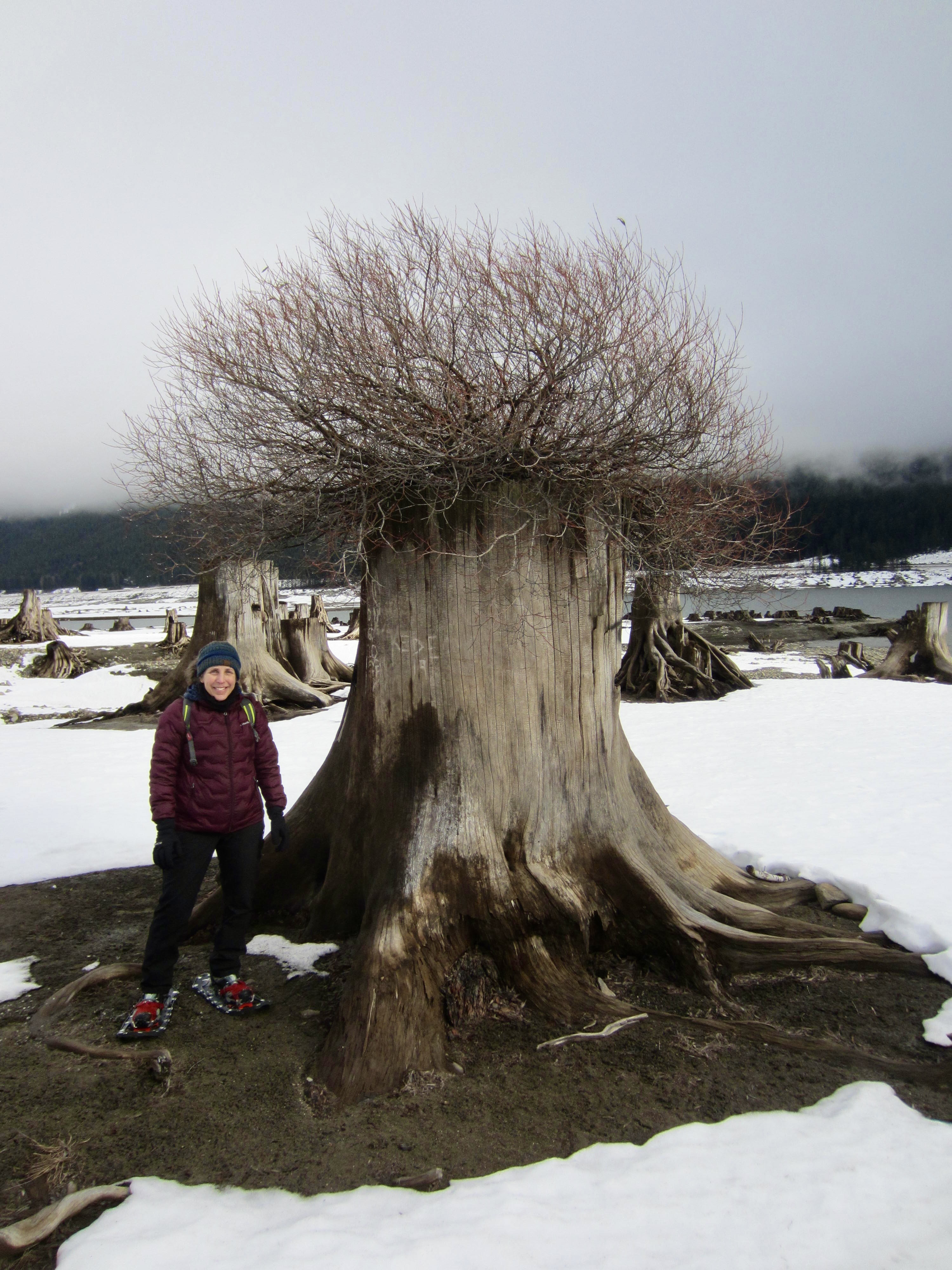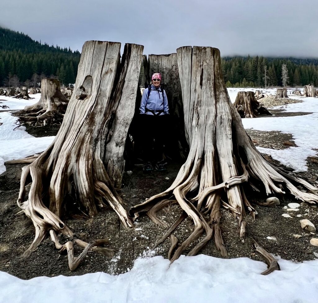 For the next hour, we wandered through Keechelus Lake Flats and marveled at the old-growth tree trunks. Having been seasonally submerged for over a century, these stumps are now stripped clean of all bark and surrounding regolith, thereby leaving their roots and cores fully exposed.