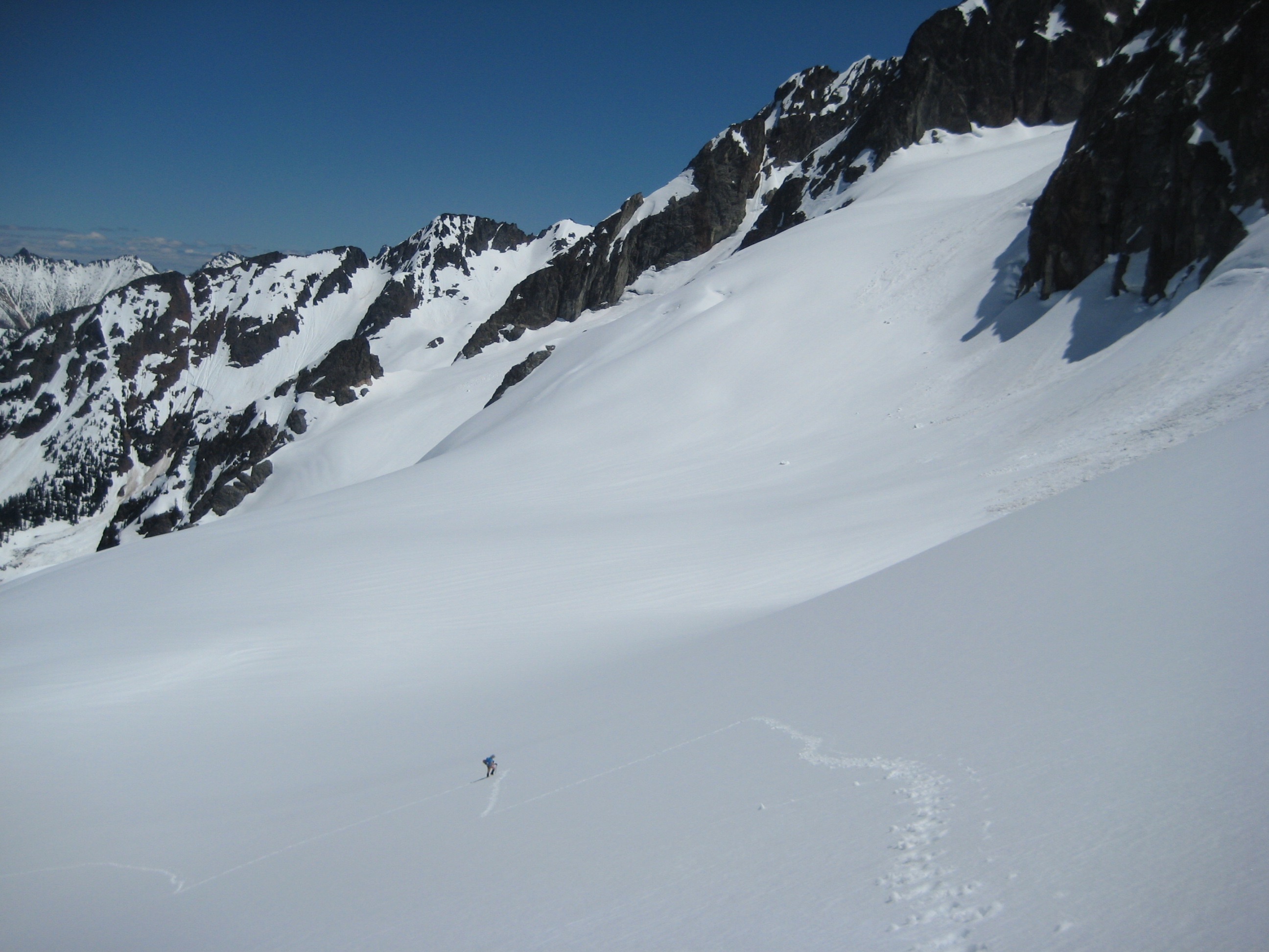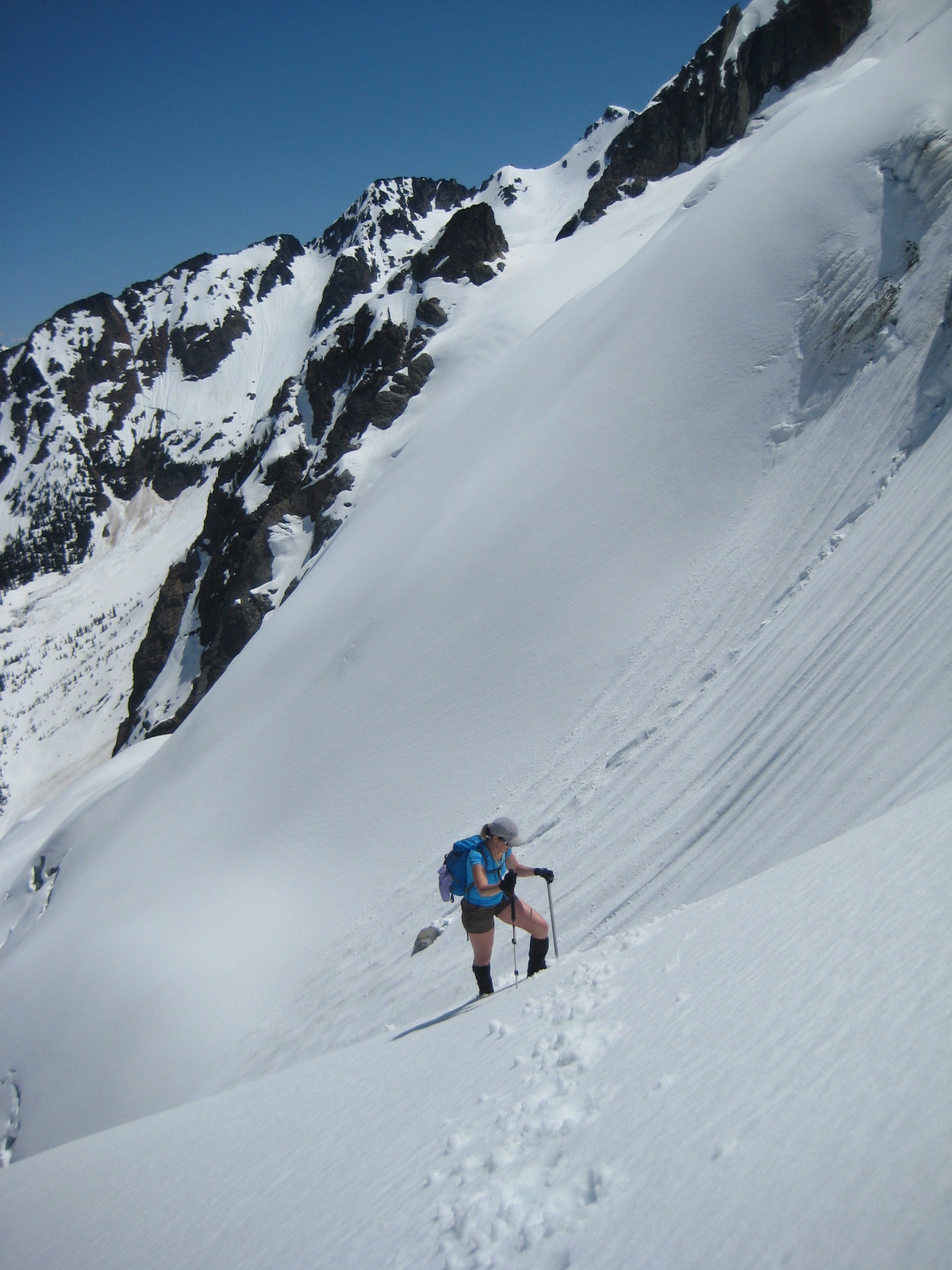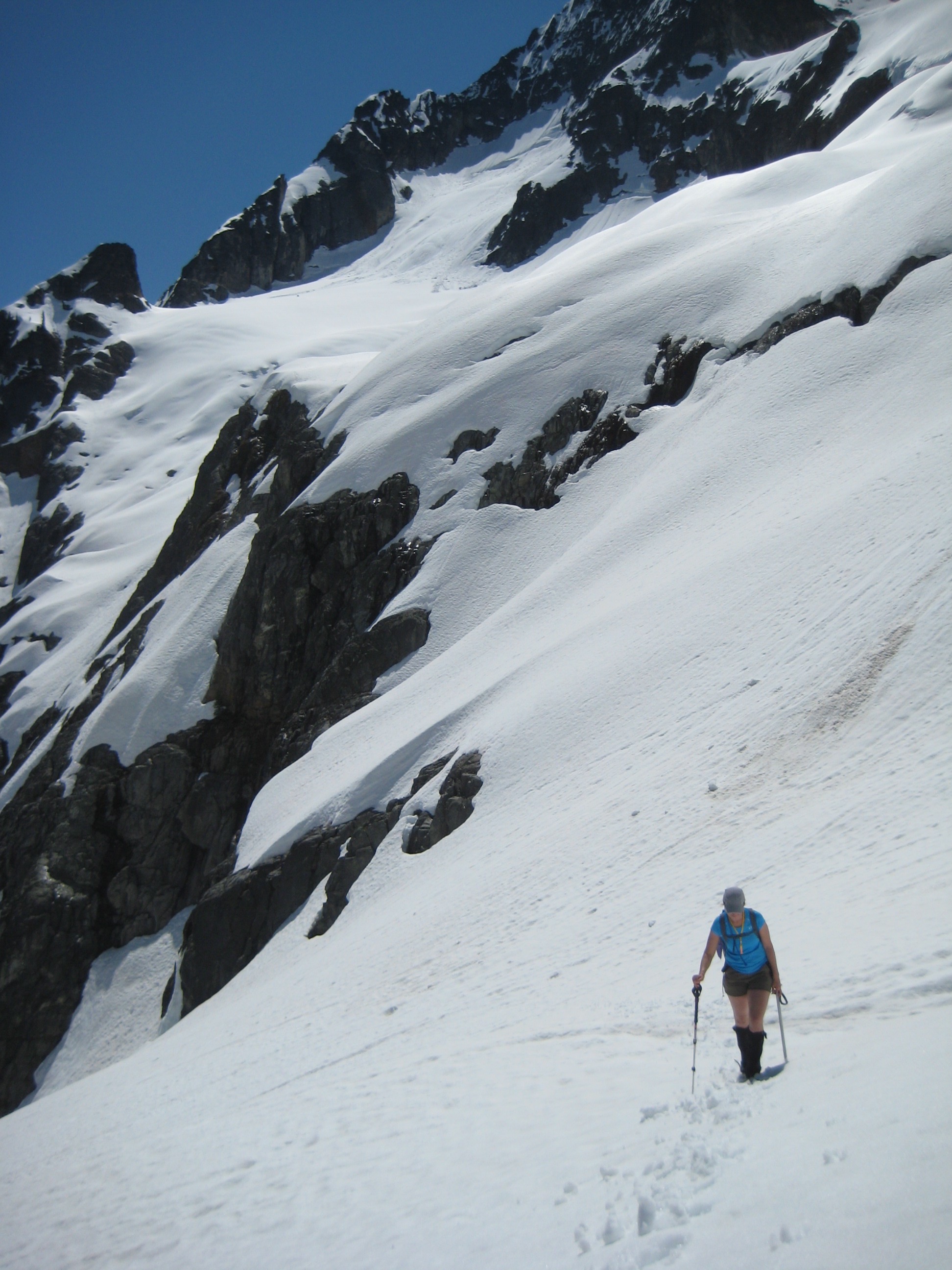 The day dawned clear and cool, just as promised. We had a leisurely breakfast in hopes of letting the Mesahchie Glacier soften slightly (on a gamble, we left crampons at home). The snow didn’t really soften much by 8:00am, but most of it was perfect “styrofoam” anyway.