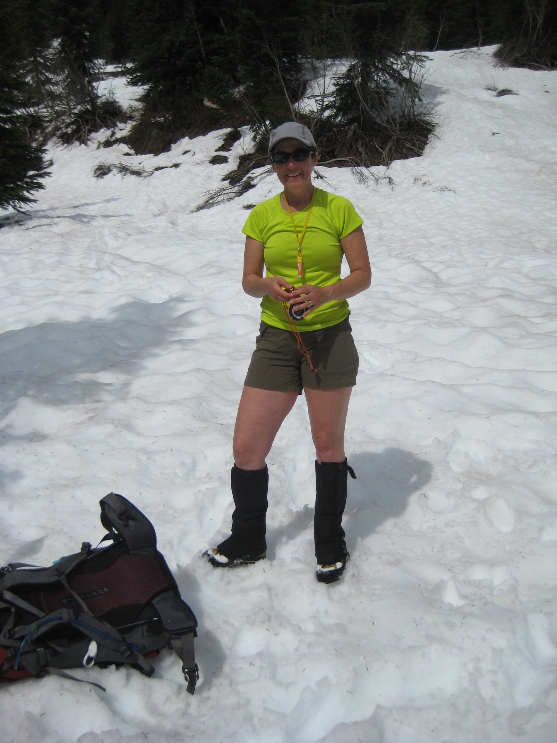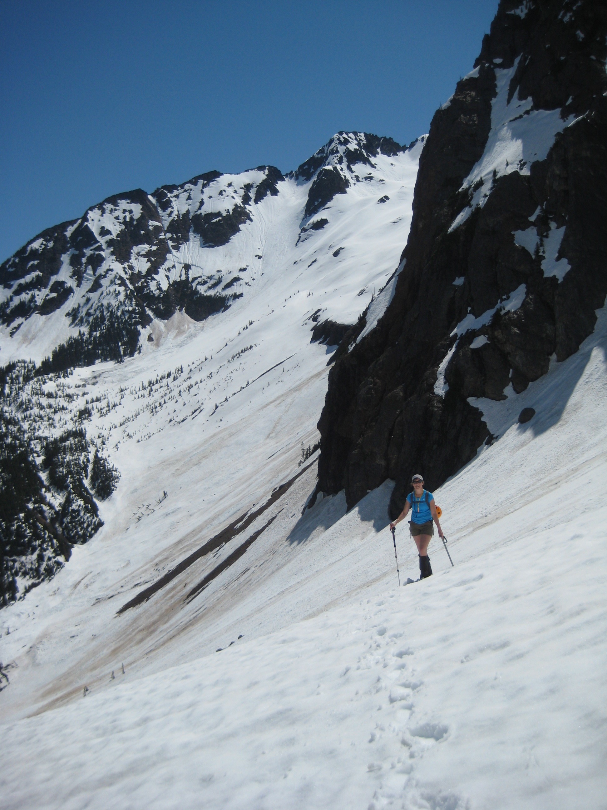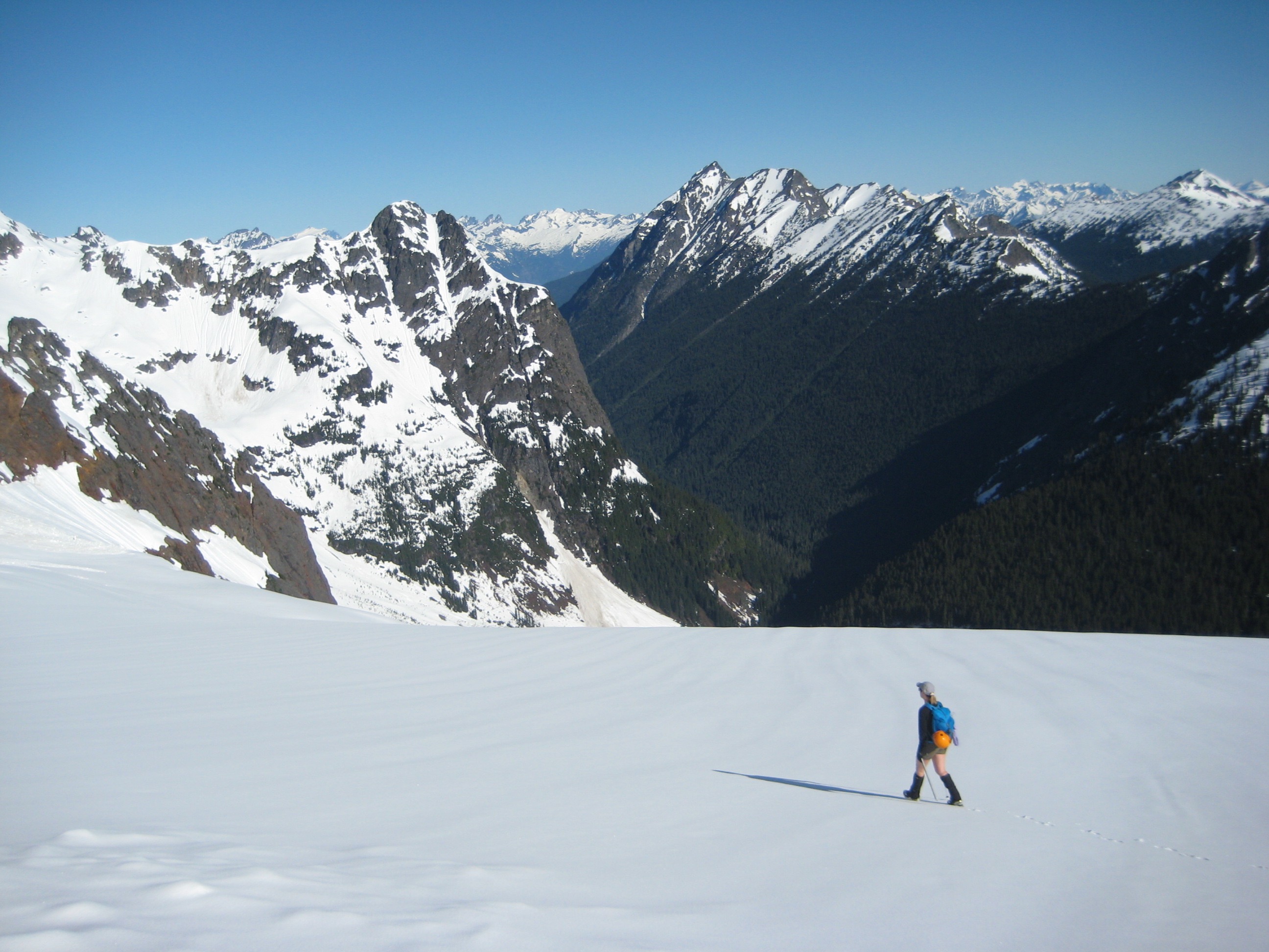 The day dawned clear and cool, just as promised. We had a leisurely breakfast in hopes of letting the Mesahchie Glacier soften slightly (on a gamble, we left crampons at home). The snow didn’t really soften much by 8:00am, but most of it was perfect “styrofoam” anyway.