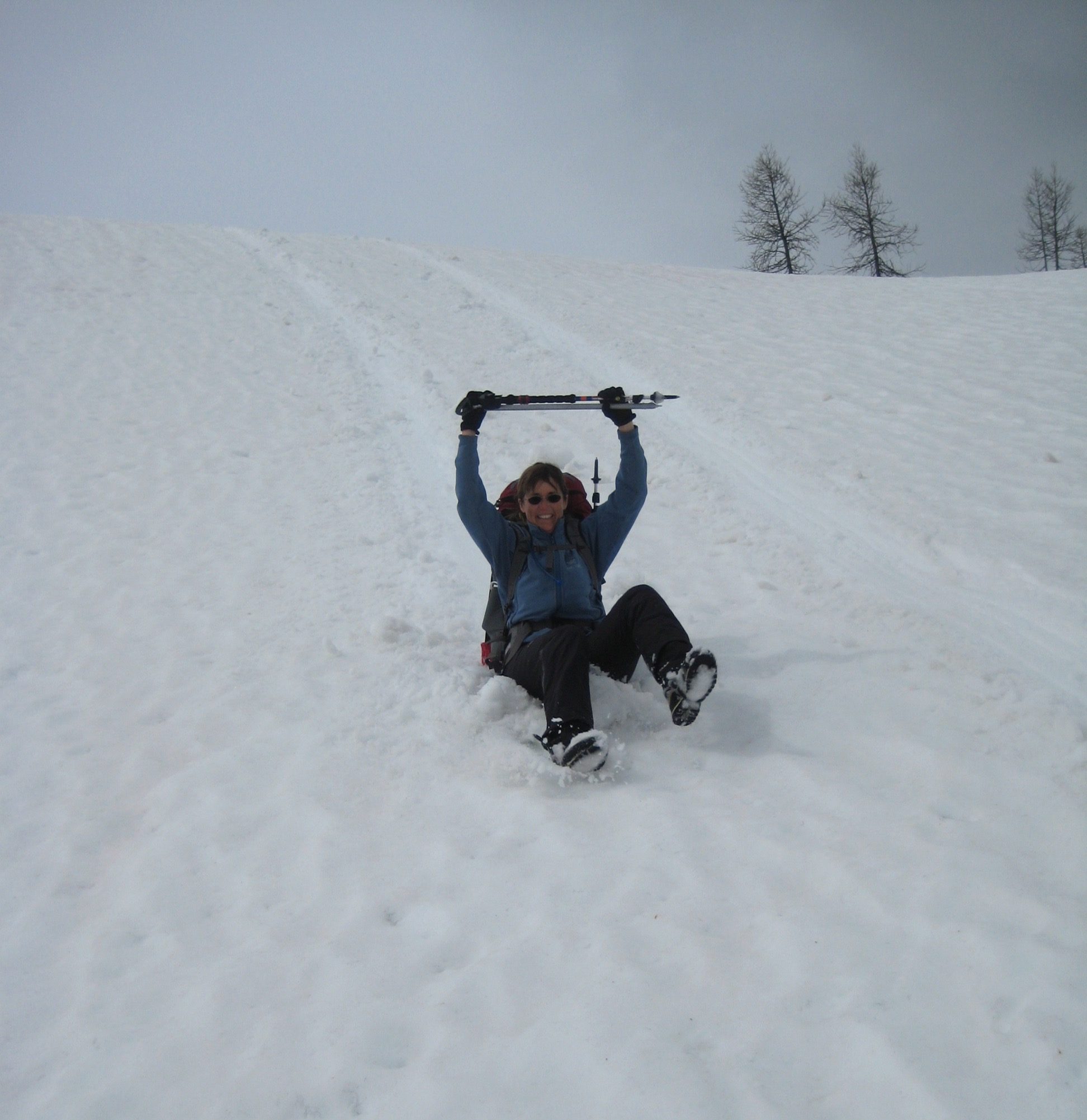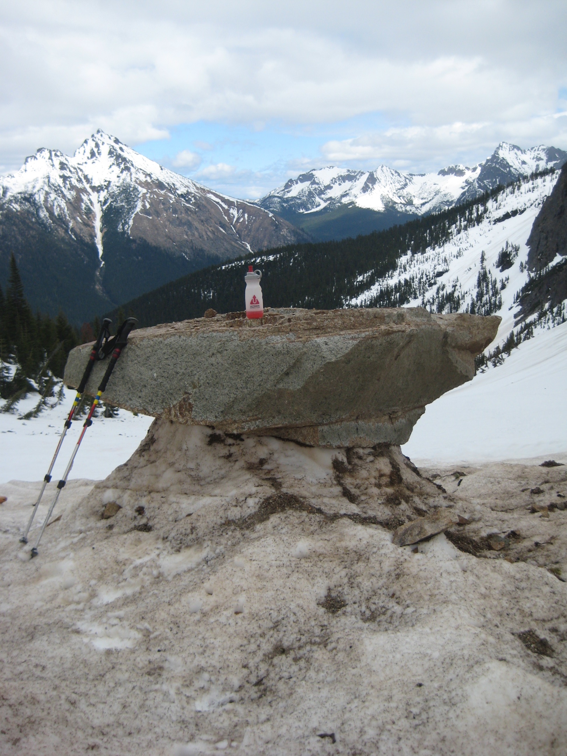 Under gray skies, we started from the Easy Pass TH shortly after noon and headed up the mostly bare trail to Easy Basin, then continued up continuous snowcover to Easy Pass (3.5 hours + 2800 feet from TH). Shortly below the pass, we encountered a textbook example of a “rock table.”