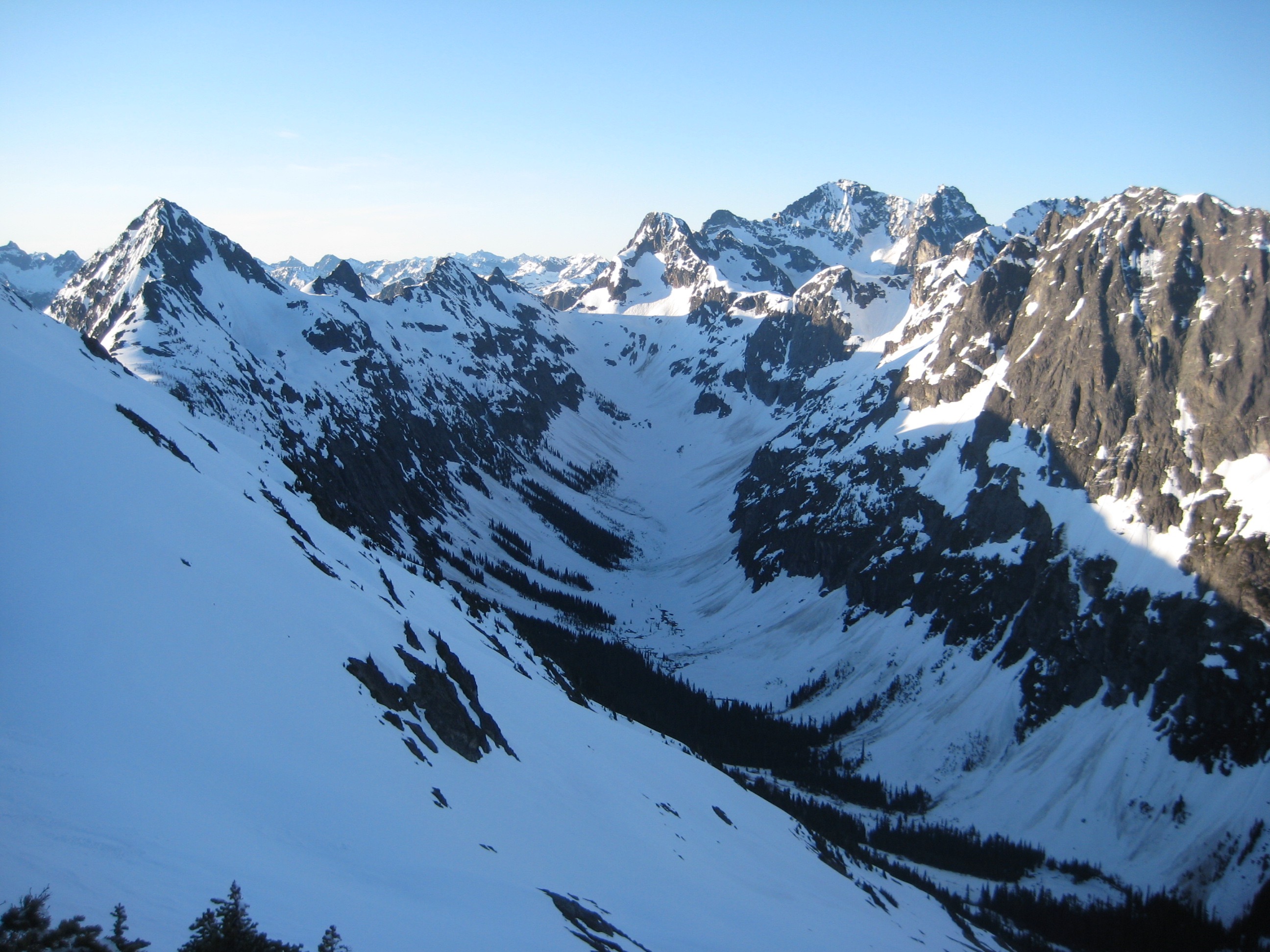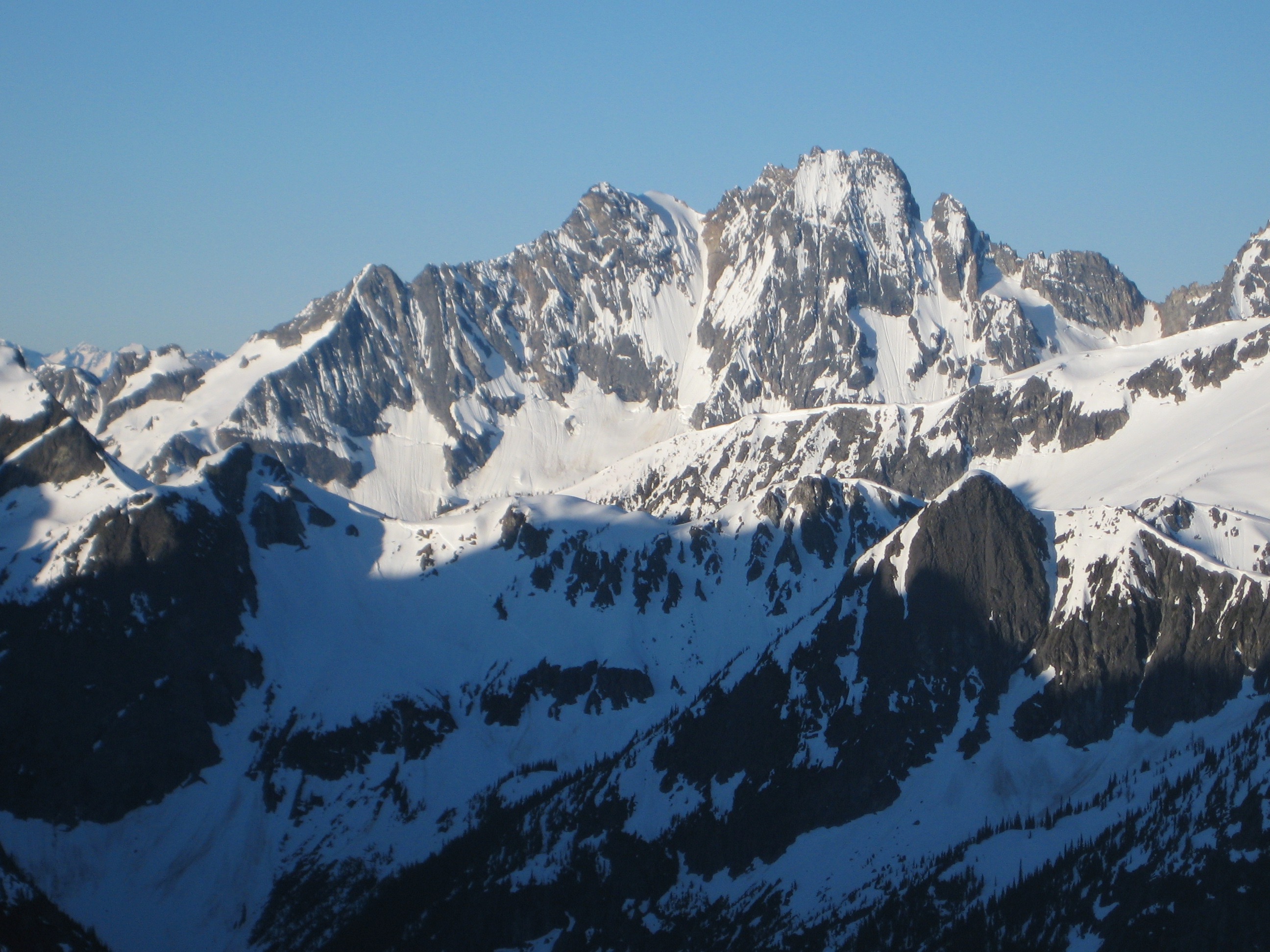 A row of sharp pinnacles on Kimtah Peak casts a shadow on Katsuk Glacier in the North Cascades
