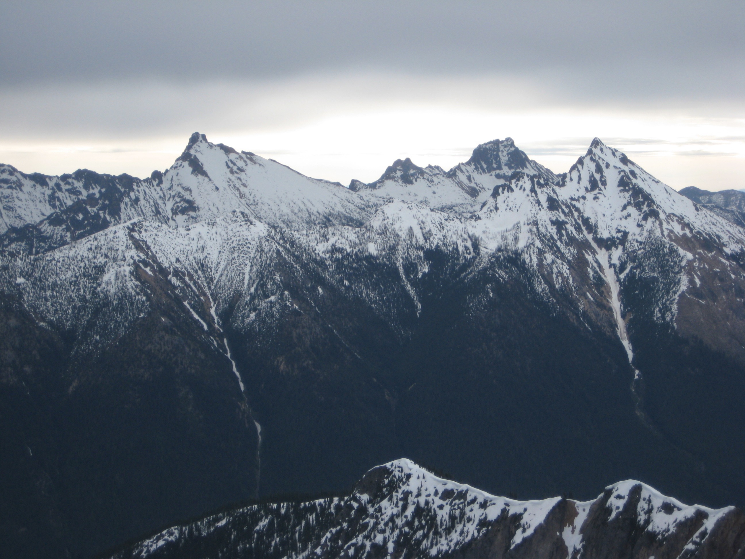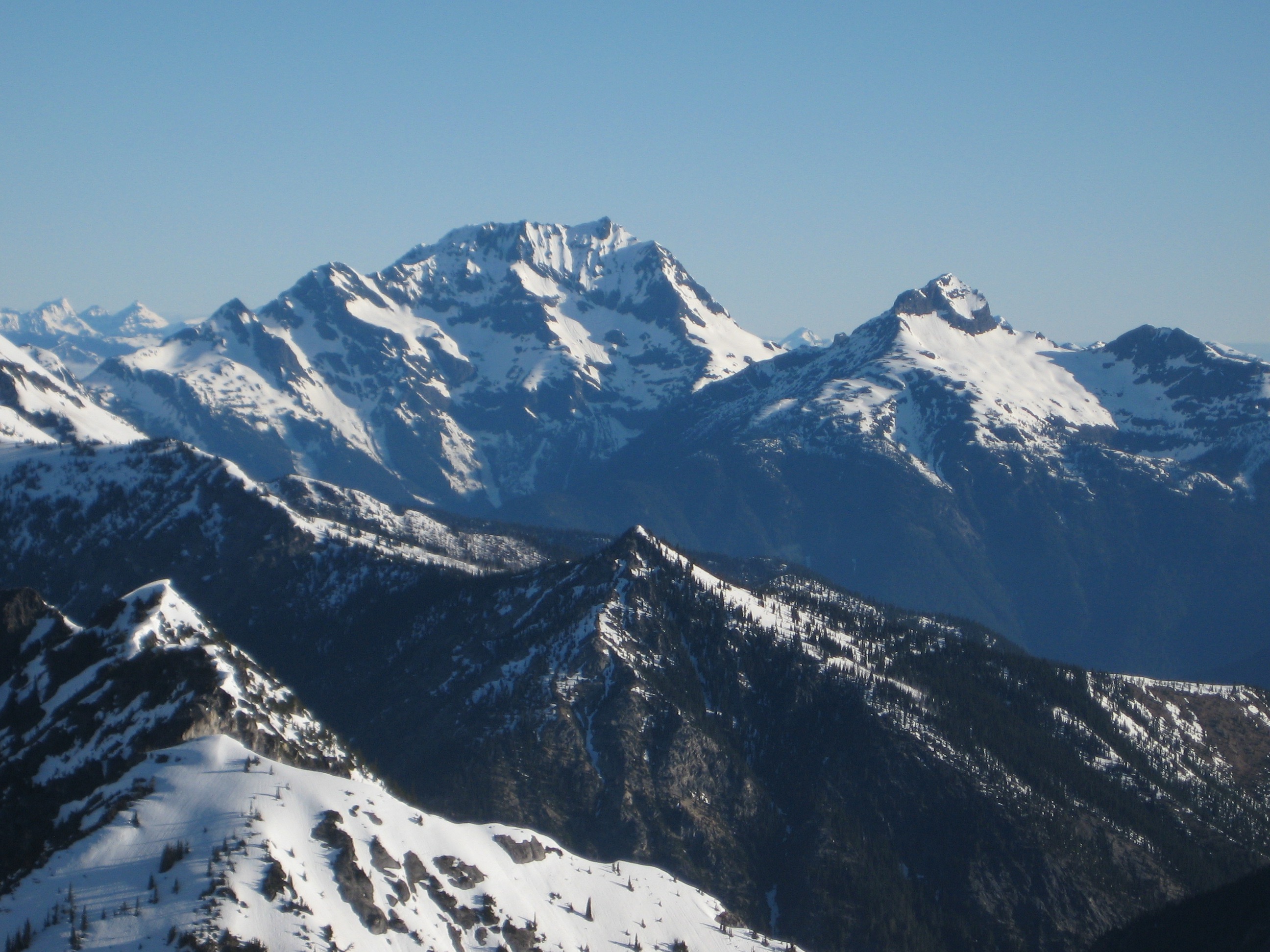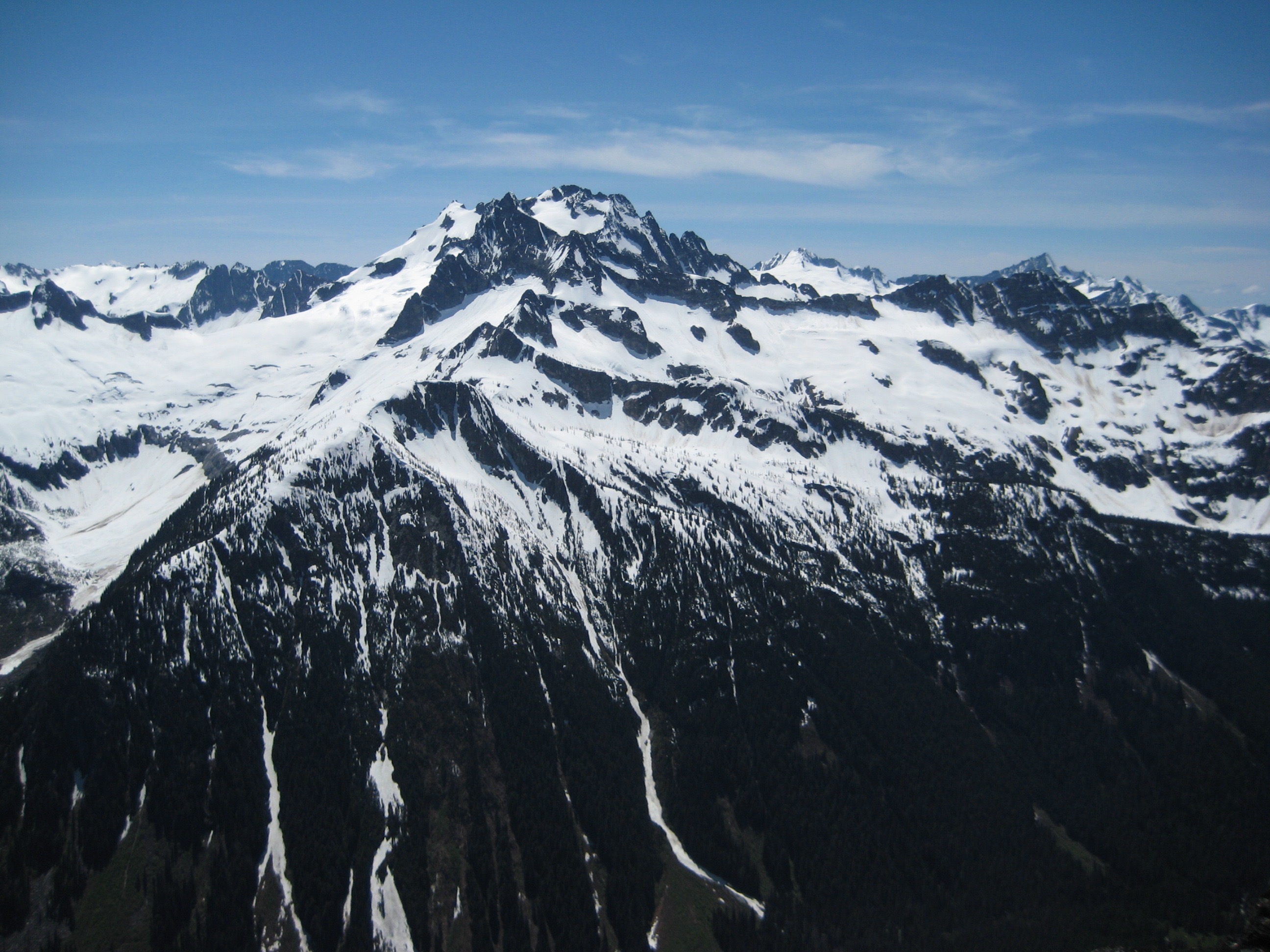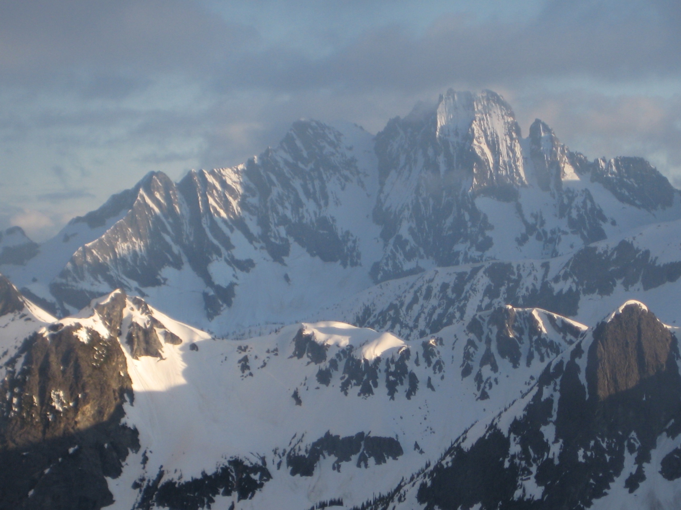 snow covered Mesahchie Peak and Mesahchie Col from Ragged Ridge in the North Cascades