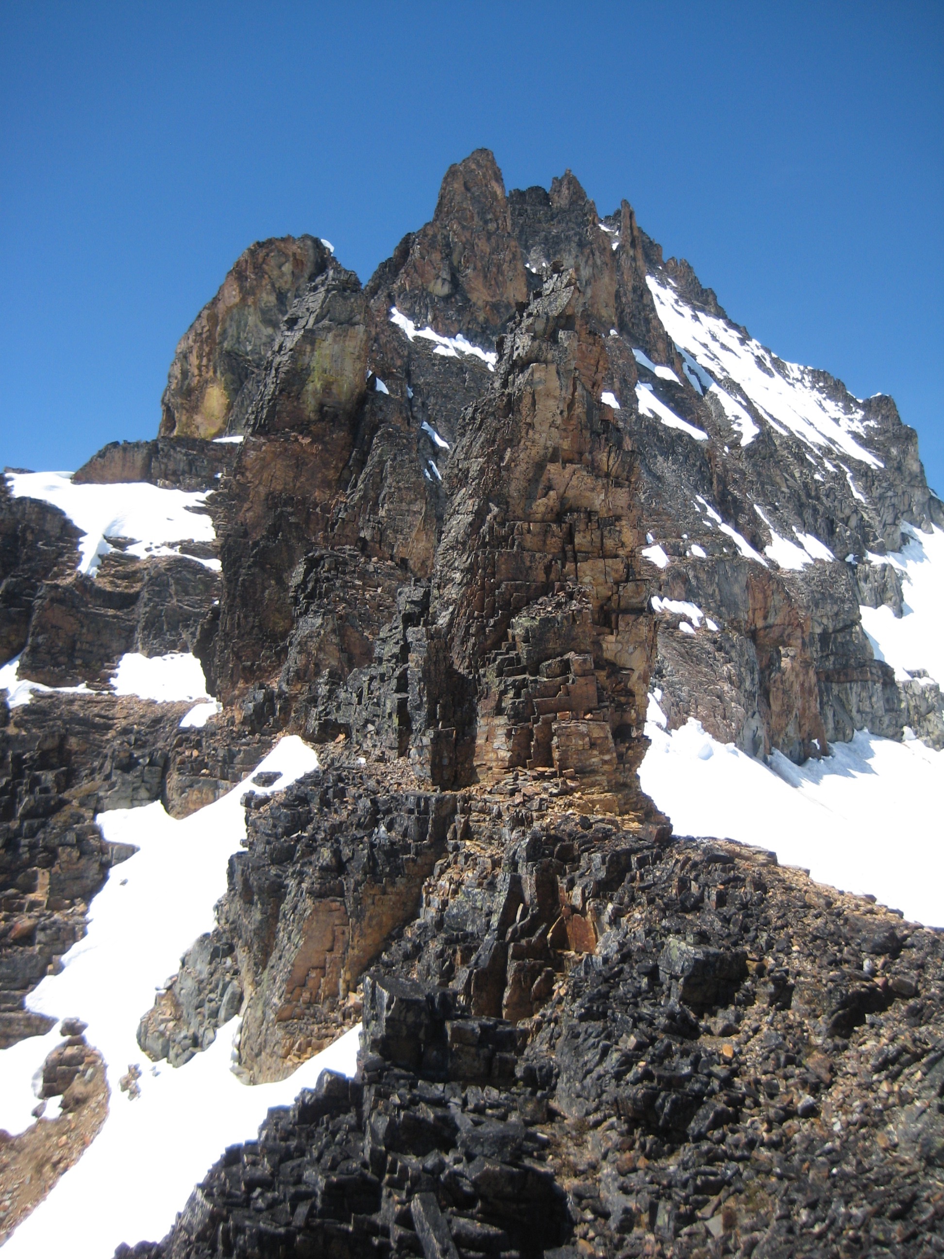 Grotesque Gendarmes with snow patches and the summit of Kimtah Peak in the North Cascades