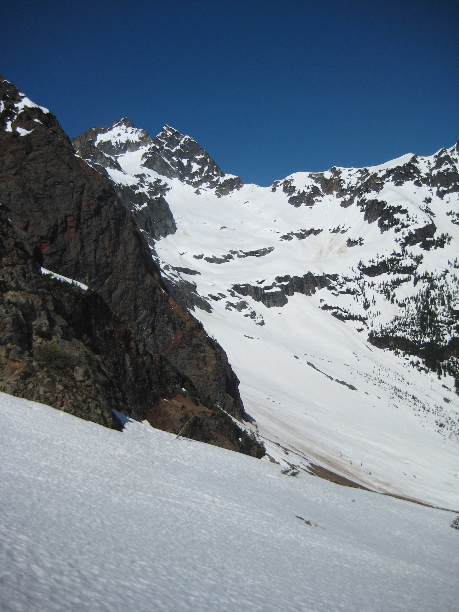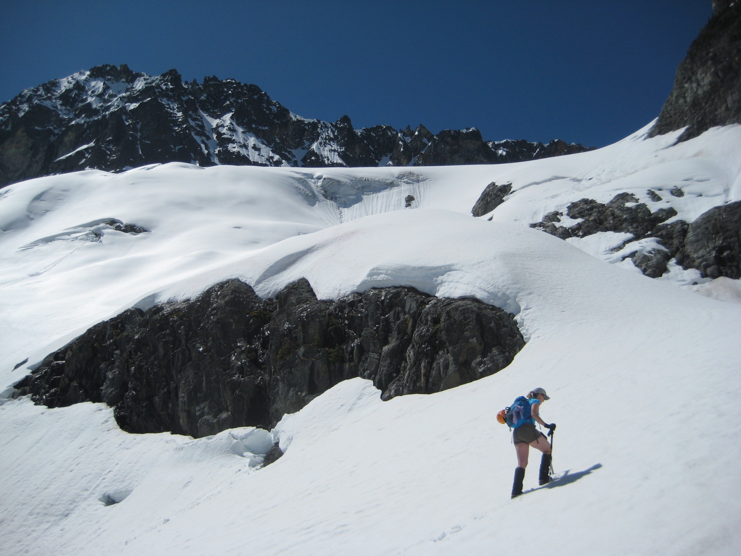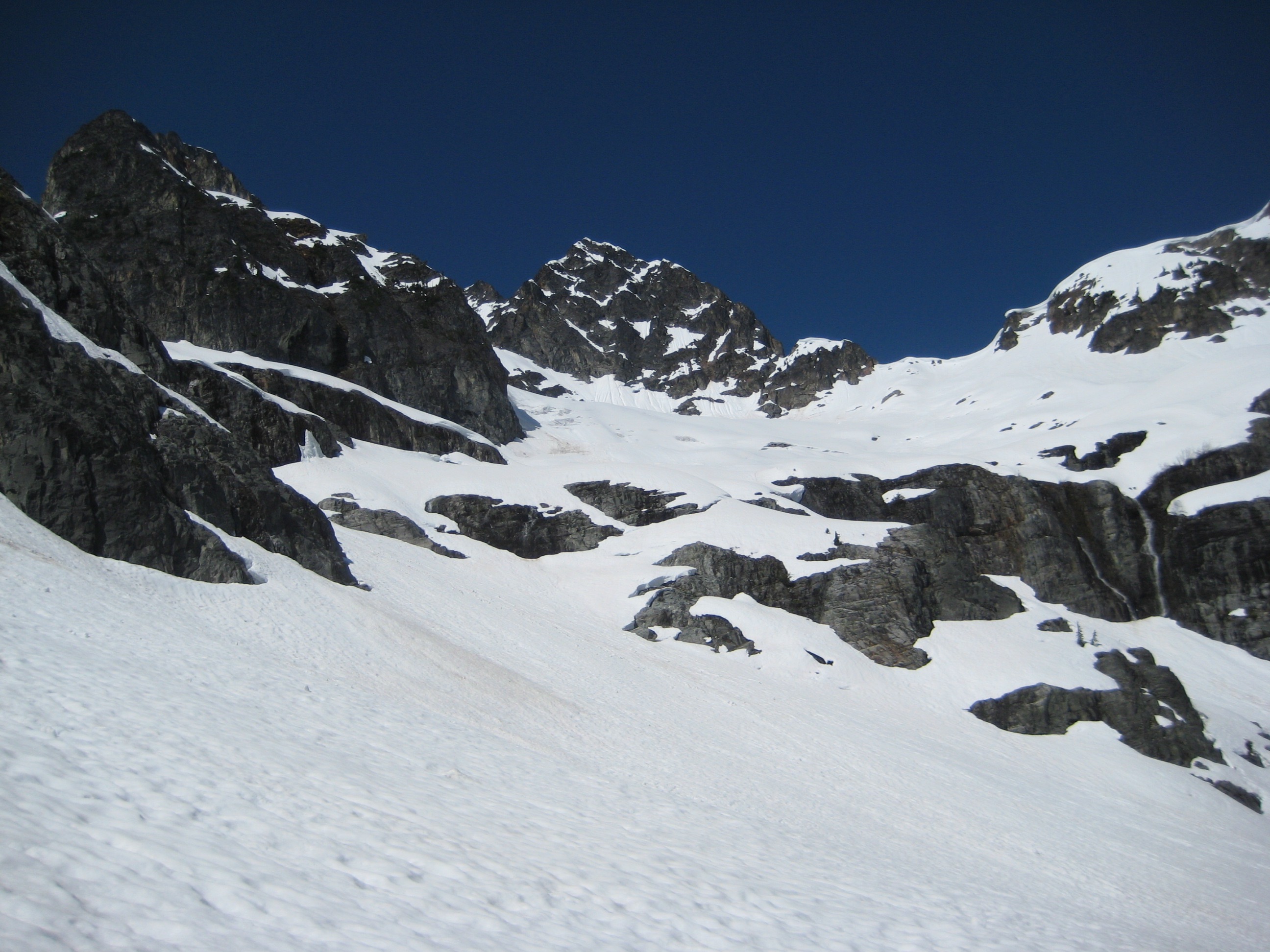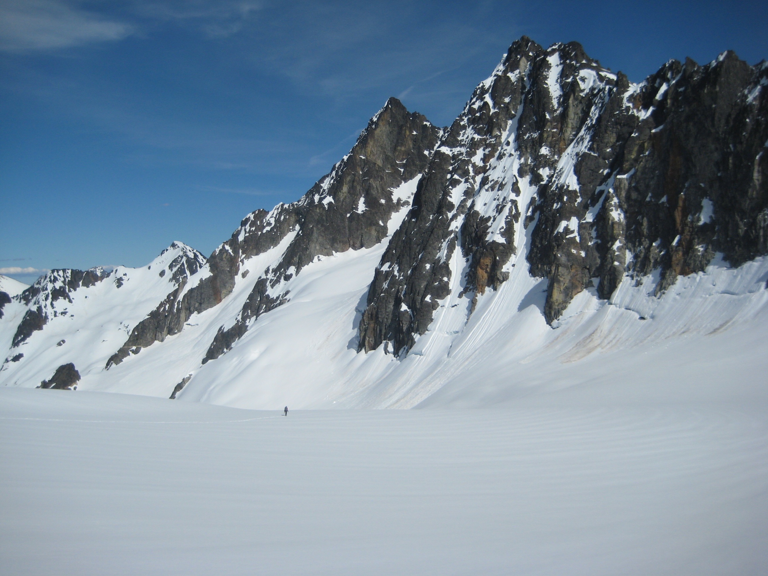 looking up glacier at Katsuk-Kimtah Notch and Grotesque Gendarmes on the Ragged Ridge in the North Cascades