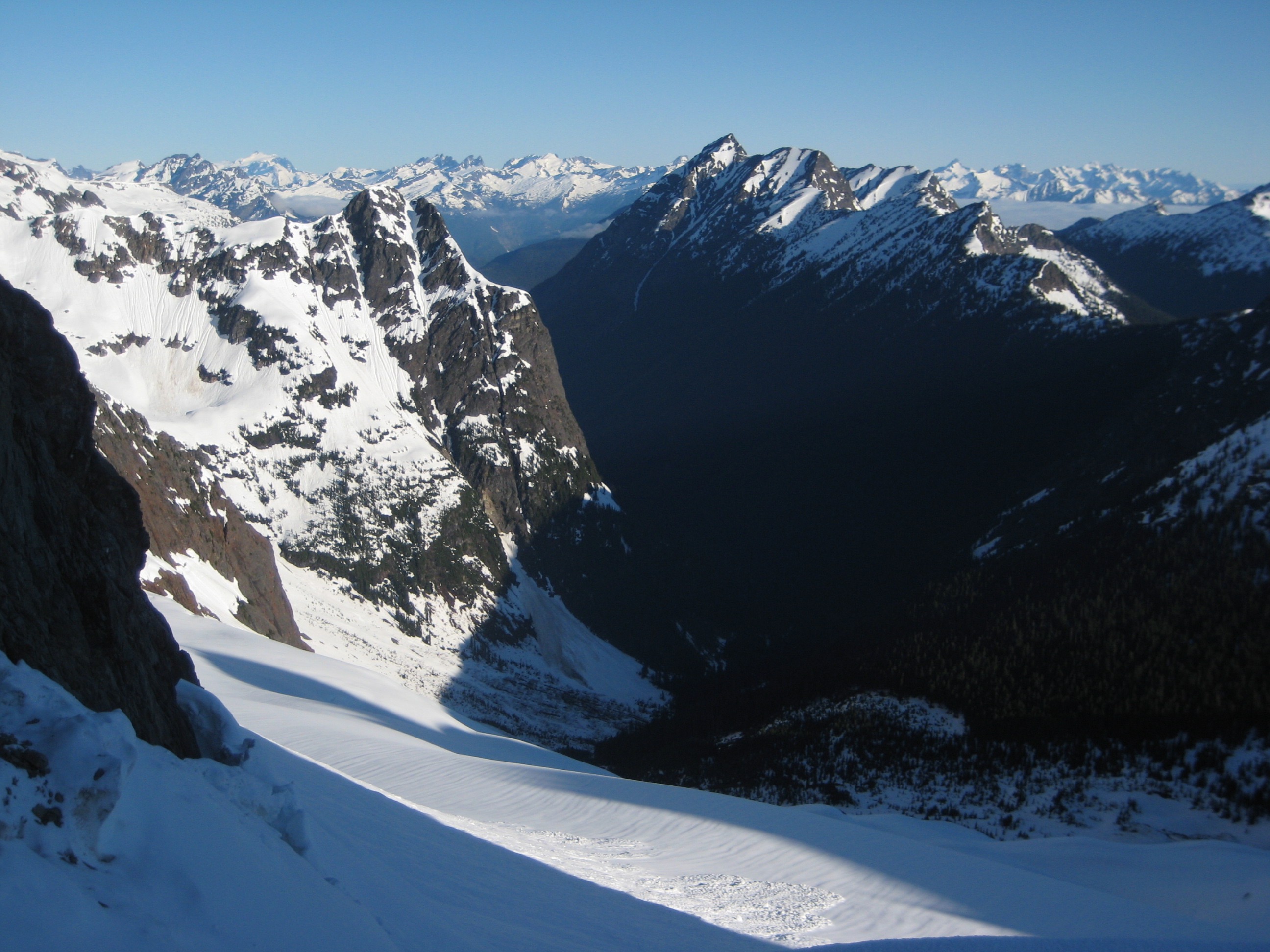 At this point, our trip shifted into the category of “exploratory,” which is a well-known climbing euphemism for “summit-skunked.” We decided to explore our way to a high (8100’) col on the NE ridge of Kimtah Peak. Beckey describes a Class 5.5 rock route starting from this high col, but Eileen and I found the 50-degree snow climb to be sufficiently exciting. We also verified that this col does NOT offer an easy route to the Kimtah Glacier; the other side is horrendously steep.