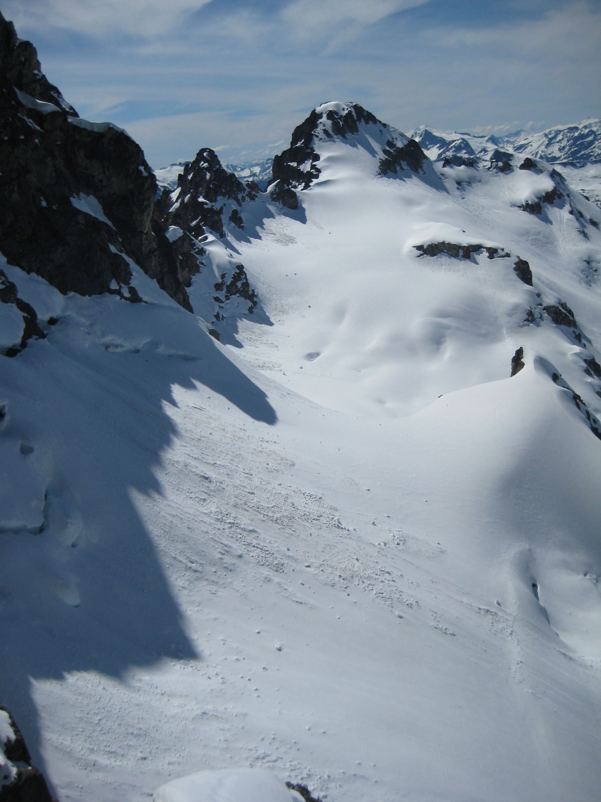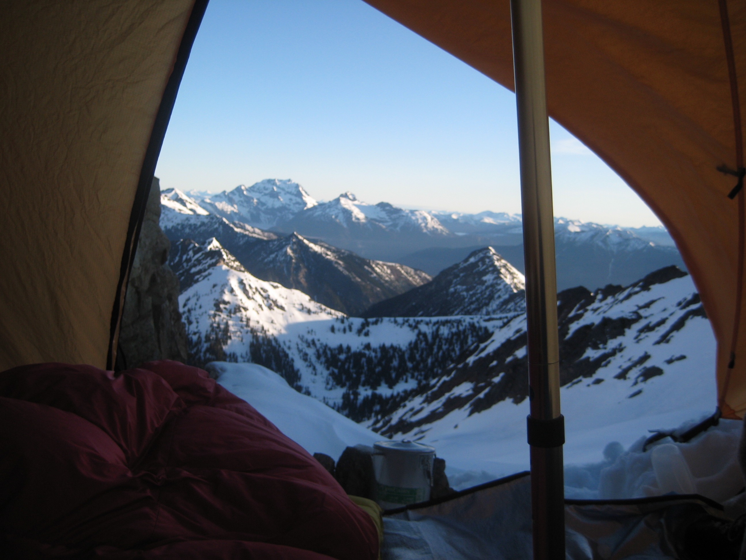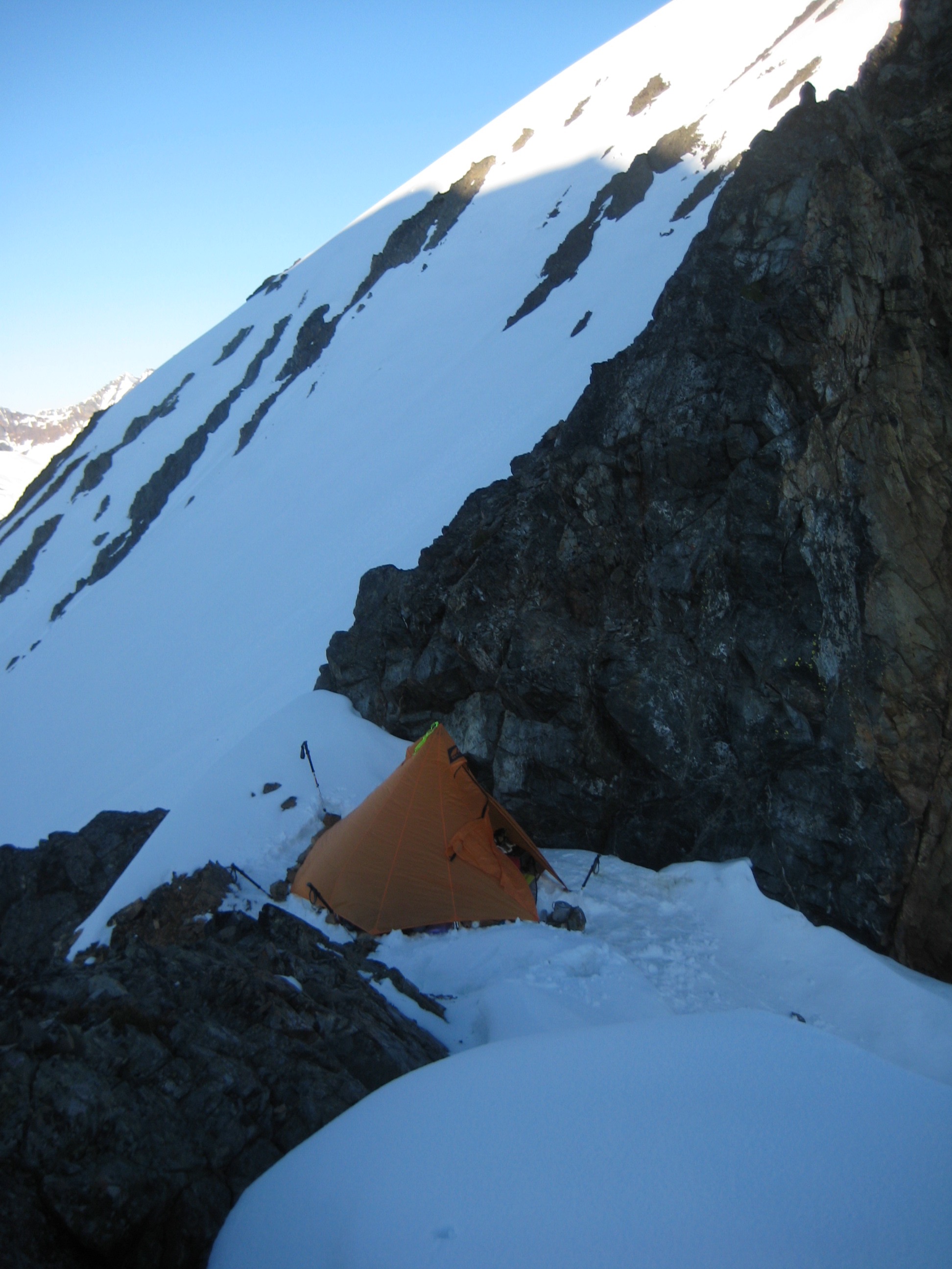 From the pass, we continued on an ascending NW traverse over moderately steep snow slopes and snow gullies to Kitling Col, then contoured over to 7400’ Mesahchie Col. A half hour of stomping and re-grading resulted in one small tent platform with marvelous views to the south and north.