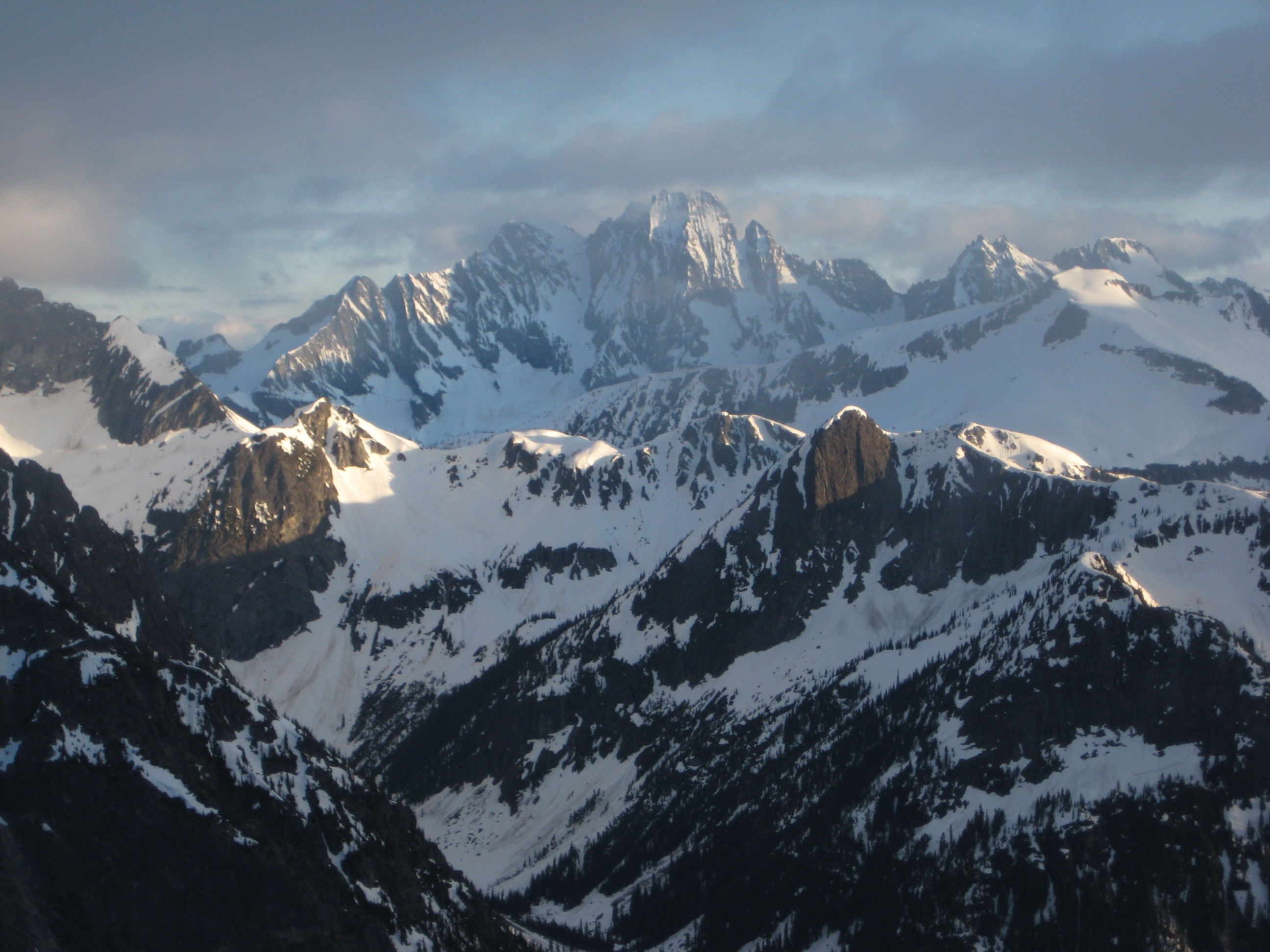 evening light on snow covered Jack Mountain and Crater Mountain in the North Cascades