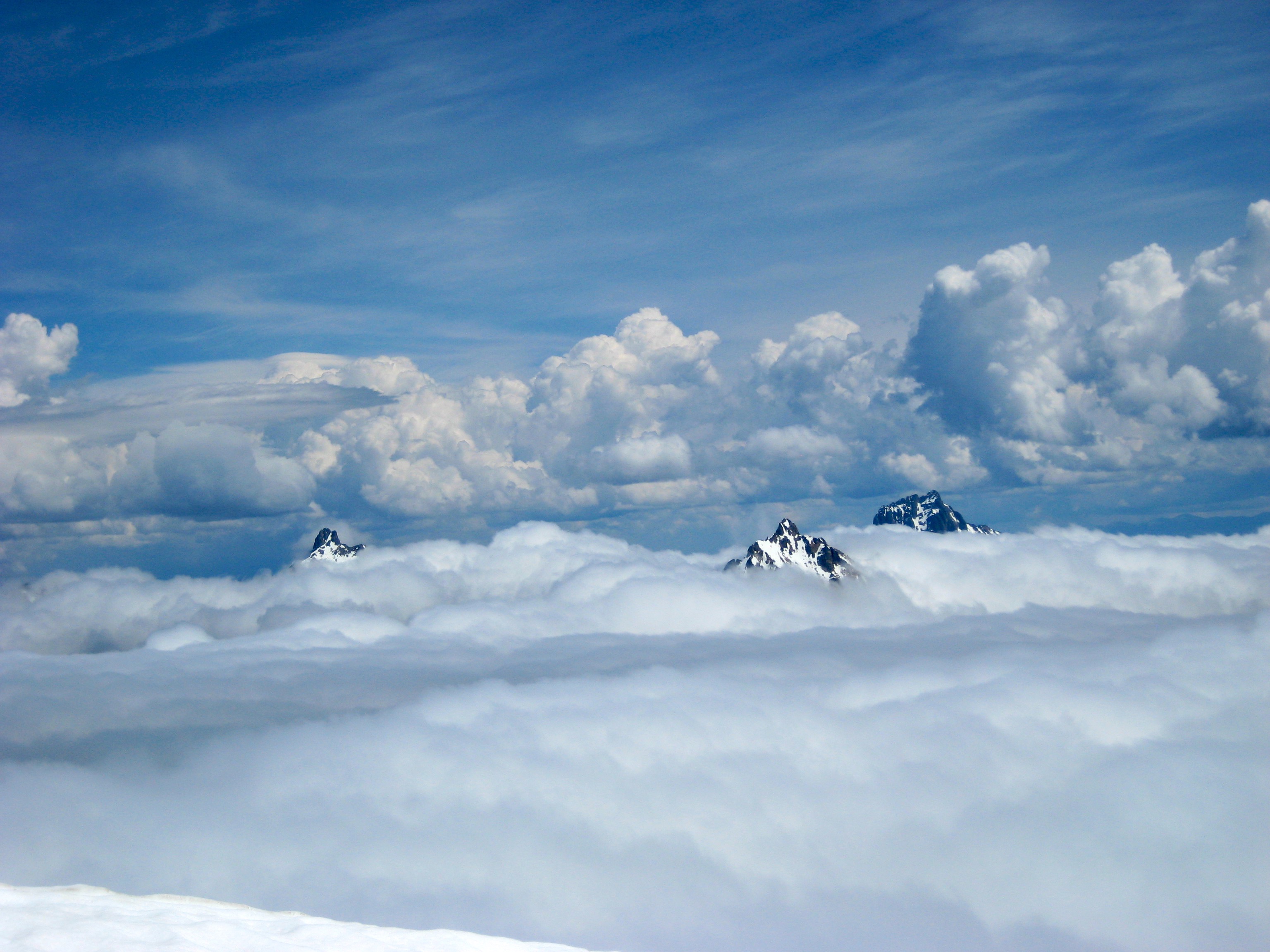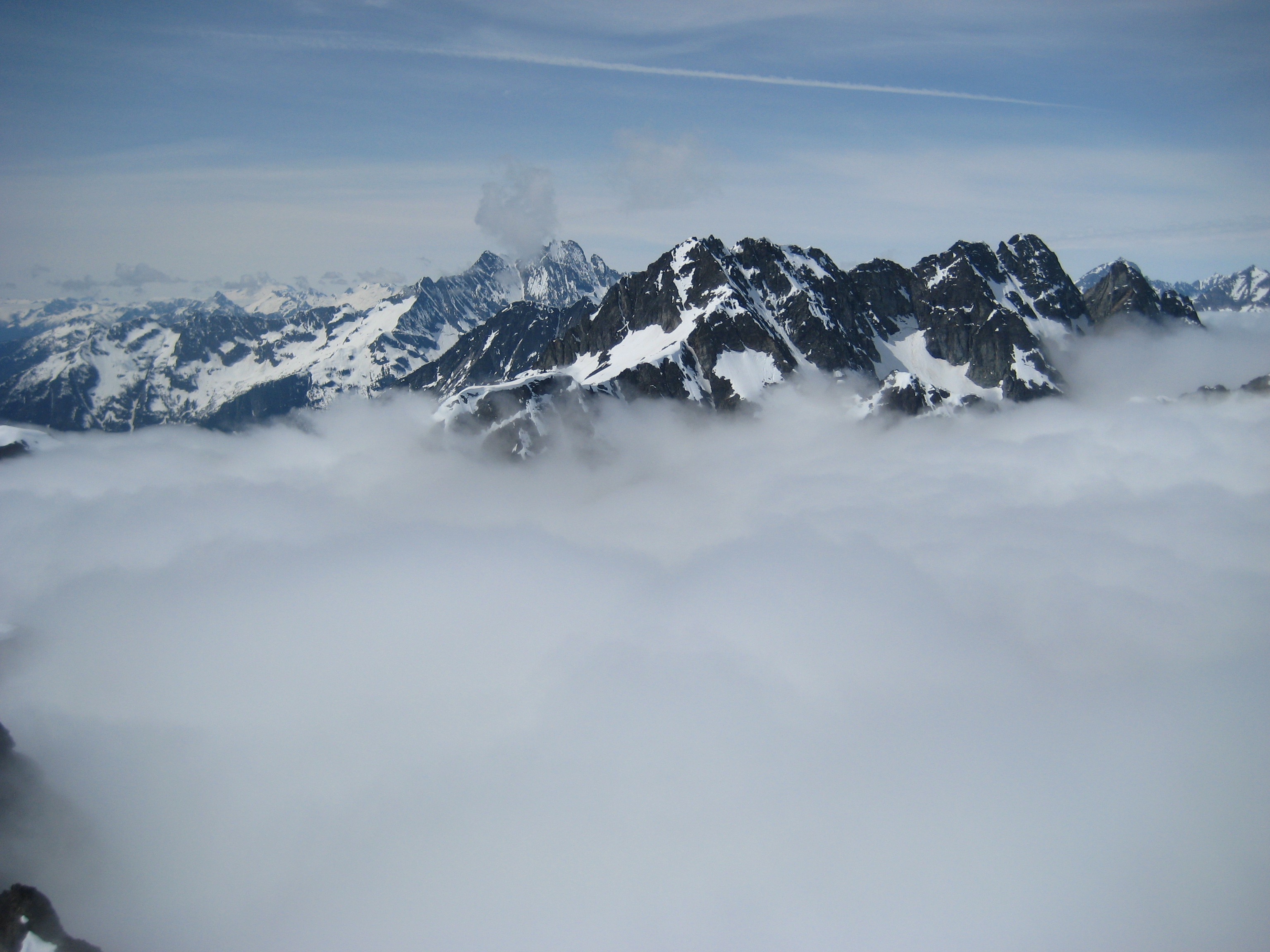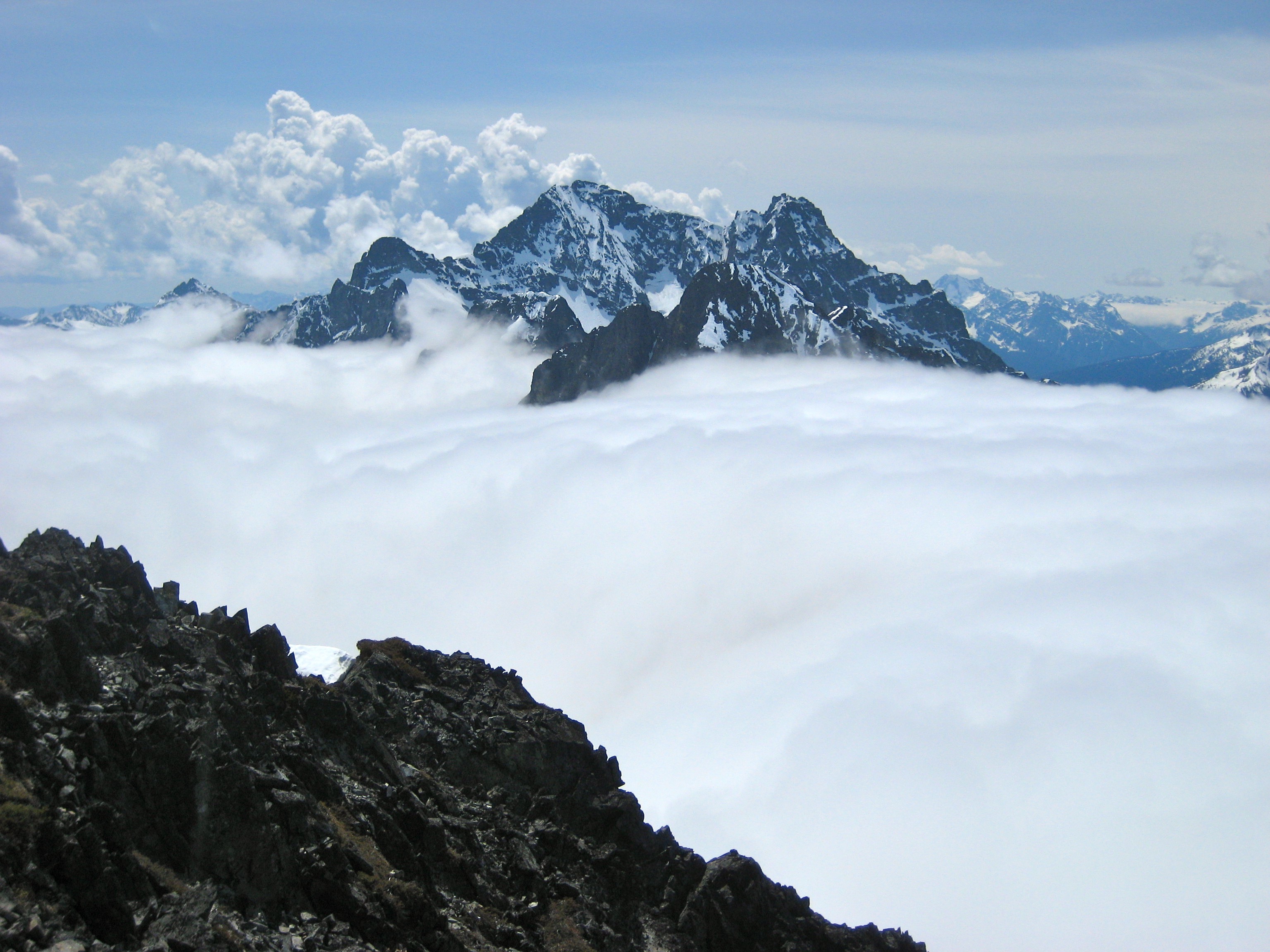 A few of the taller peaks to the east also managed to punch through the cloud deck. Cumulus clouds above threatened to build into thunderheads but never did.