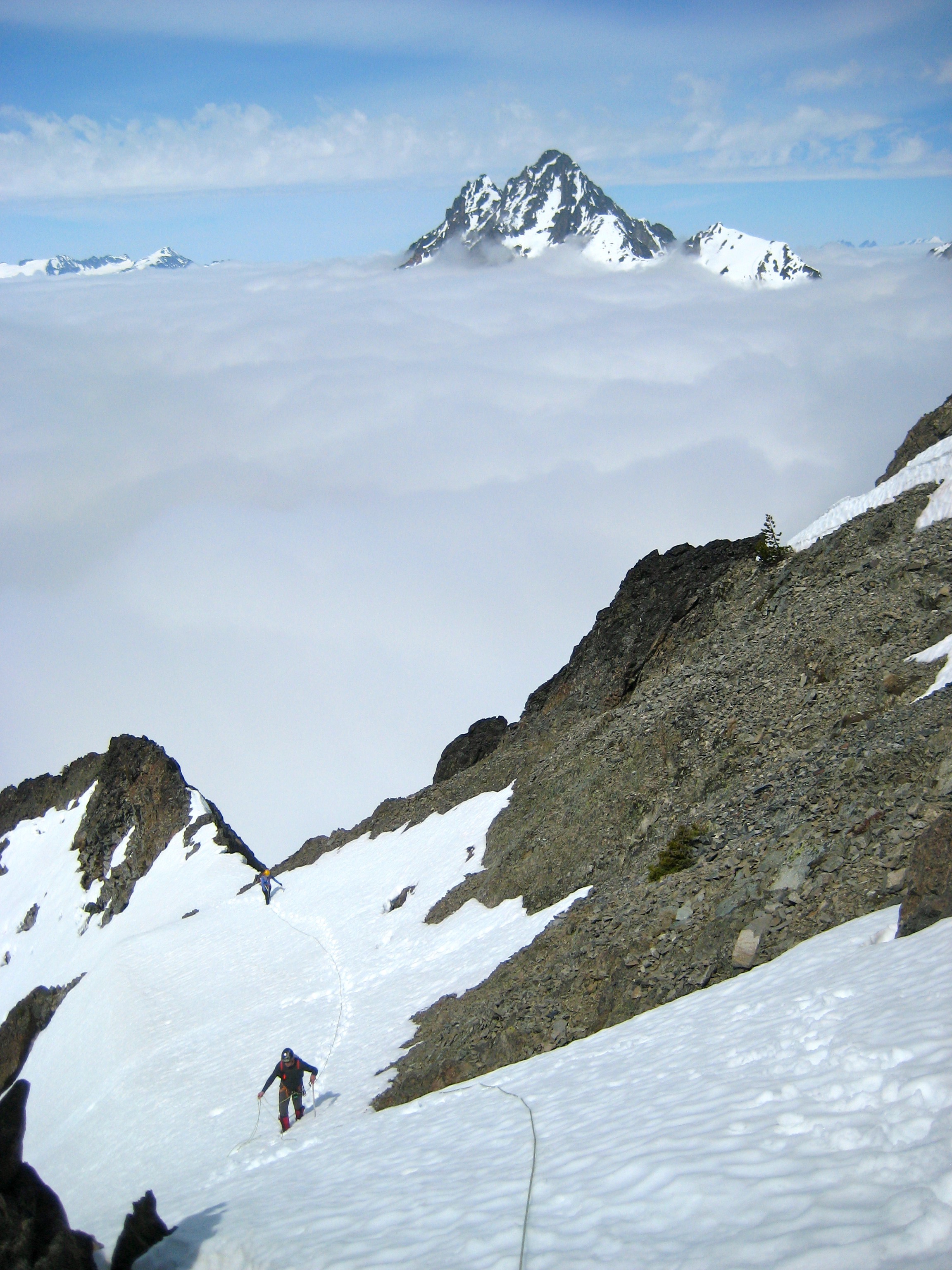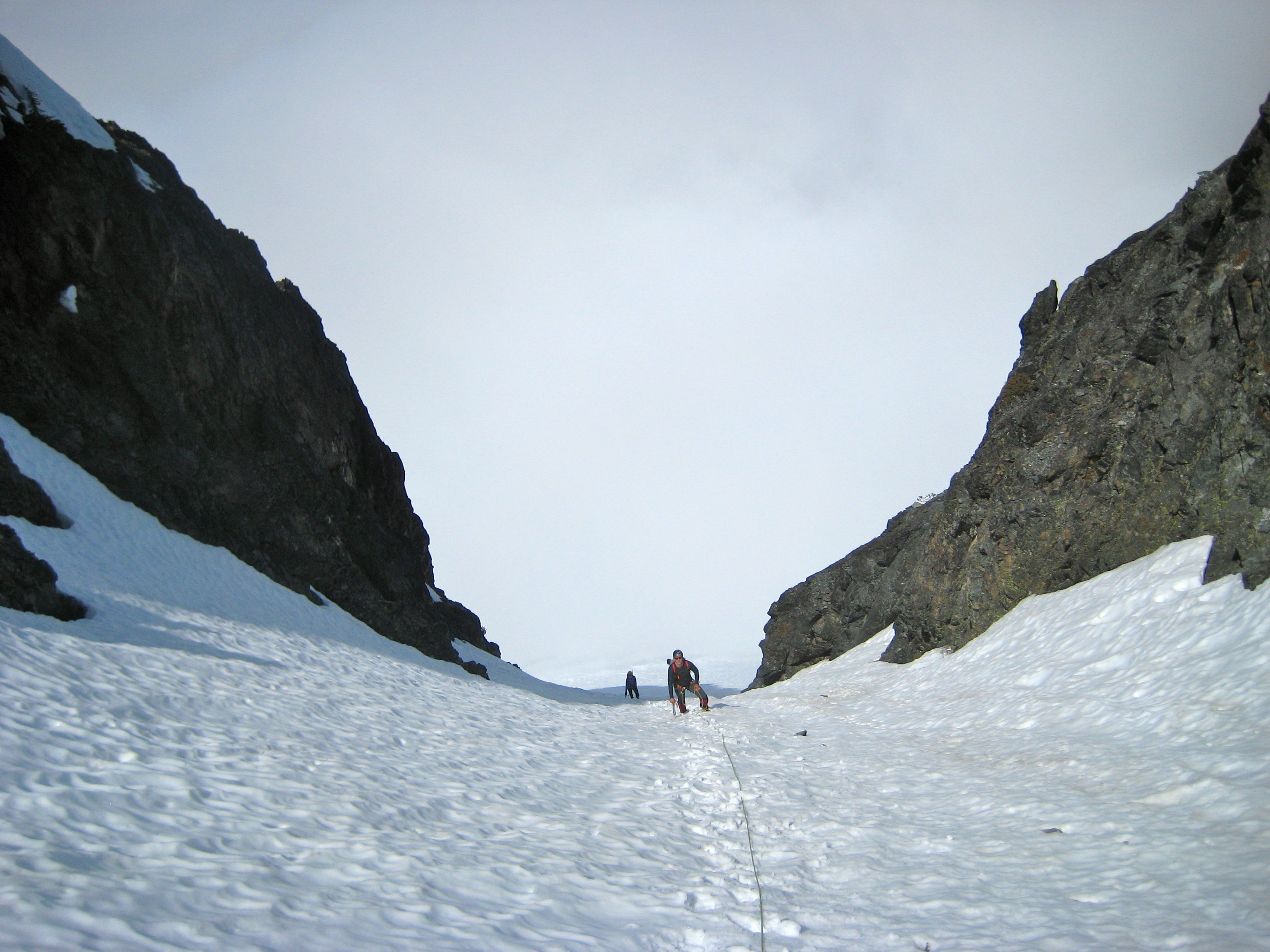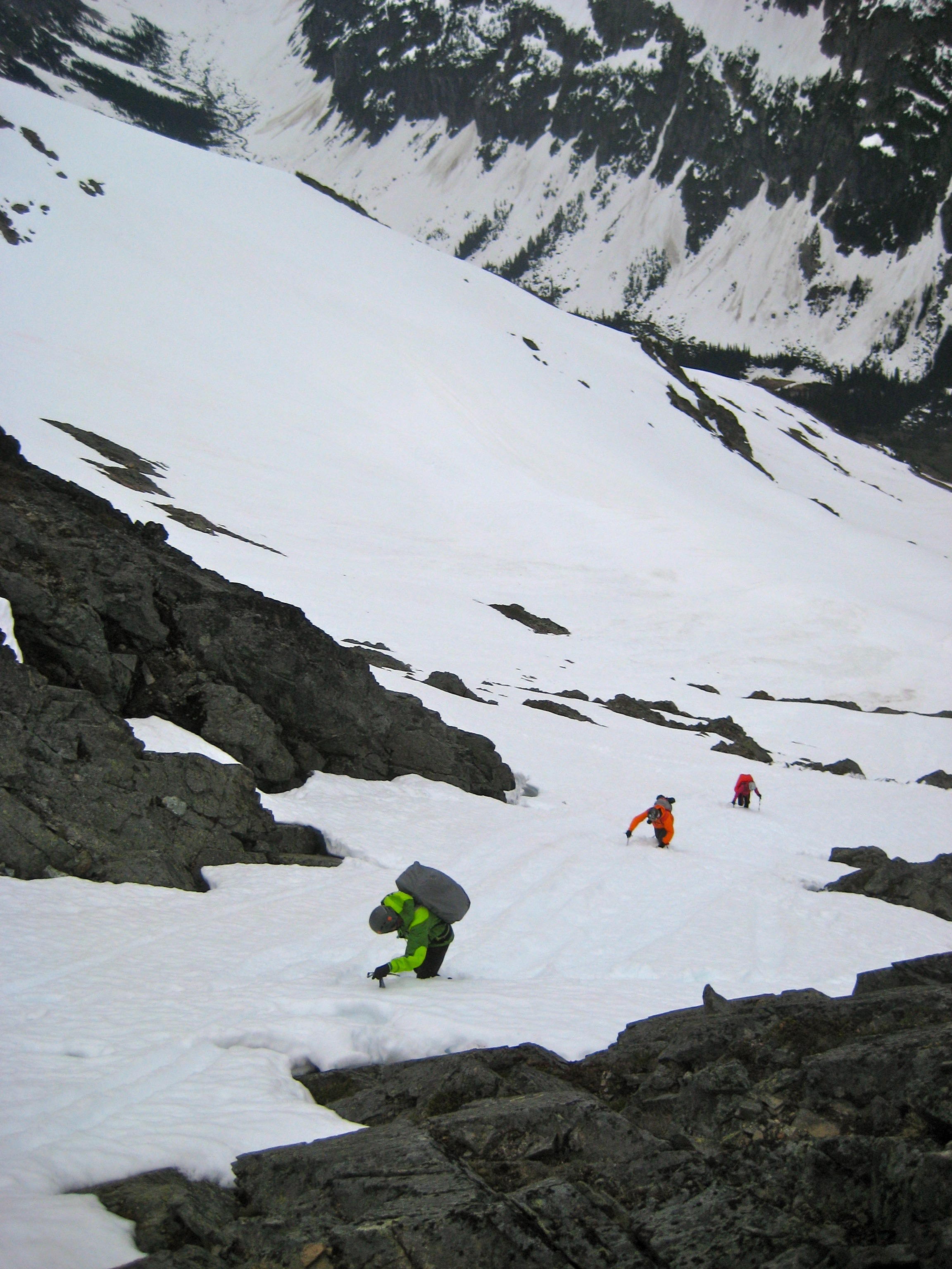 On Sunday morning, K. Ko and Eileen and I headed out for Graybeard Peak. We ascended about 400 feet above Easy Pass and then contoured across a series of snowfields and rock slopes until entering a large 6800-foot basin west of the peak. From the basin, we climbed directly eastward up a distinctive snow chute. The angle was steep enough (up to about 40 degrees) to prompt the use of a rope, flukes, and pickets. But we were happy to leave the valley fog behind us.