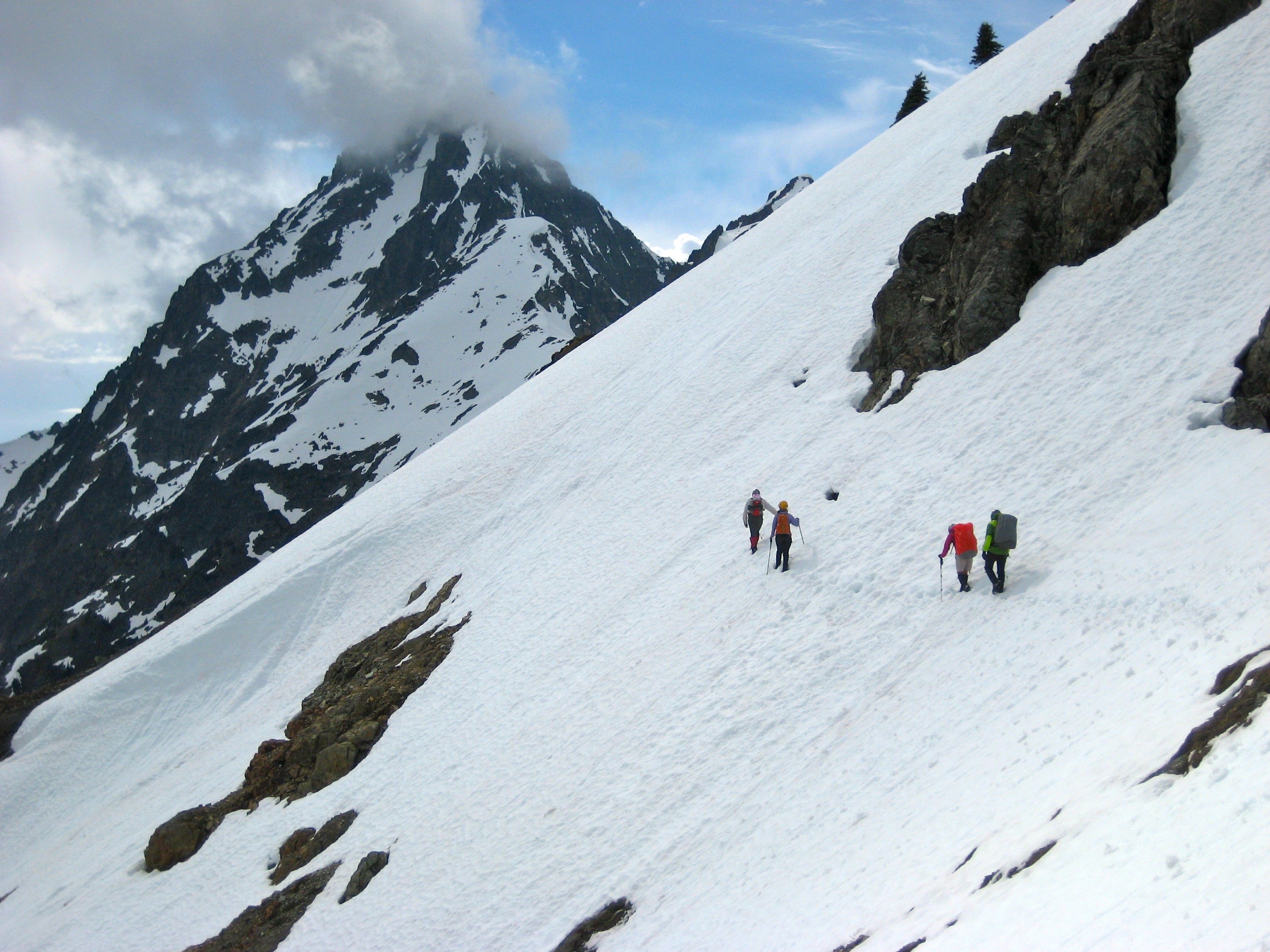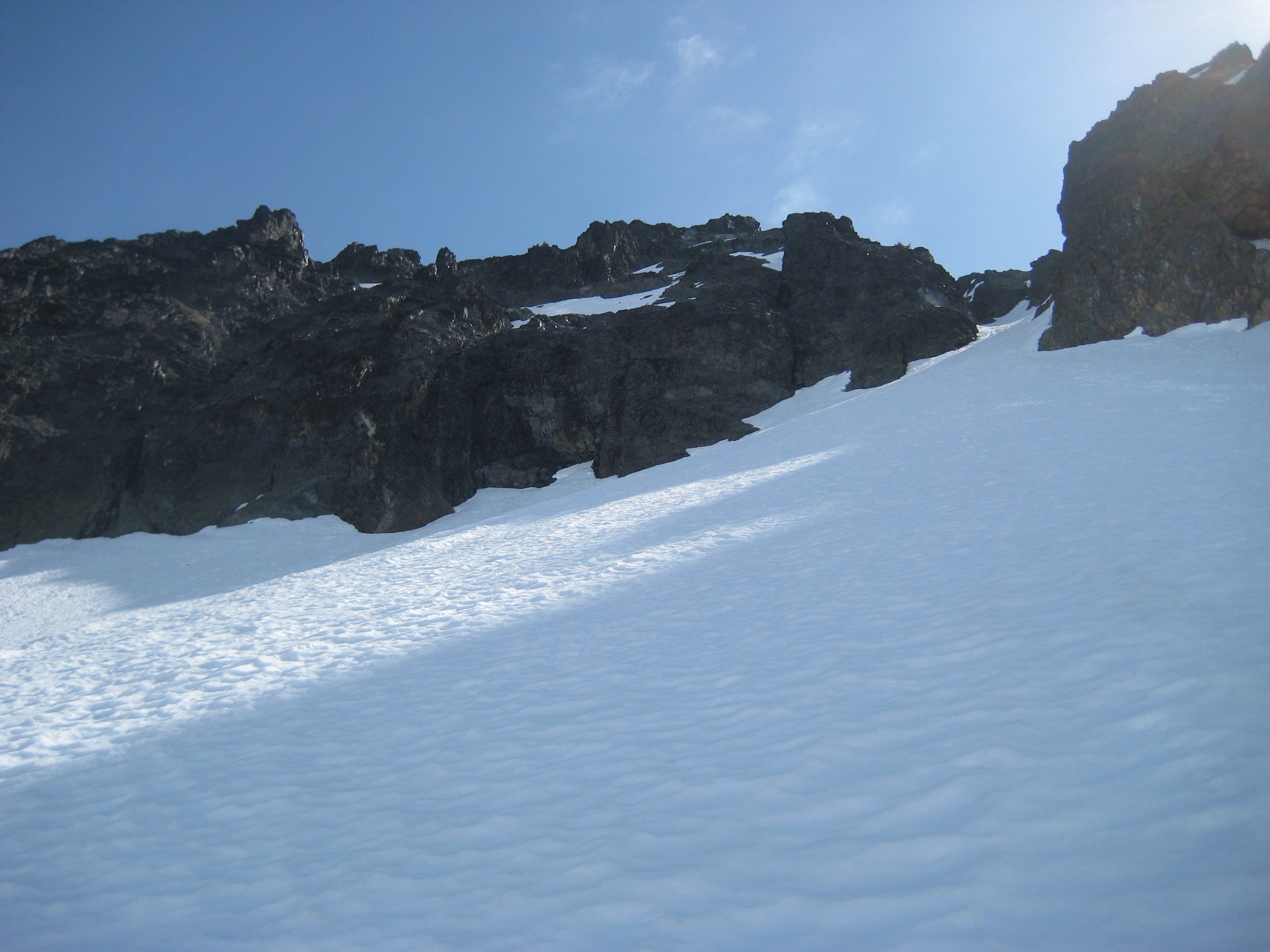 At the top of the snow chute, we crossed onto a high south-facing snowfield, which ended at the rocky south ridge.