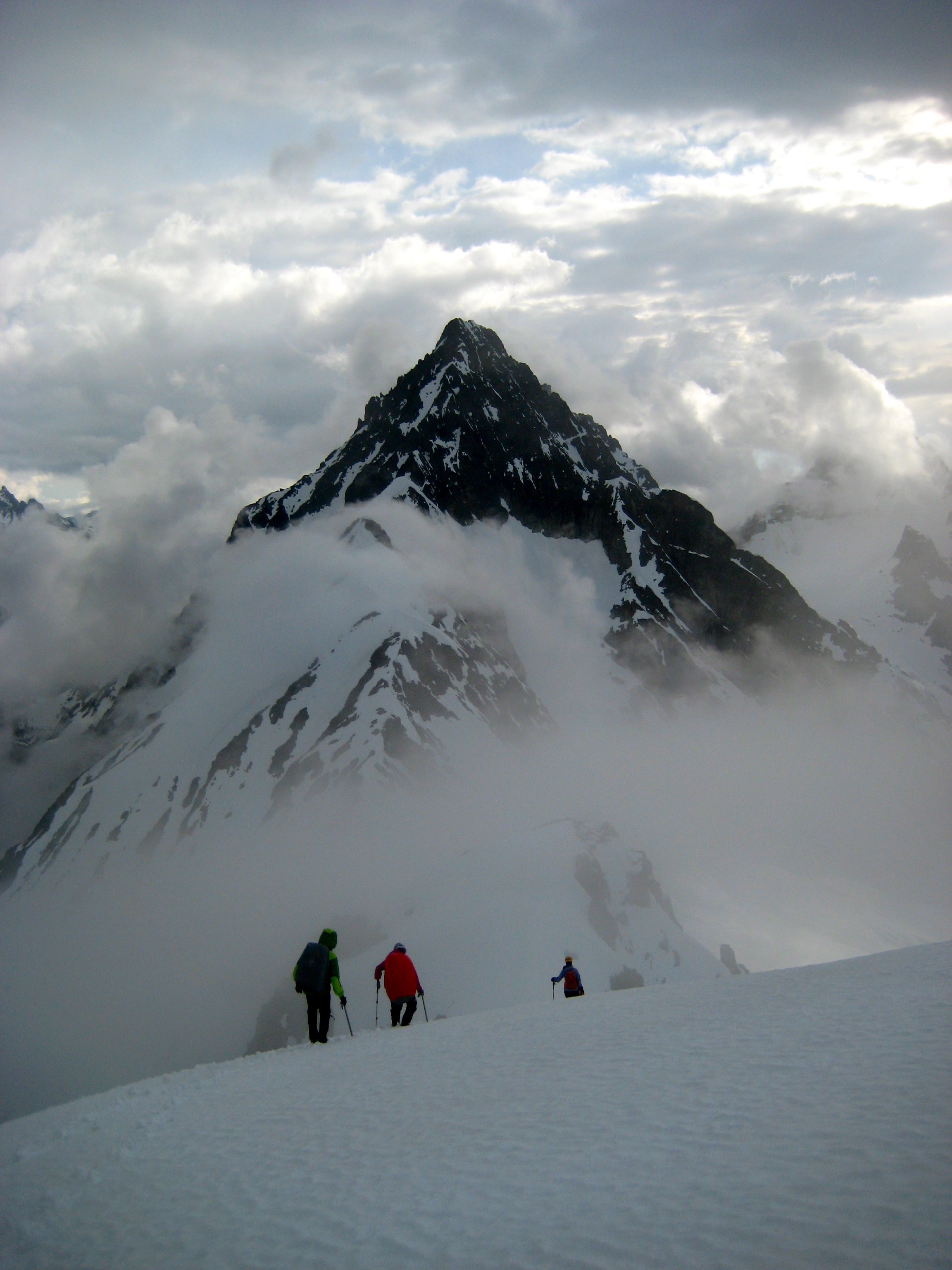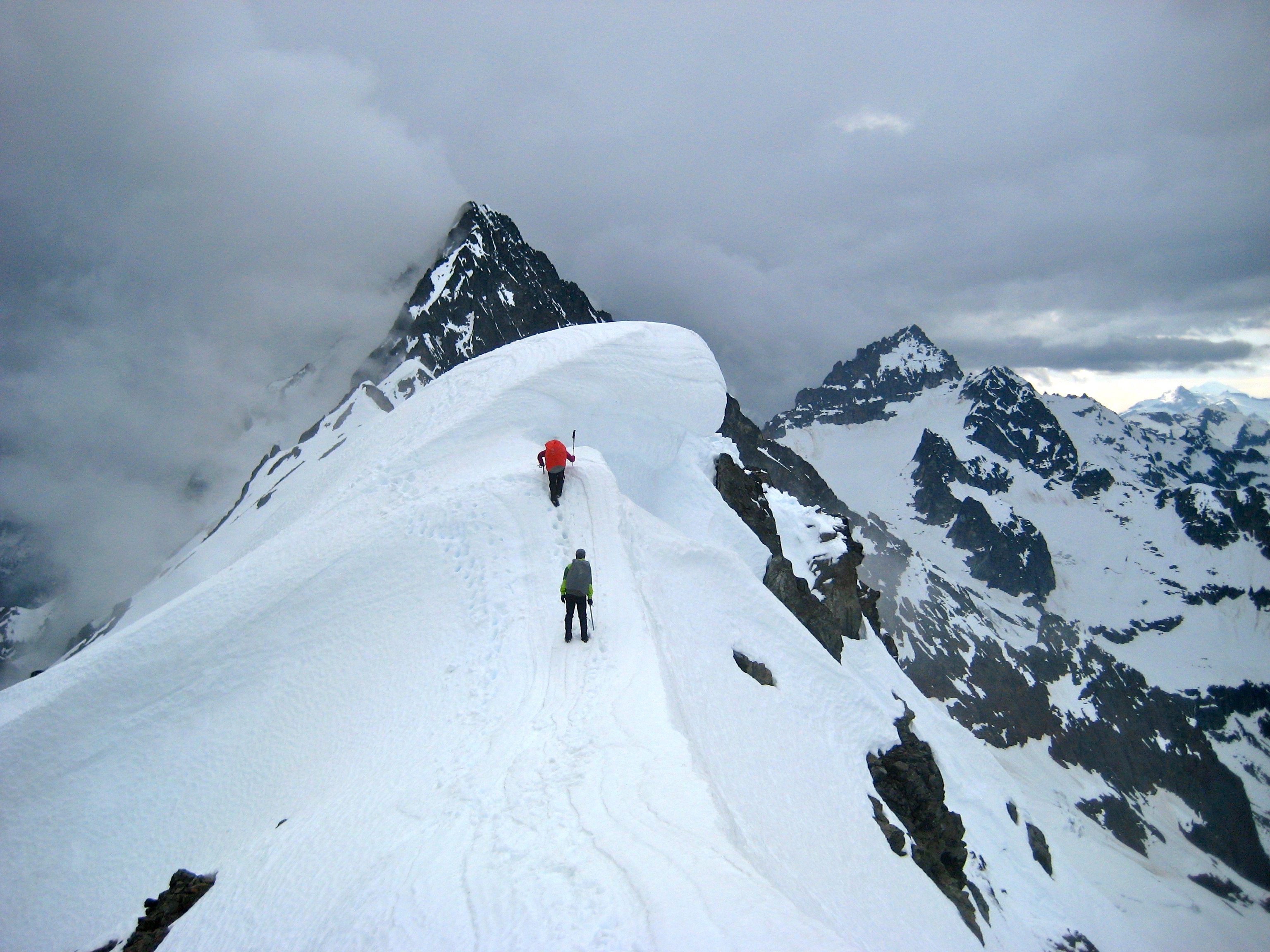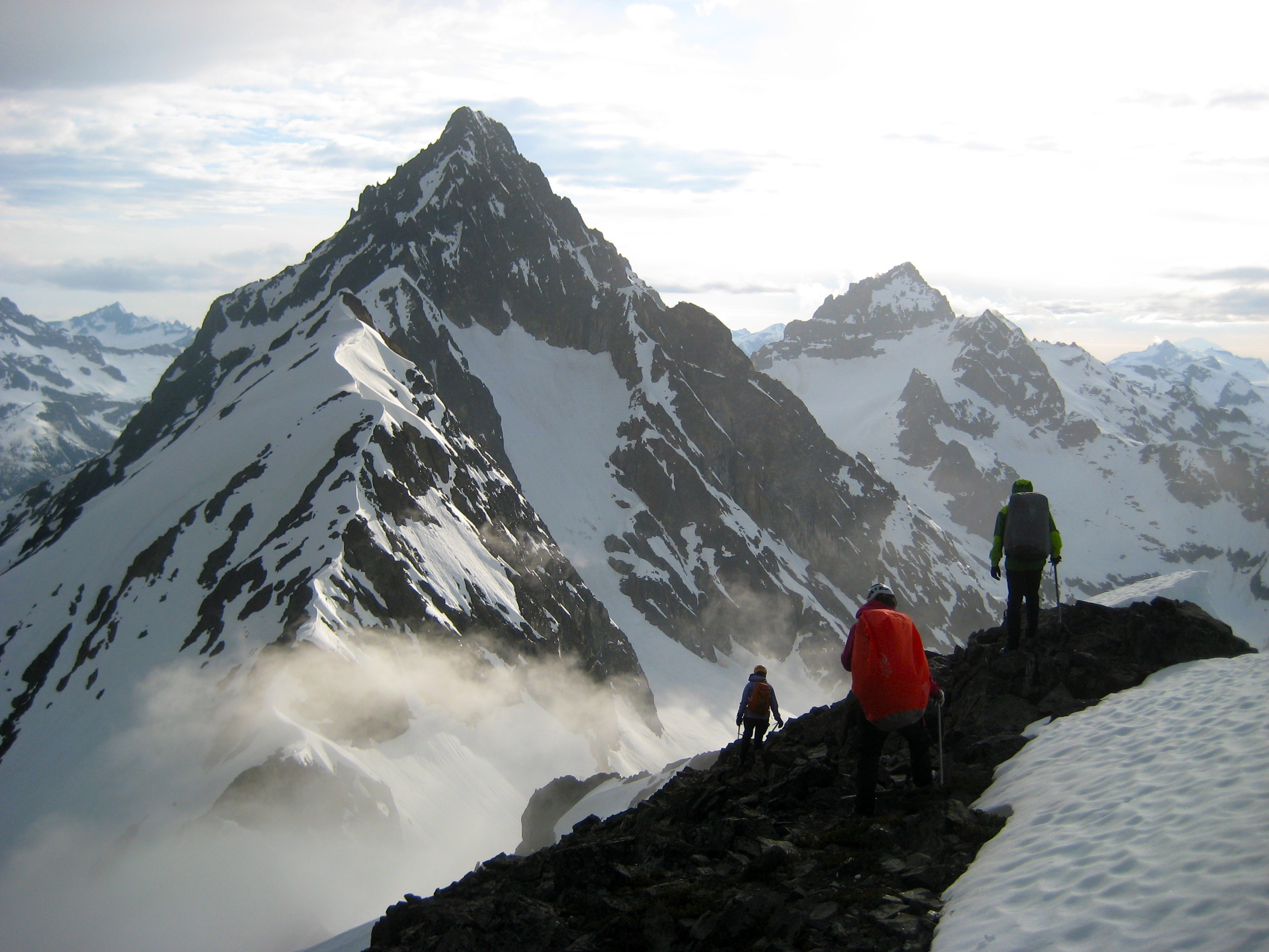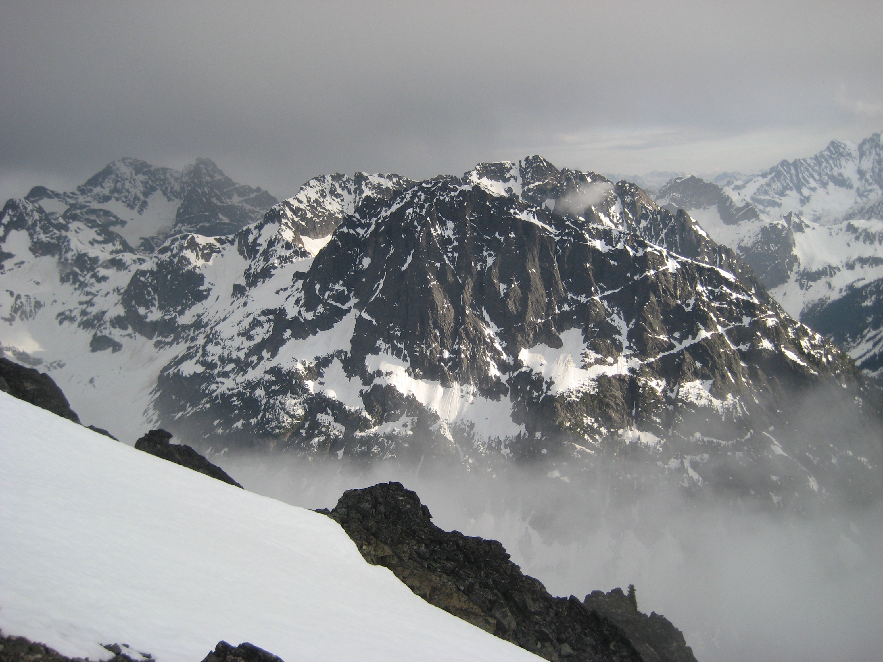The snowfinger terminated on Kitling’s narrow, exposed west ridge. We followed the crest upward and over an interesting false-summit snow pillow, and then up a final snowfield to the corniced summit dome. To the northwest, Mesahchie Peak and Kimtah Peak brushed against the cloud ceiling.