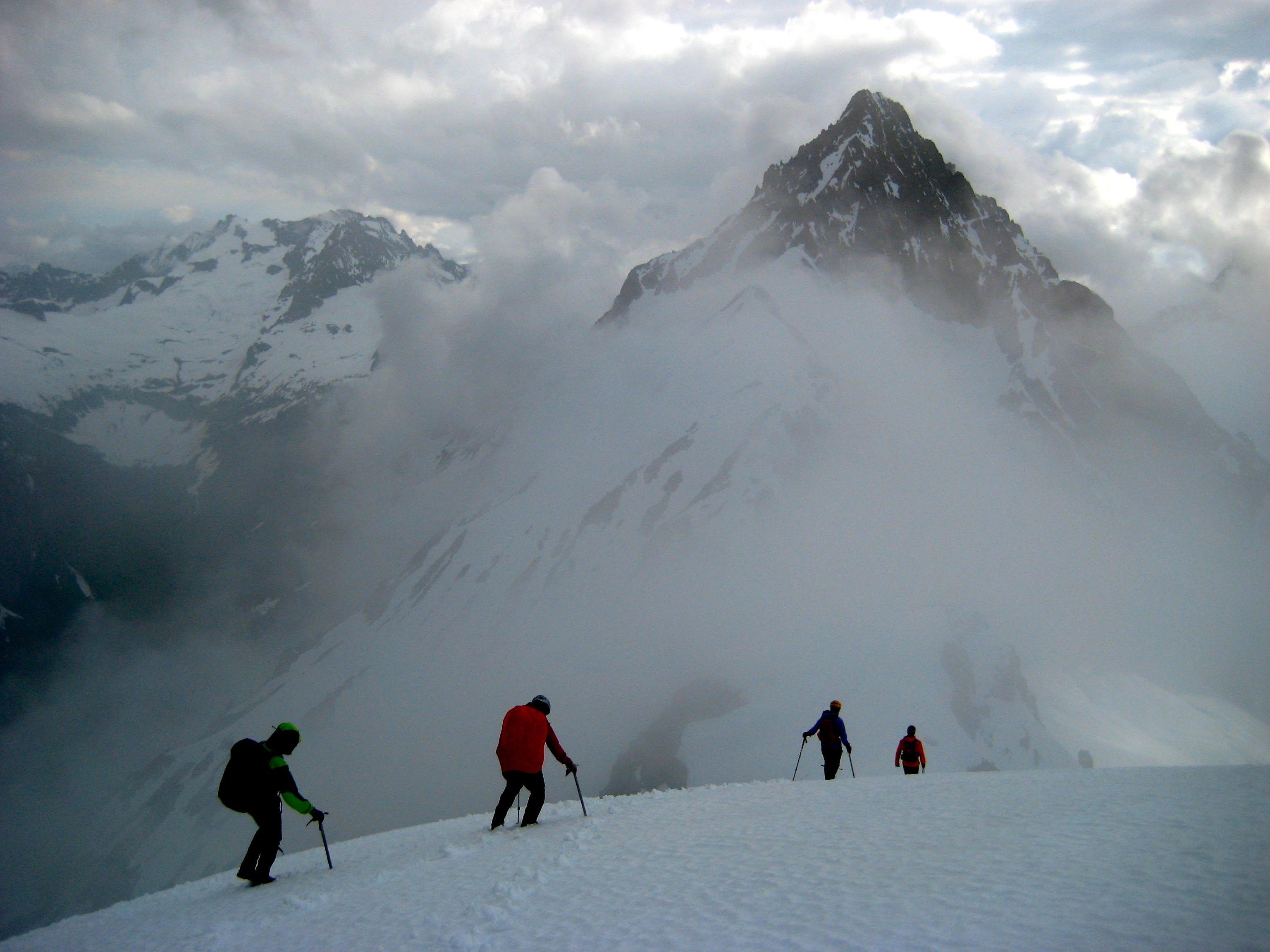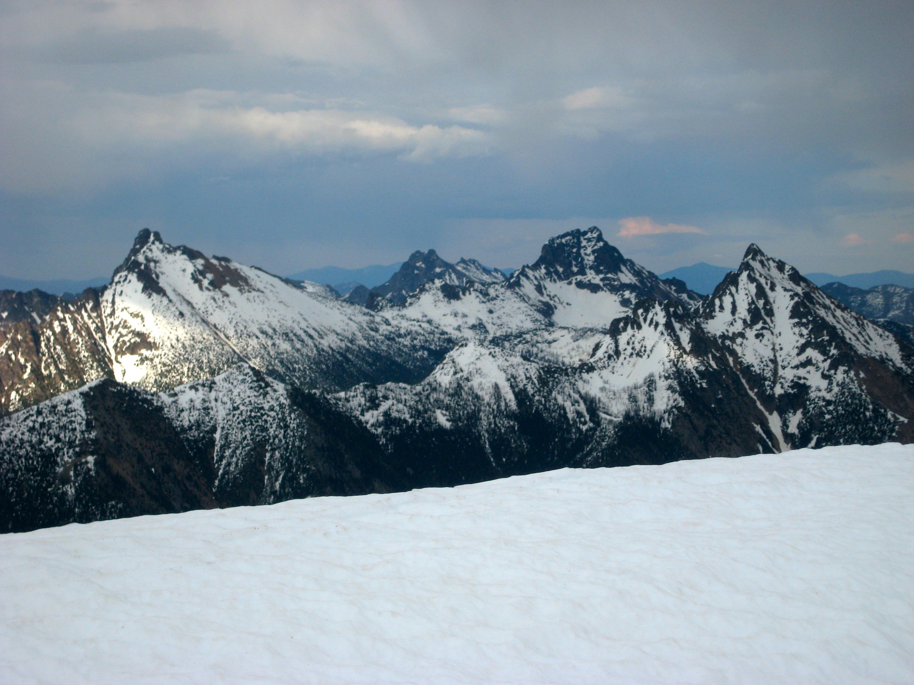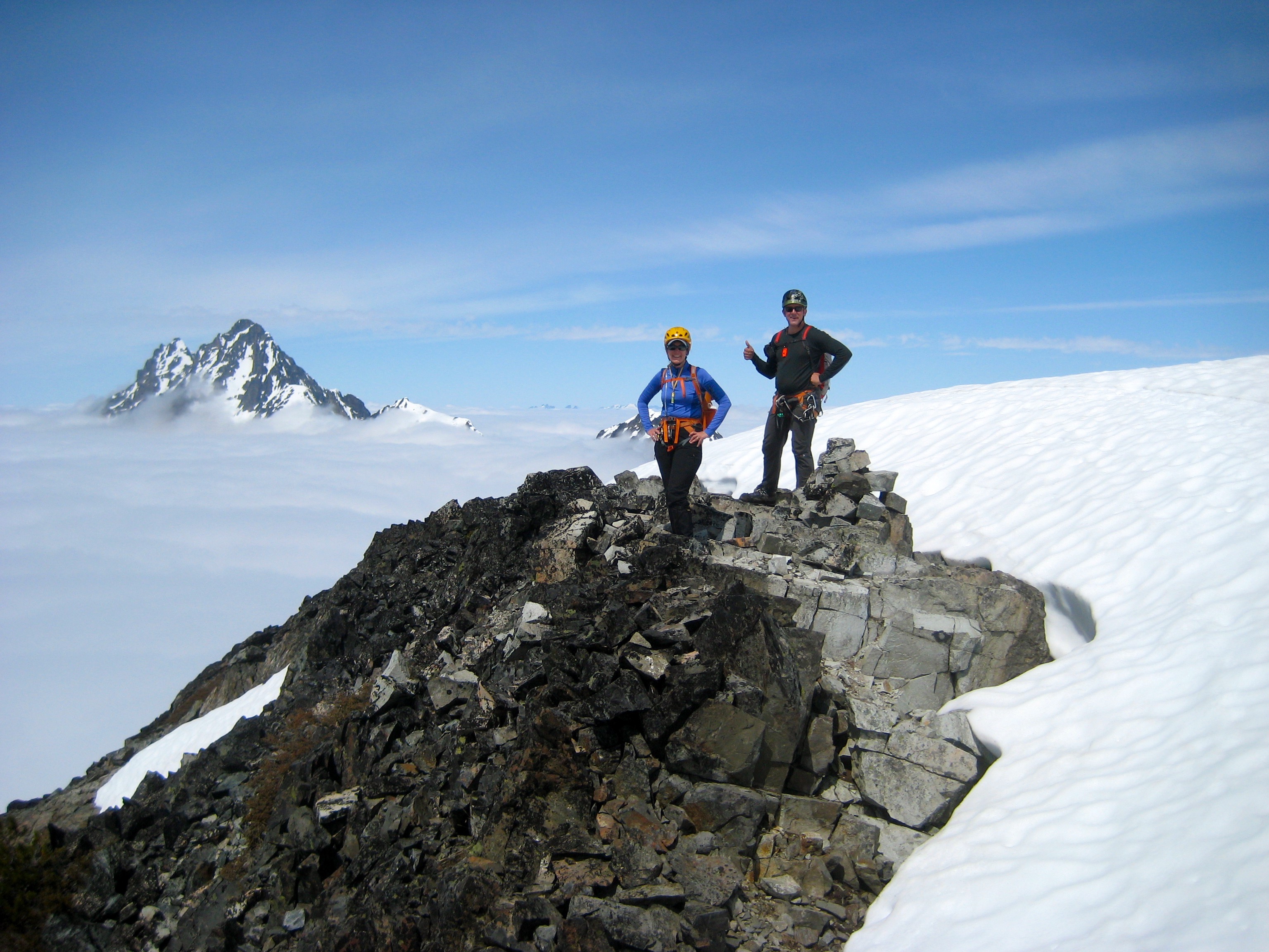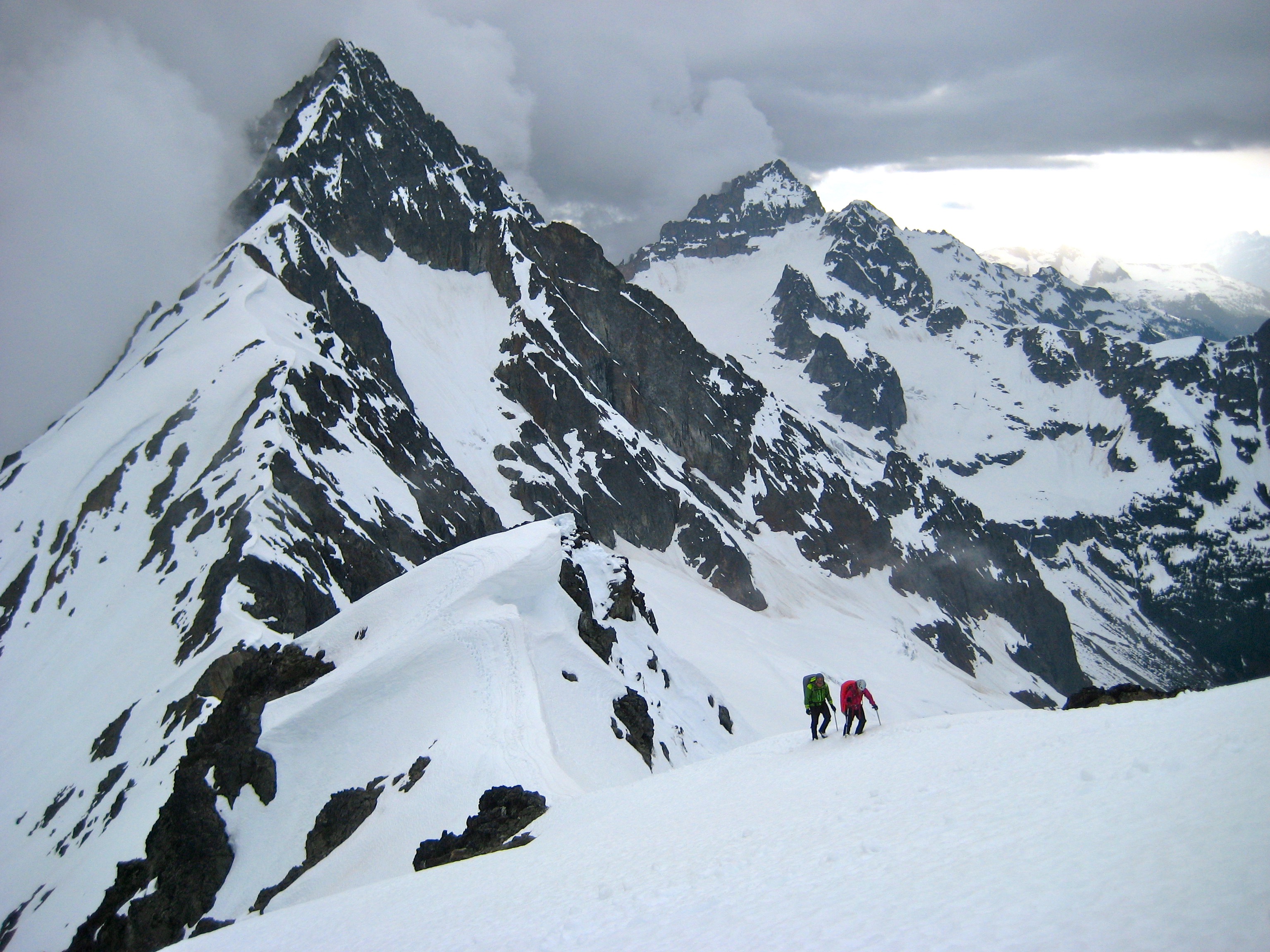The snowfinger terminated on Kitling’s narrow, exposed west ridge. We followed the crest upward and over an interesting false-summit snow pillow, and then up a final snowfield to the corniced summit dome. To the northwest, Mesahchie Peak and Kimtah Peak brushed against the cloud ceiling.