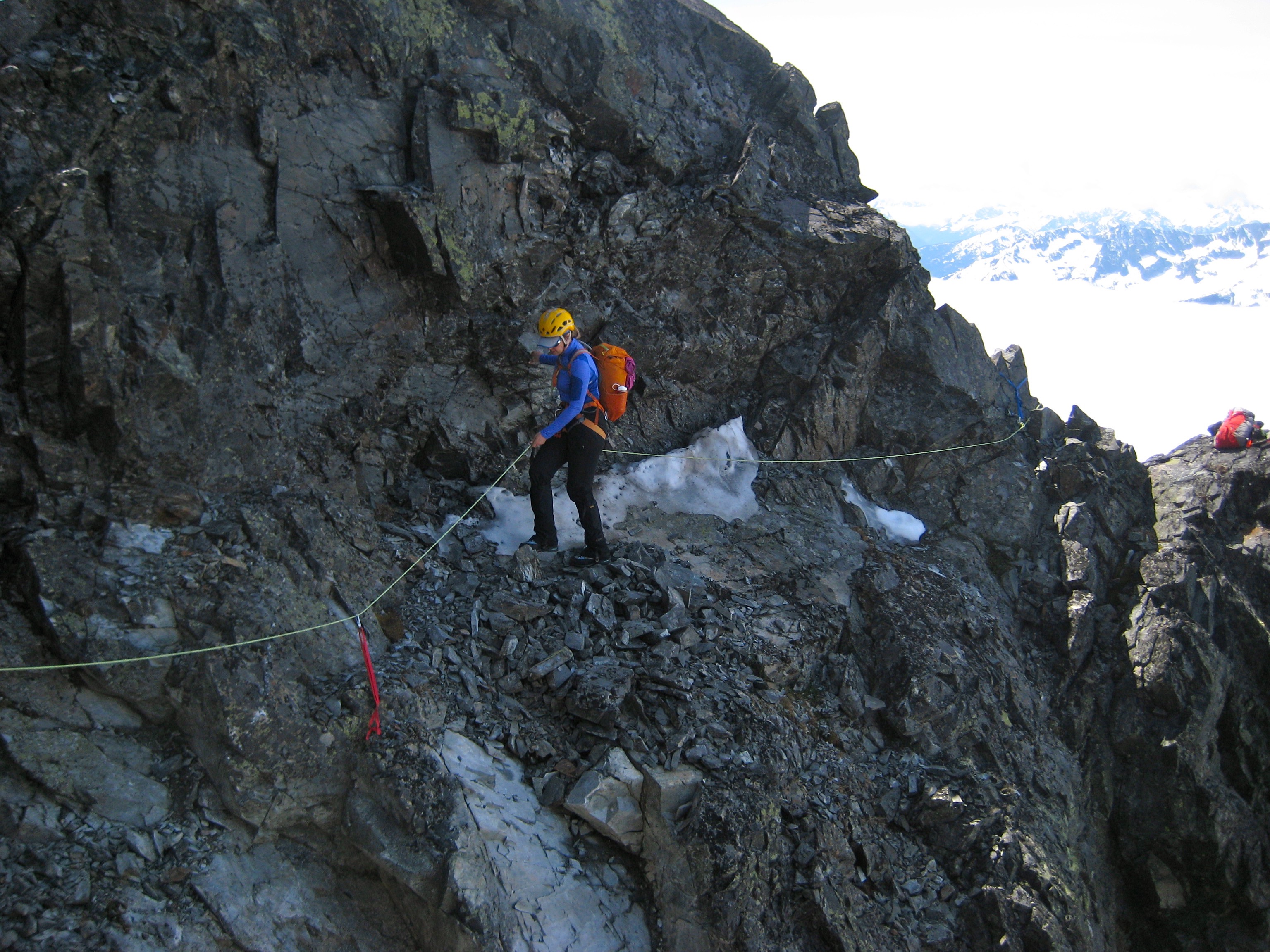 A hundred yards of Class 2-3 scrambling along the shattered ridge led us to a loose, exposed notch closely south of the summit knob. The rock here was loose, down-sloping, and partially covered with ice. How fun does that sound? We didn’t hesitate to string up a hand line for safety.