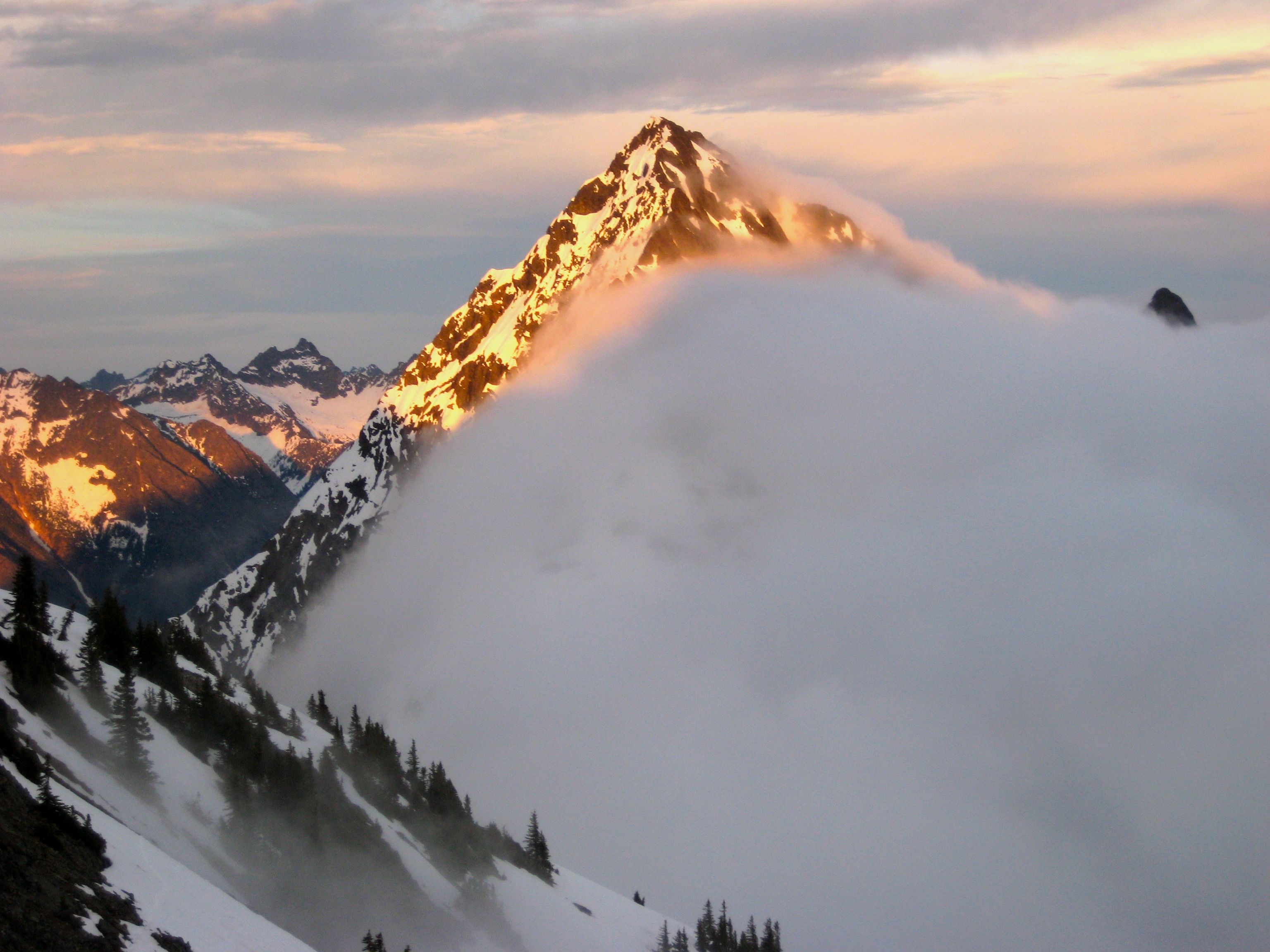 During our descent, fog rose up from Fisher Creek valley and enveloped all but the highest peaks. The setting sun gave a warm glow to everything above the fog.