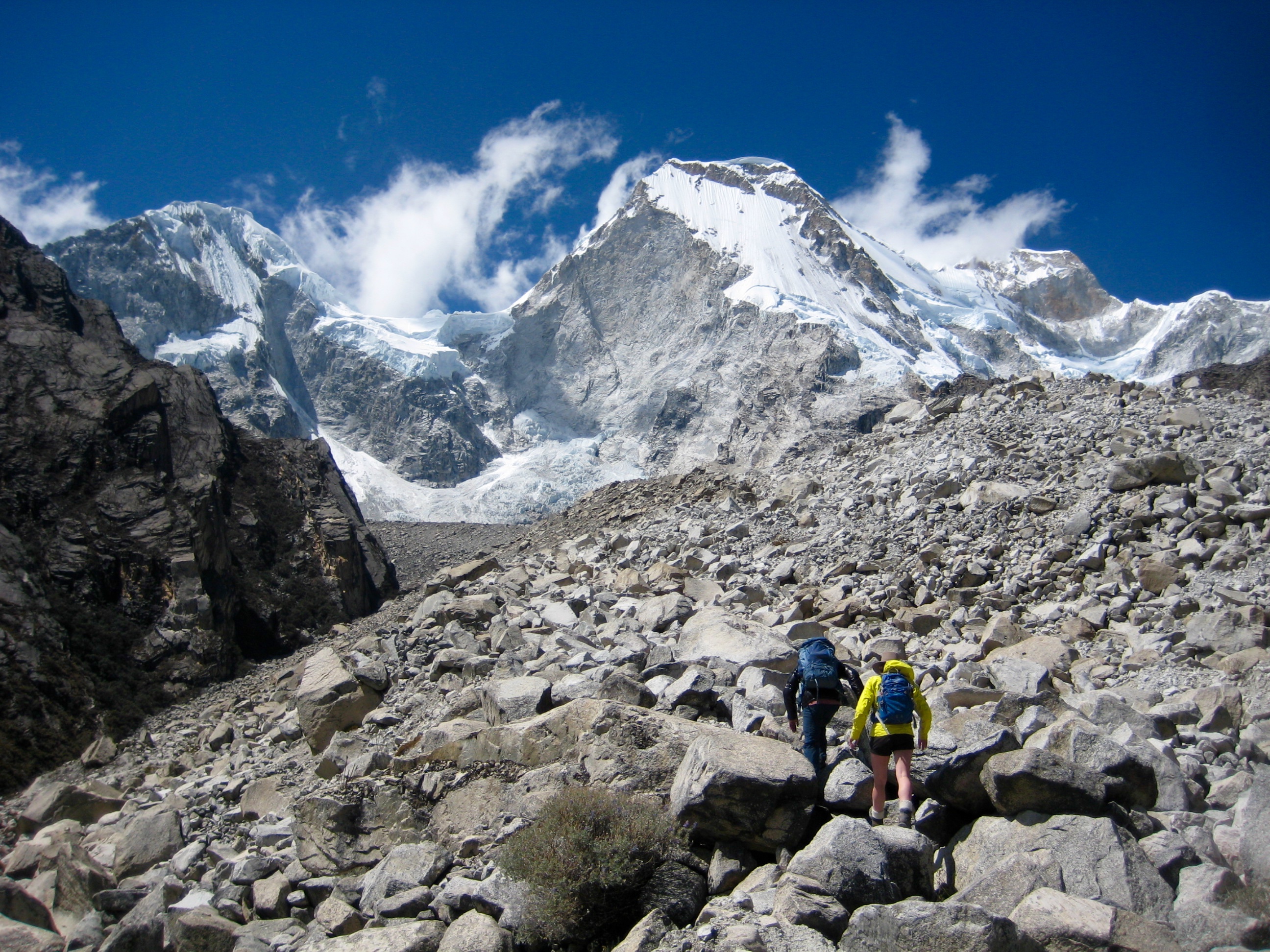 Scrambling Up Huandoy Glacier Moraine