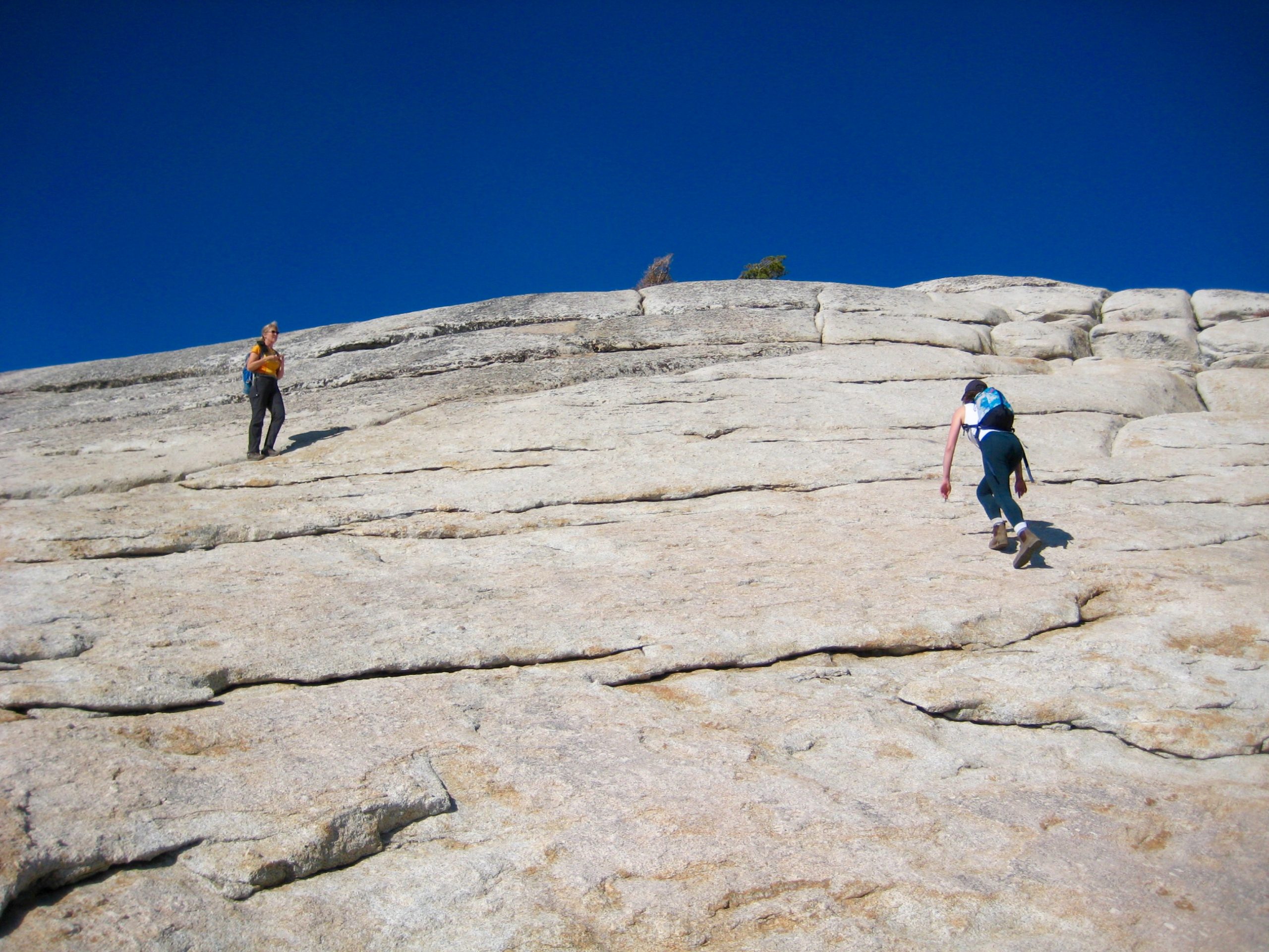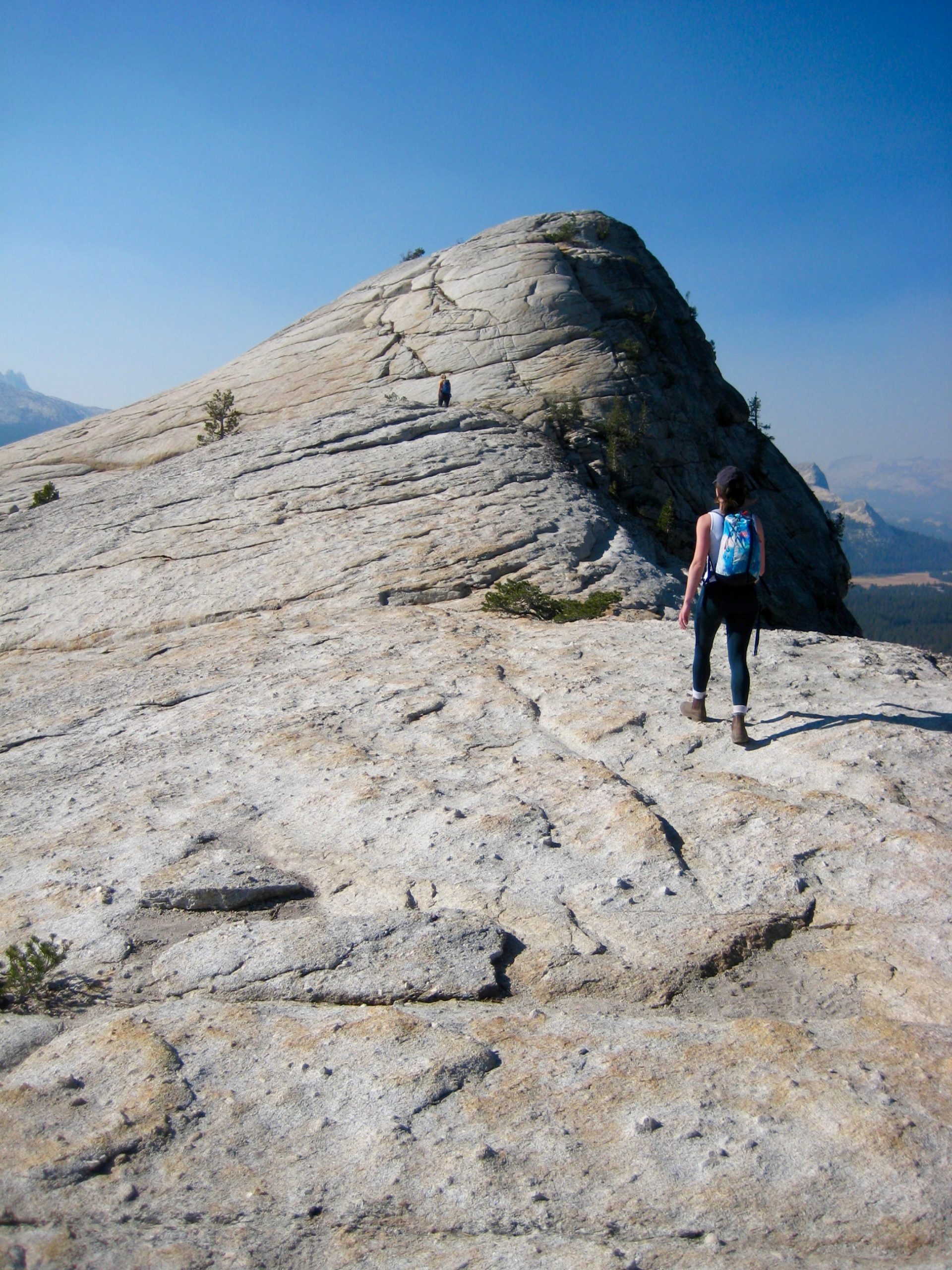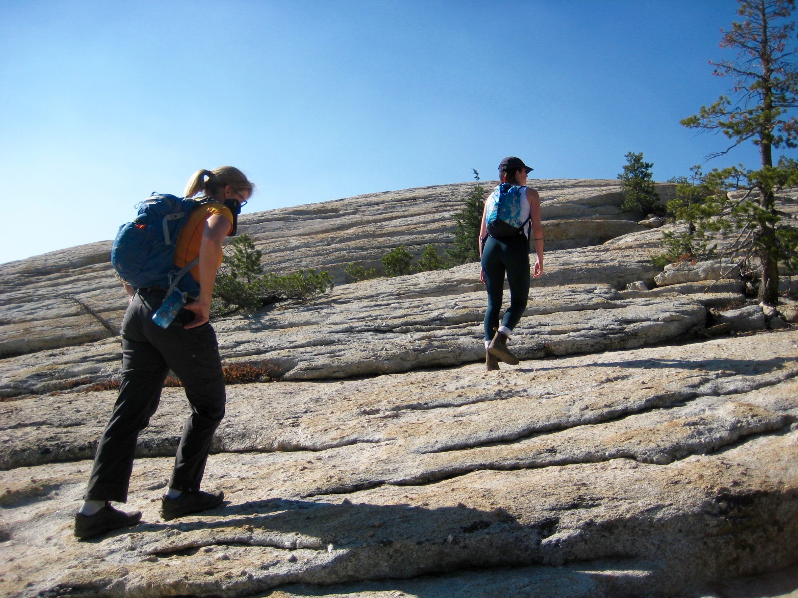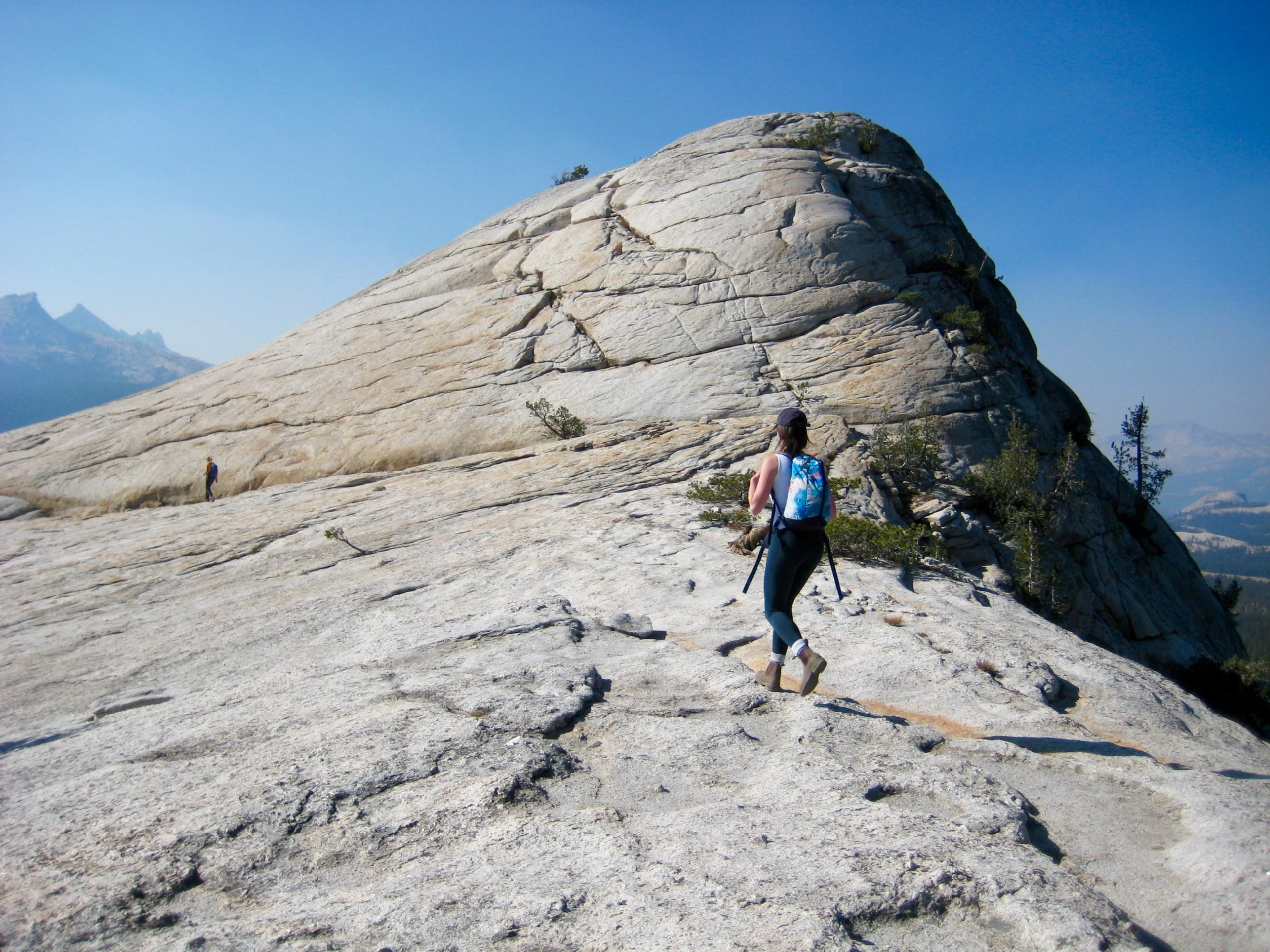 During our last morning in Yosemite National Park, Eileen, Brooke, and I took a quick jaunt up Lembert Dome. This white granite knob rises 800 feet above the green expanse of Tuolumne Meadows and is enticingly visible from Tioga Road. Lembert Dome represents a textbook example of a roche moutonnee, or “sheep rock.” This term refers to a geologic outcrop having a relatively smooth ridge on the up-valley side due to glacial abrasion and having a relatively steep face on the down-valley side due to glacial plucking.
