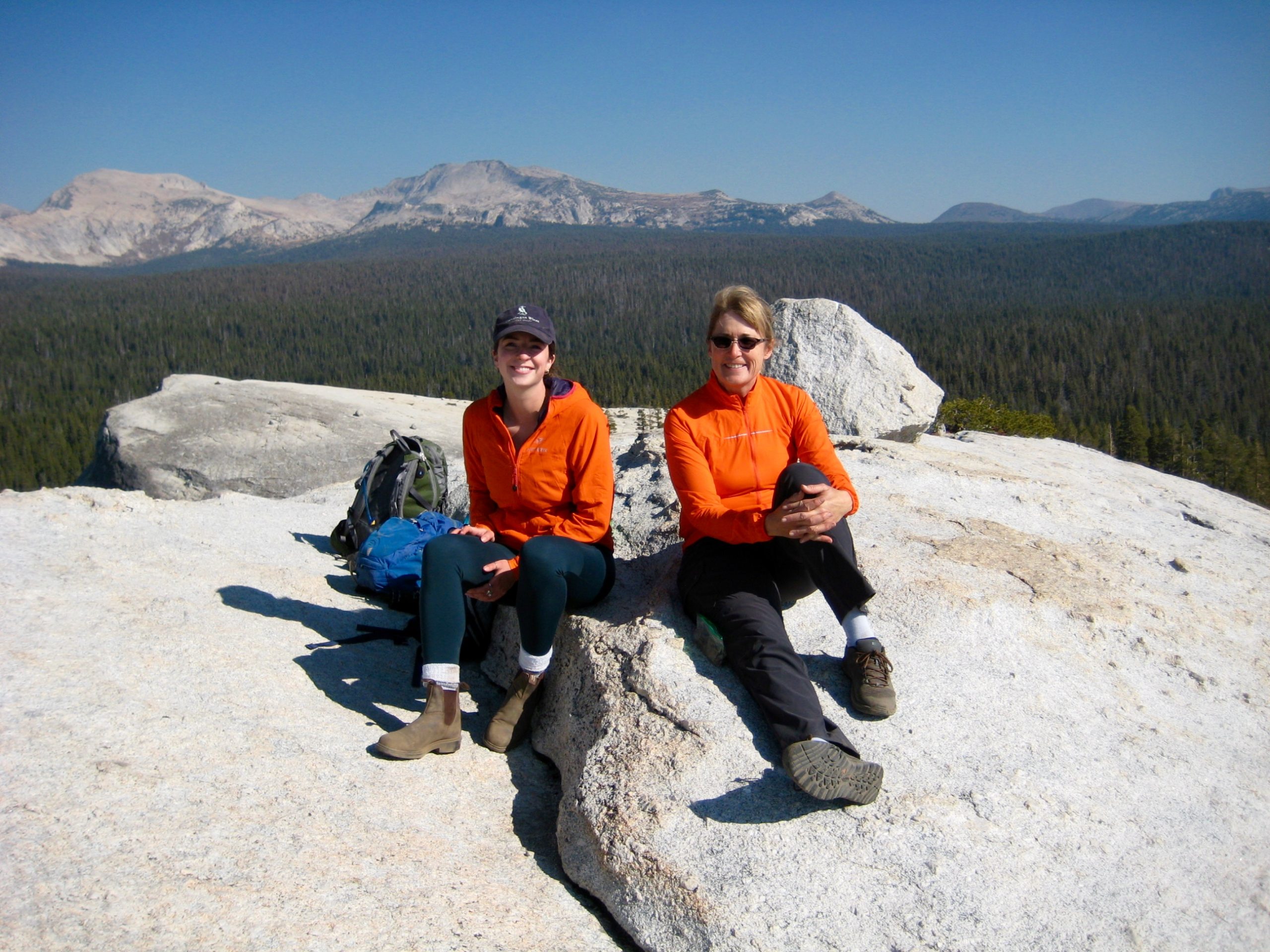 From the summit, we could see north to the Tioga Crest and Mt. Conness, yesterday’s objective. Unfortunately, Yosemite Valley and everything to the south was enveloped by wildfire smoke.