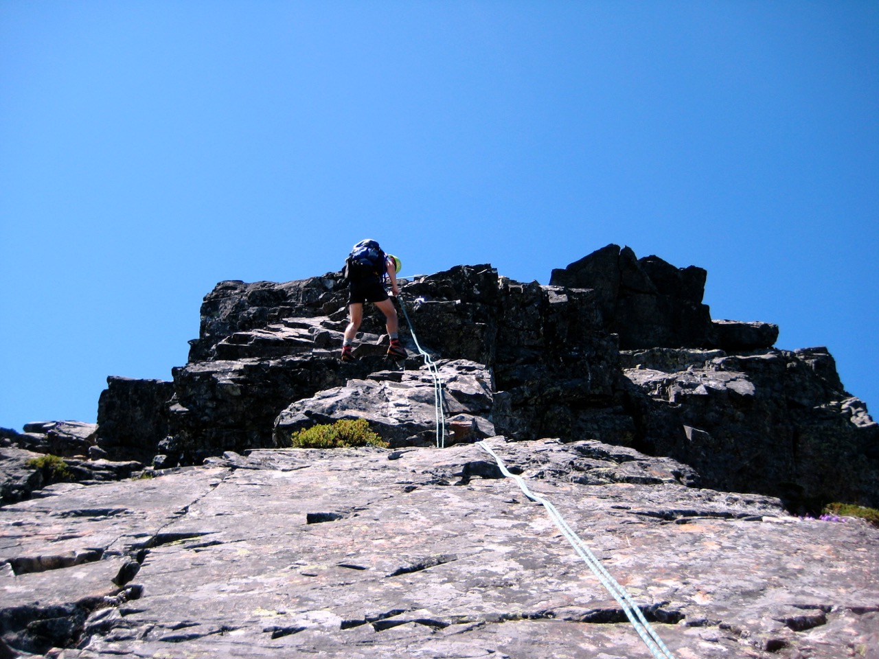 The west ridge consists of large blocks and small horns with no obvious route. It is rated as Class 4, so we roped up and began working our way upward, wandering back and forth across the narrow crest. A few slings and chocks provided protection along the way. The rock was surprisingly solid, and the climbing was enjoyable, with moderate exposure but never too difficult.