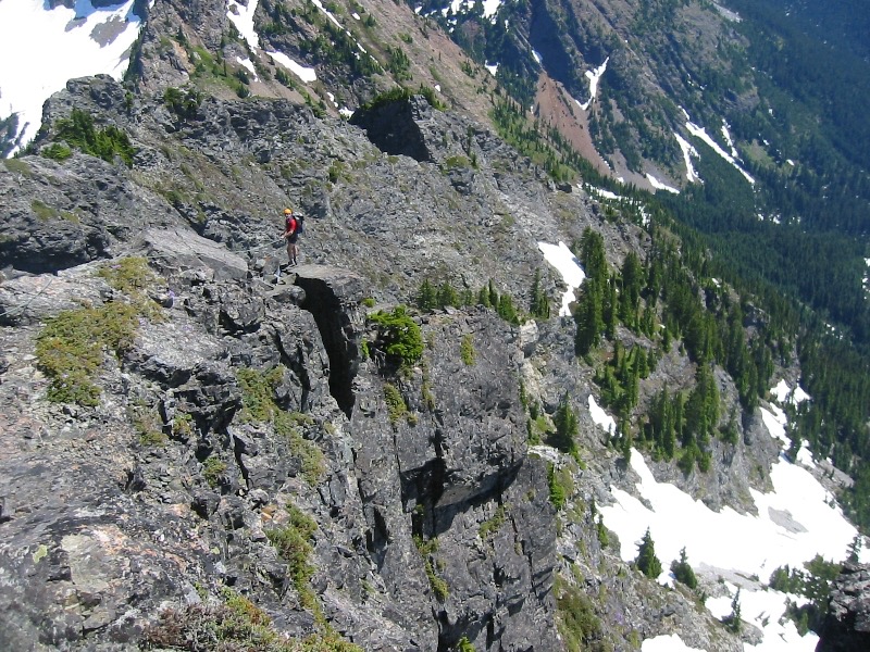 Lundin Peak makes a worthy climbing objective thanks to easy access, interesting navigation, and solid rock. Incidentally, Cascade Alpine Guide states that the mountain is composed of granodiorite associated with the Snoqualmie Batholith, but I believe this is incorrect; the texture and bedding are actually consistent with the volcanic rhyolites and andesites and meta-sedimentary rocks found at other nearby peaks such as Mt. Thomson and Guye Peak.