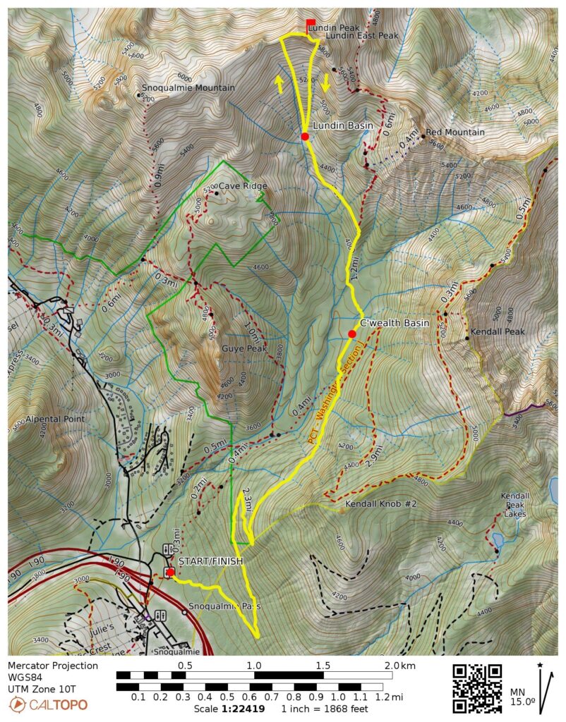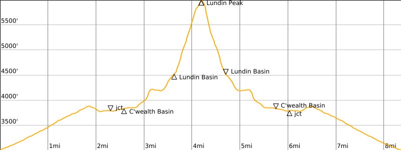 Way Points: Commonwealth Basin Trail junction & Commonwealth Basin & Commonwealth Creek crossing & Lundin Basin & West Lundin Ridge saddle & Lundin Peak summit & East Lundin Ridge notch & Lundin Basin (trail hike & bushwhack & snow climb & rock scramble)