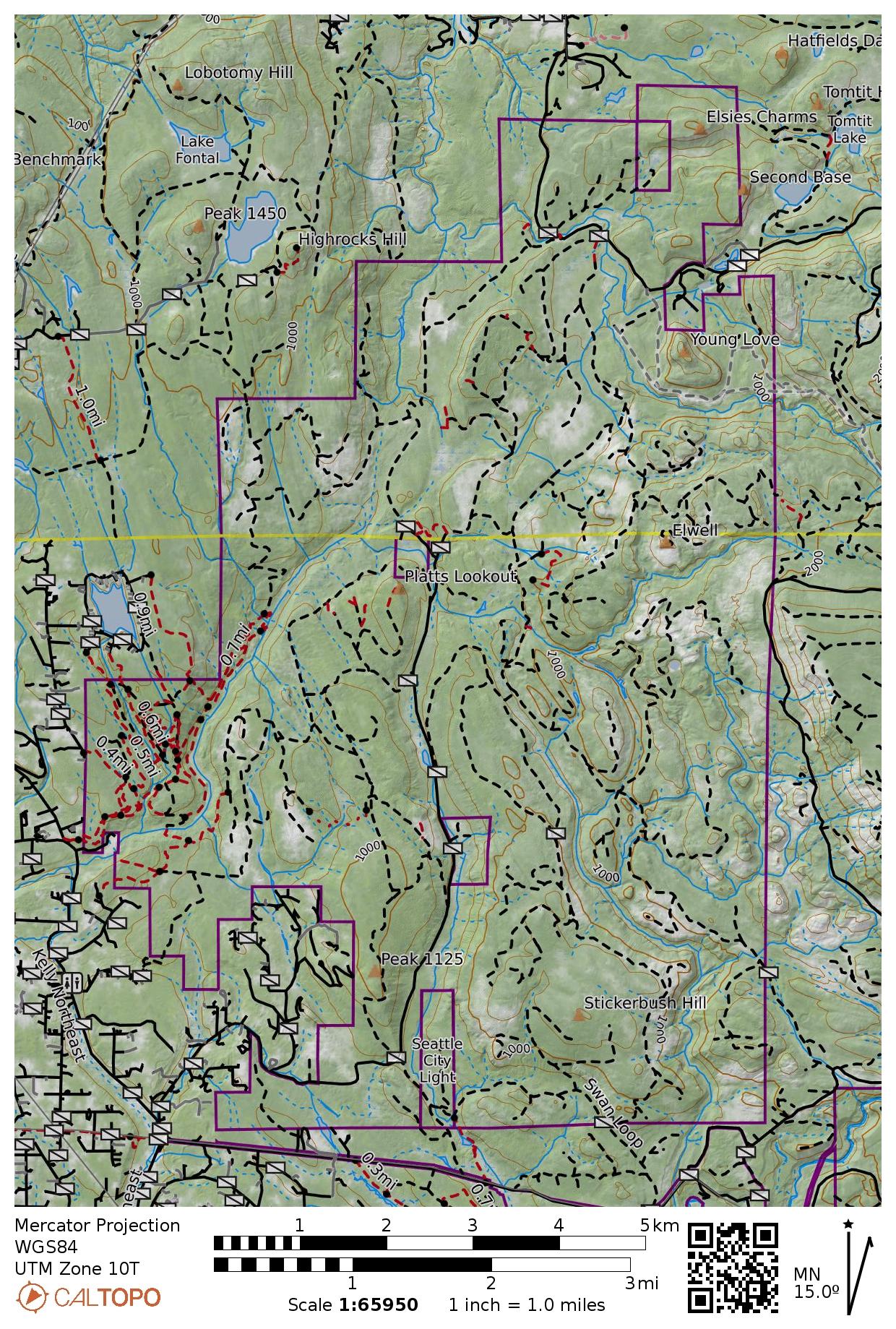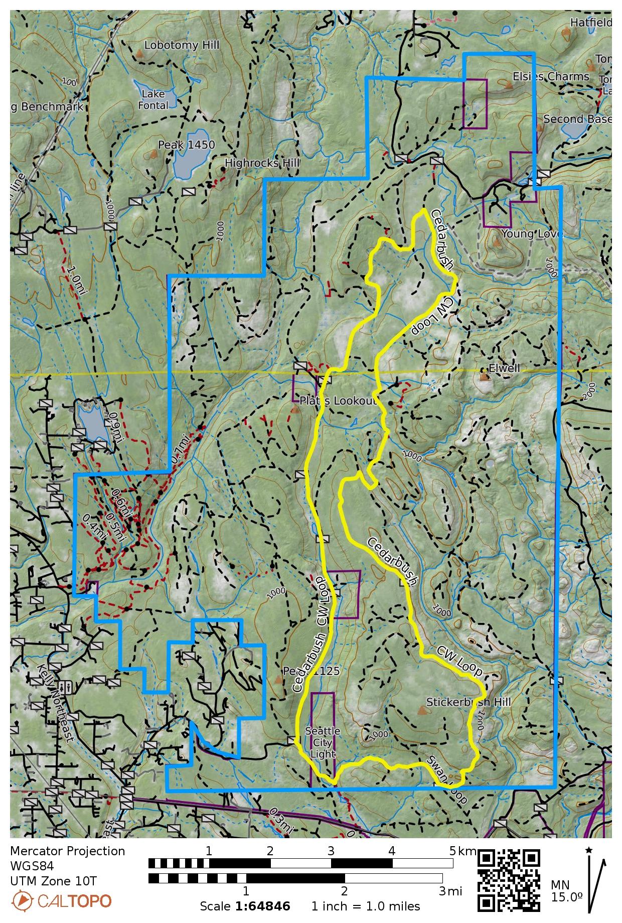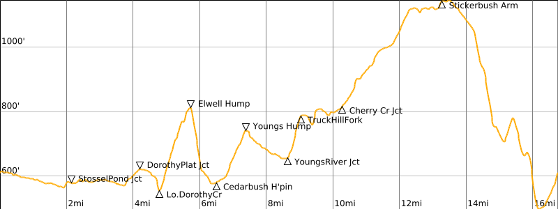 From Cedarbush Hairpin, make a steady ascent until topping out on Youngs Hump at 7.4 miles. This local high point is marked by a large gravel quarry. Descend slightly, crossing Upper Dorothy Creek Bridge to reach Youngs River Junction at 8.7 miles. You have now converged with the Cherrybush Loop.