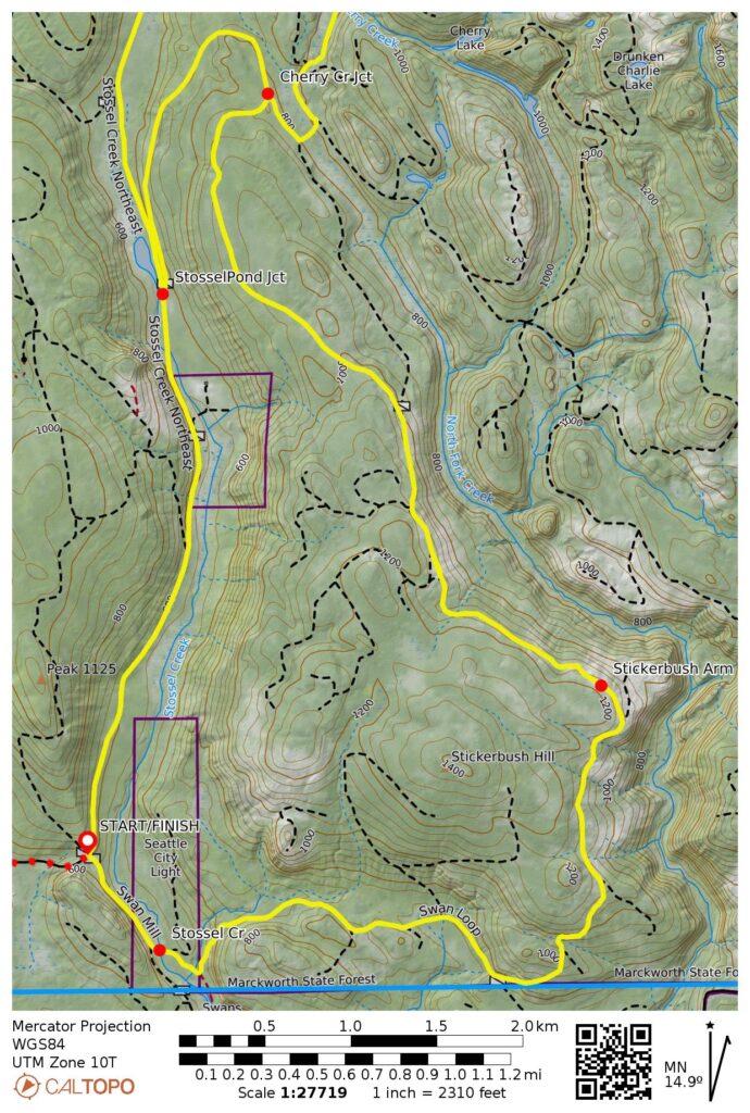 The Cedarbush Loop follows a 16.8-mile course that incorporates most of the Stickerbush and Cherrybush Loops, plus a northern extension toward Cedar Ponds Road. Of the three loops, this one provides the greatest challenge, due to its total length and elevation gain, as well as its long stretches of loose gravel in the northernmost portion.