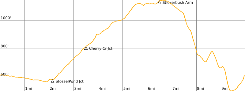 Turn left (south) and make a long, steady climb along the eastern flank of Stickerbush Hill. The road gradient eventually eases back and then tops out on Stickerbush Arm at 9.2 miles. This northeastern arm of Stickerbush Hill represents the highest point of your loop and is identified by a “3½” mile marker nailed to an adjacent tree.