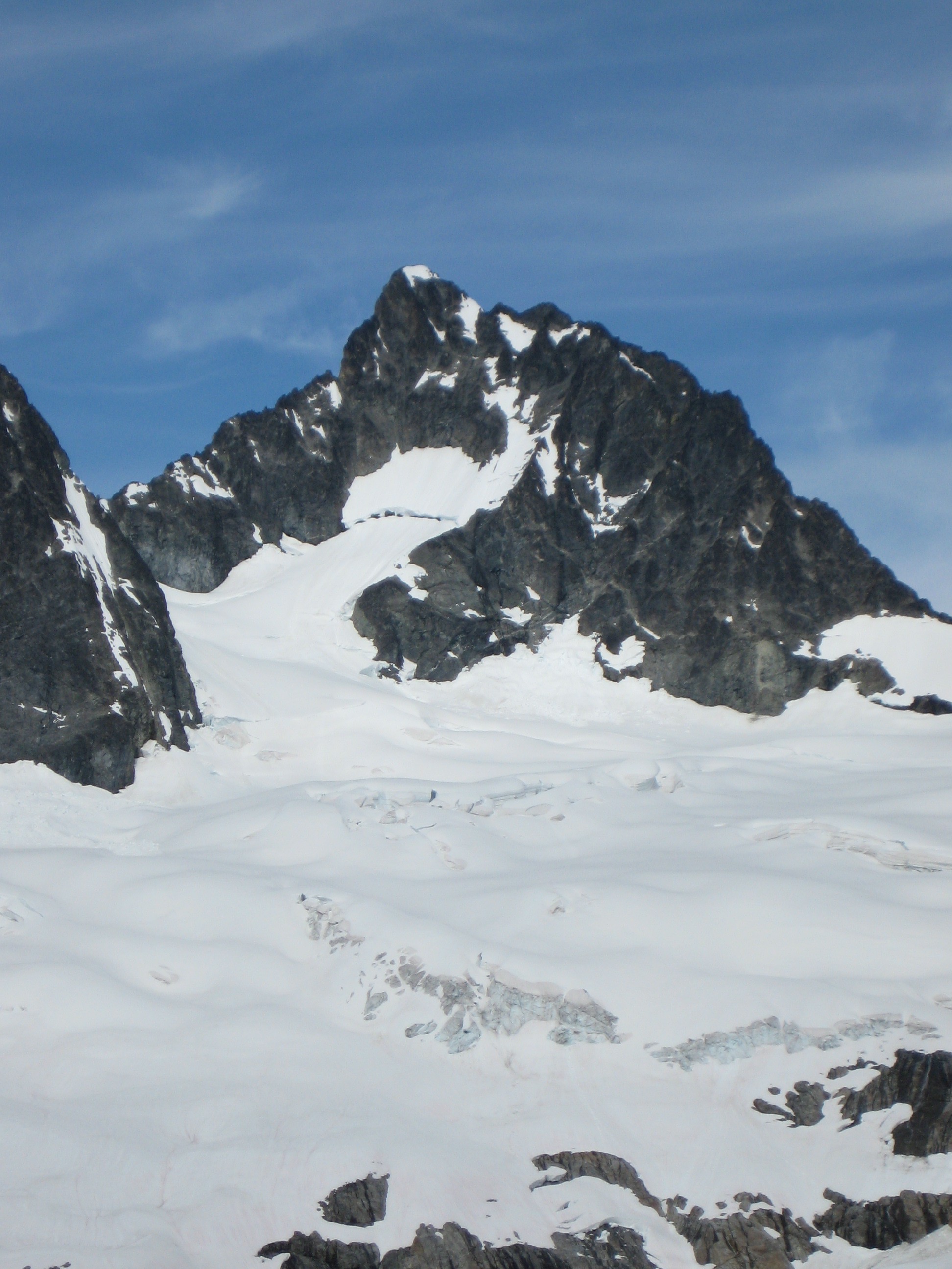 The next day started out sunny and mild but gradually turned cloudy and chilly. We ascended avalanche chutes and upper snowfields to a mid-mountain cliff band at about 7000 feet. Rock scrambling led up to a 7400-foot notch in Martin’s west ridge (3.0 hours from camp). From there, we roped up and climbed Class 3-4 rock along the lower ridge crest, then traversed a series of ribs and gullies until closer to the summit block.