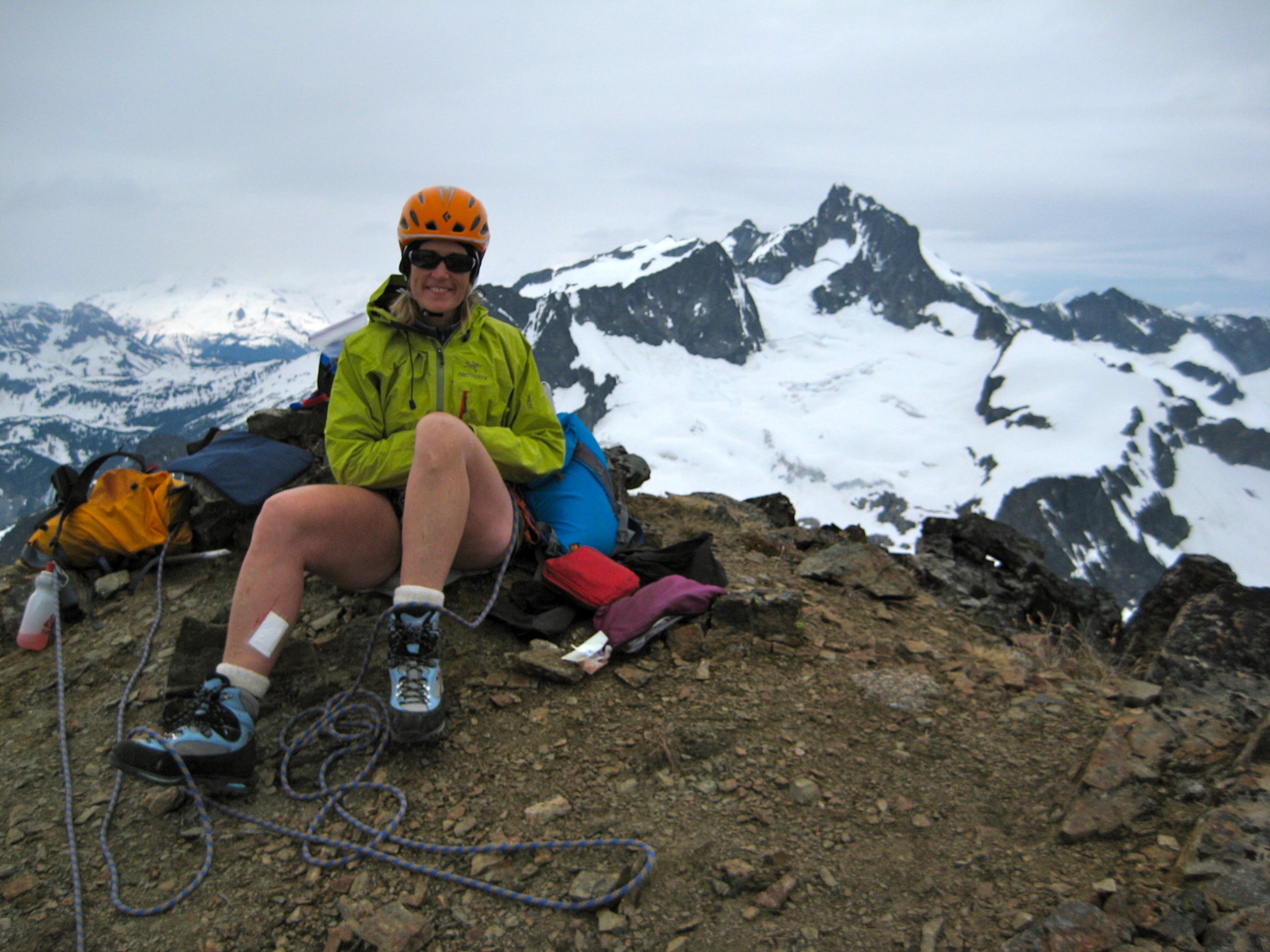 Eileen and I managed to tuck in Martin Peak just before the Pre-Independence Day Storm set in last Monday and Tuesday. This was our fourth consecutive Independence Day Weekend trip into the Stehekin Mountains, thereby carrying on what has become a very enjoyable and satisfying tradition. Appropriately, the widely varying conditions served up a patriotic color scheme of red (sunburn), white (numb fingers), and blue (bruises).