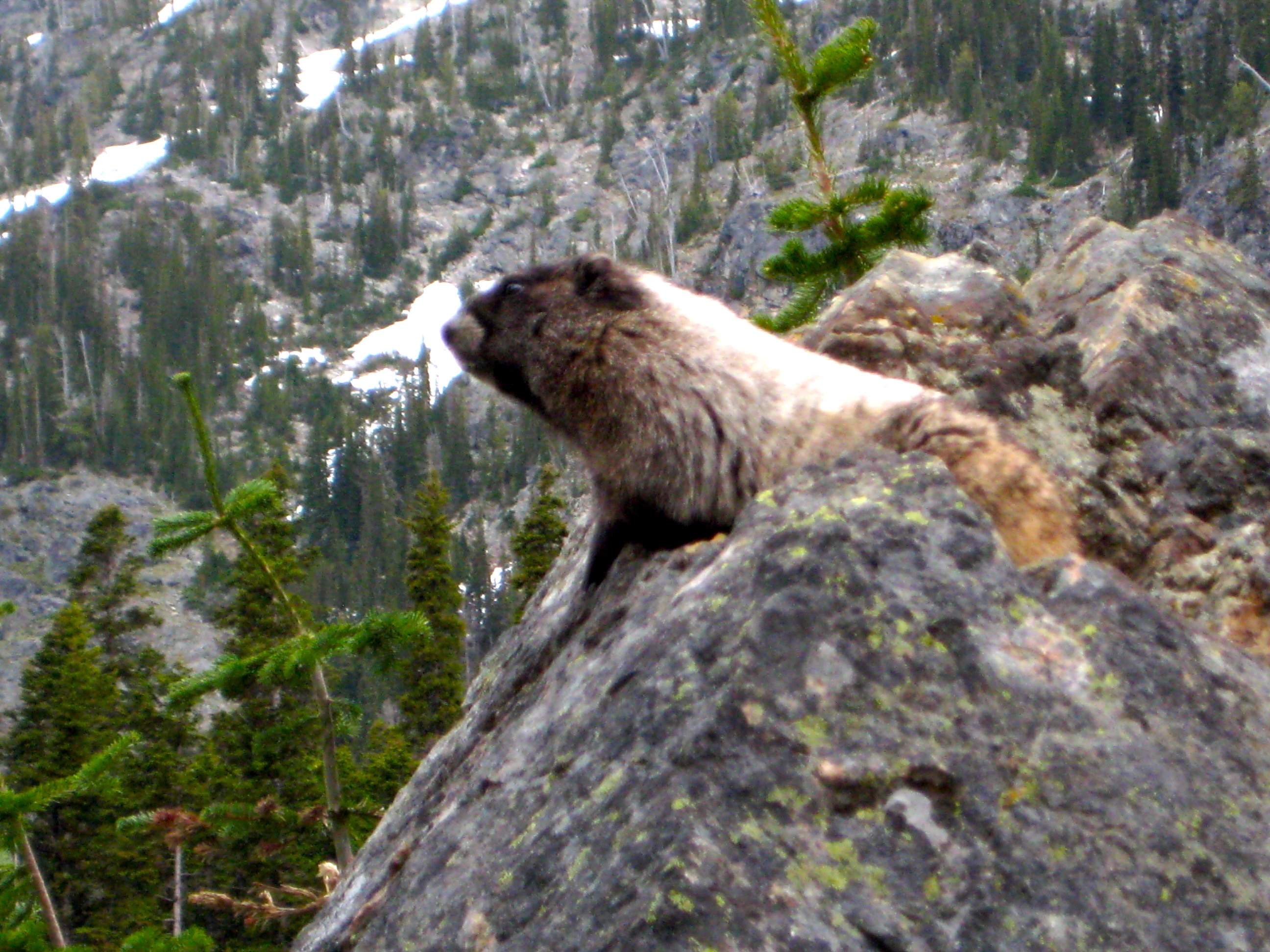 Due to the darkening sky, we headed down after a short stay. Our descent route closely followed our ascent route except that we were able to avoid most of the Class 4 (fun) rock by staying a bit below the ridge crest. Rain started to fall just after we reached our camp (3.5 hours from summit). While cooking dinner in the tent doorway, we were entertained by an unusually friendly marmot who appeared to live nearby. Eileen named him “Henry.”