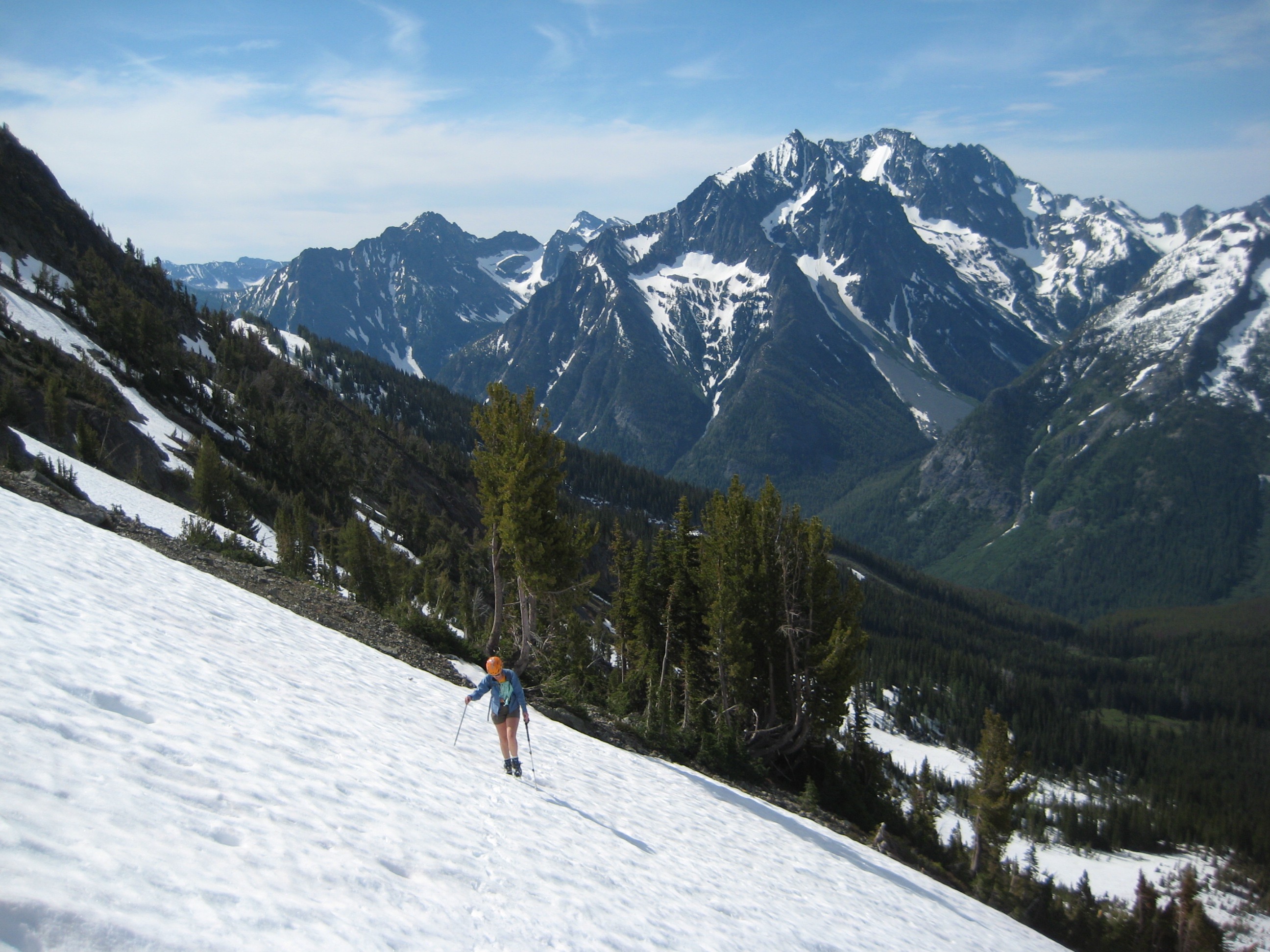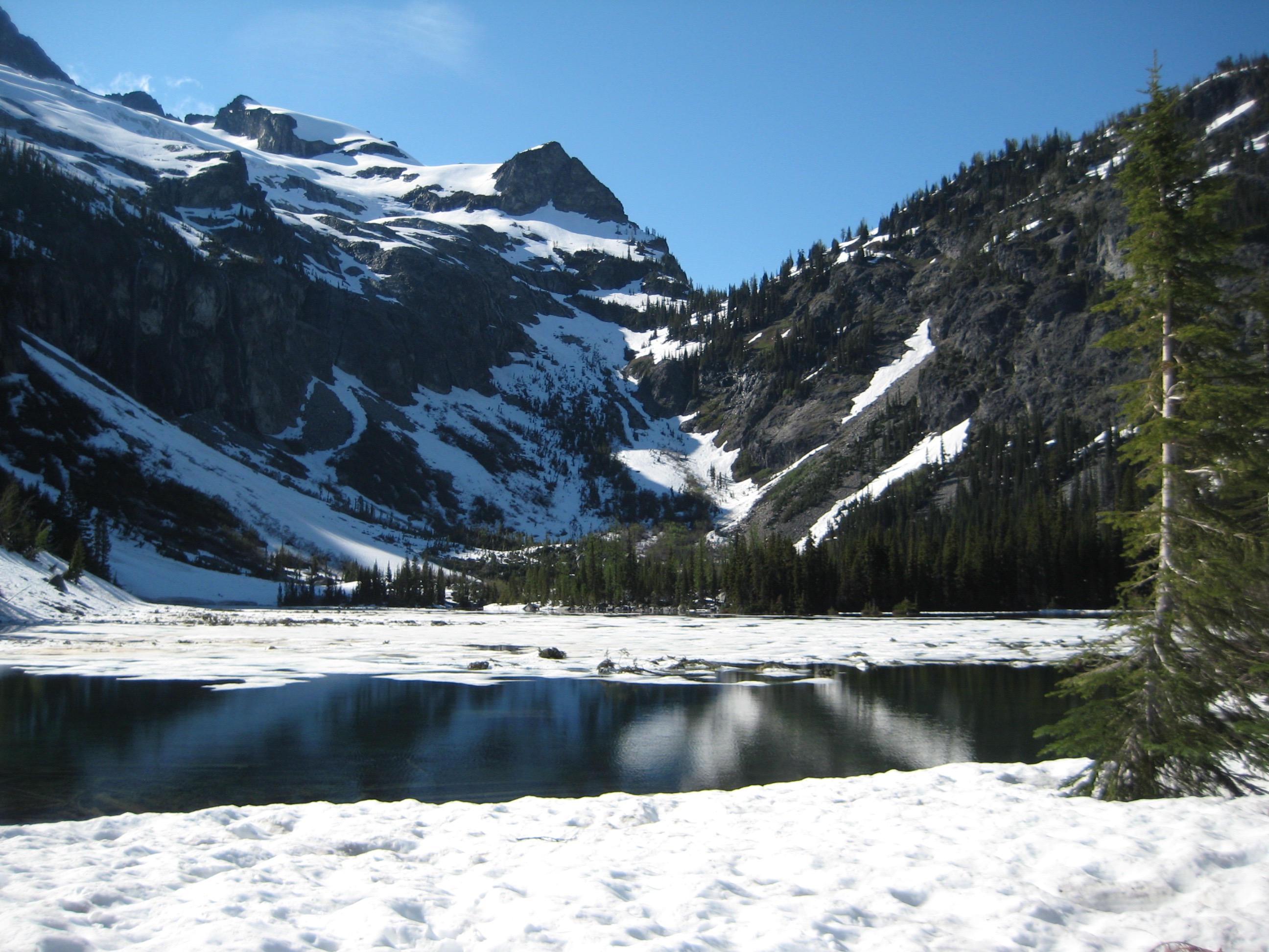 Construction vehicles and workers—all associated with the ongoing mine cleanup efforts—were prevalent on the road and in Holden Village. The trail to Holden Lake was in excellent shape, thanks in part to a WTA crew who was starting a week of trail maintenance. Holden Lake was about half snow-covered, as were the surroundings. We made camp on a bare patch within a large avalanche swath.