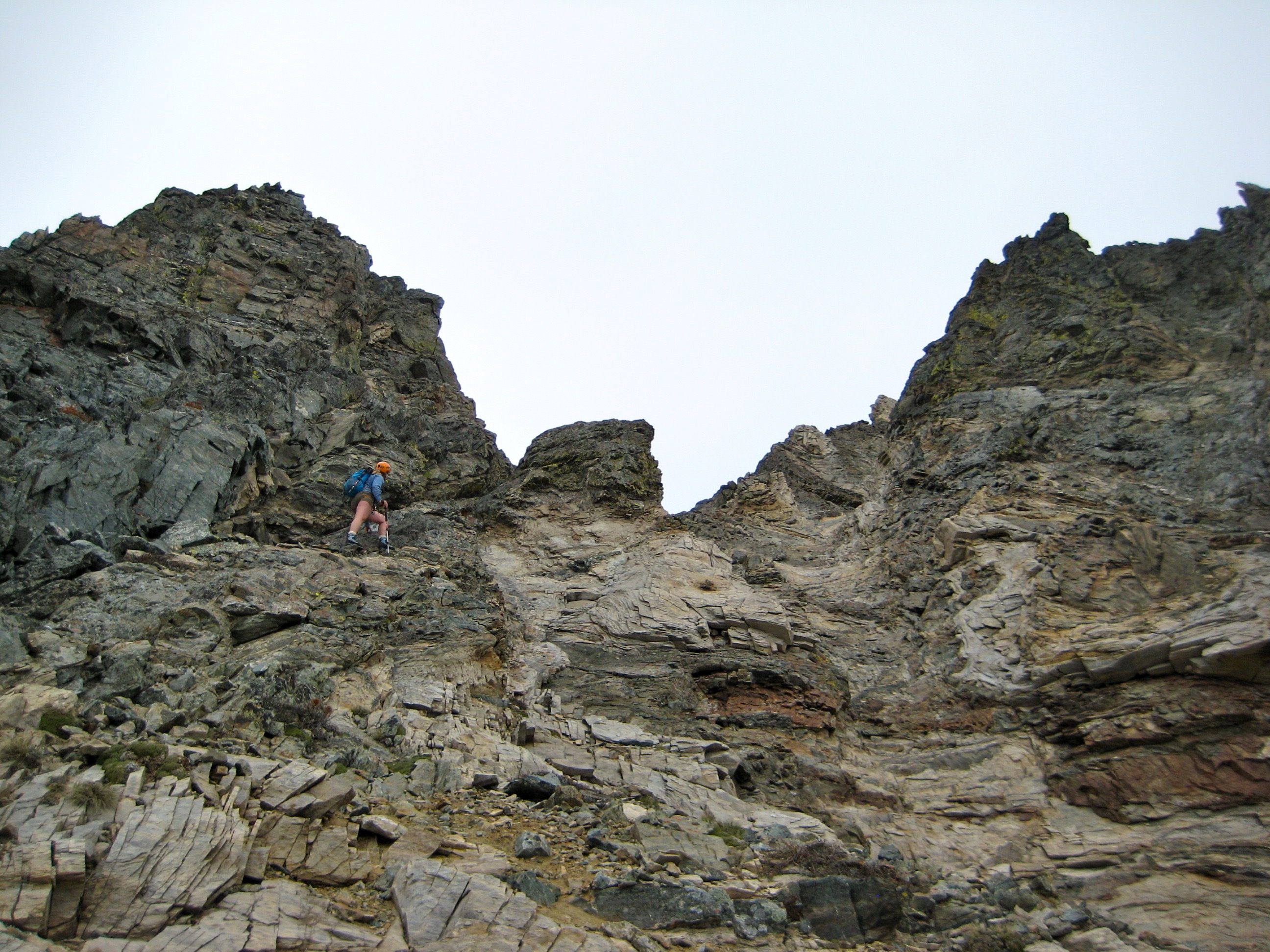A broad, shallow gully of grippy, loose, beige marble took us back up to the crest, where some more Class 3-4 climbing along the upper west ridge gave way to a final steep face on the northwestern side of the summit block. Eileen deftly dodged a rock that I kicked loose in this area but came away with an assortment of cuts and bruises when she collided with the rock face.