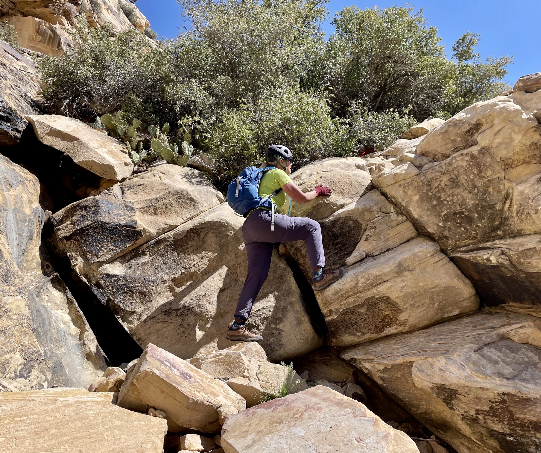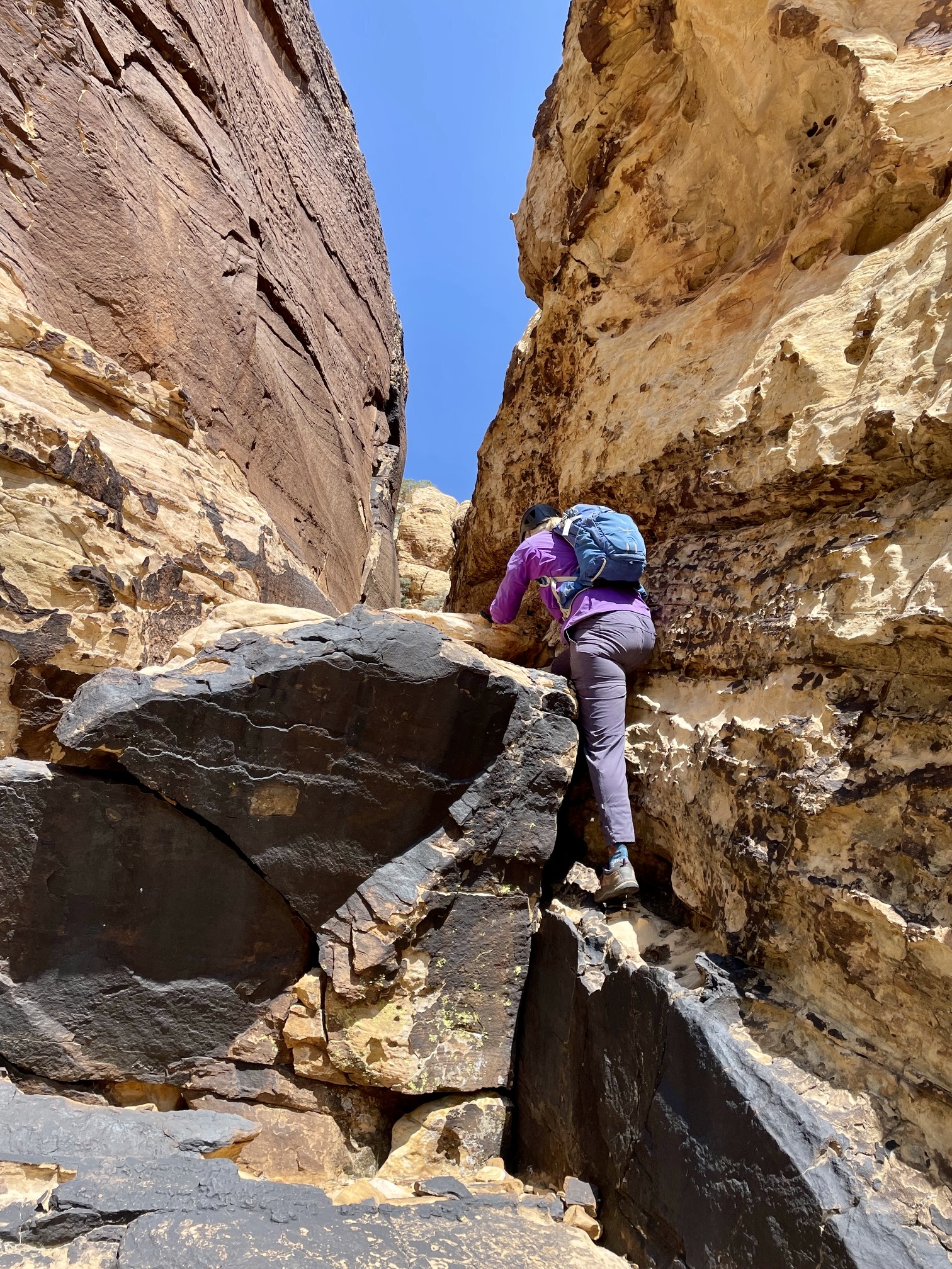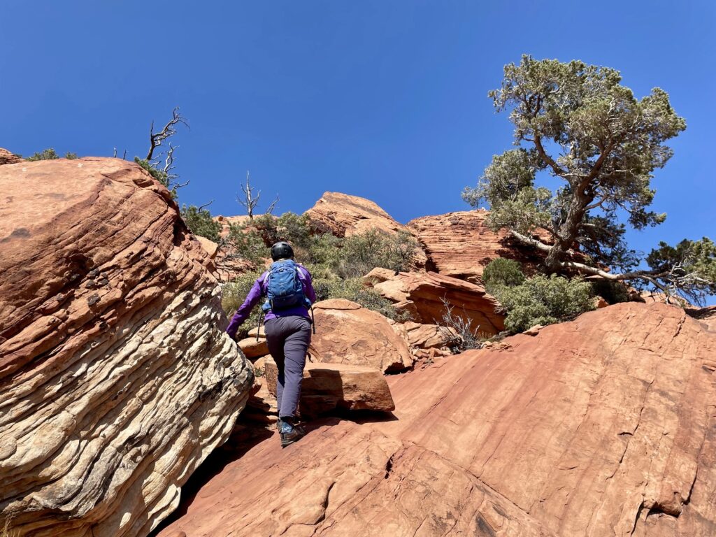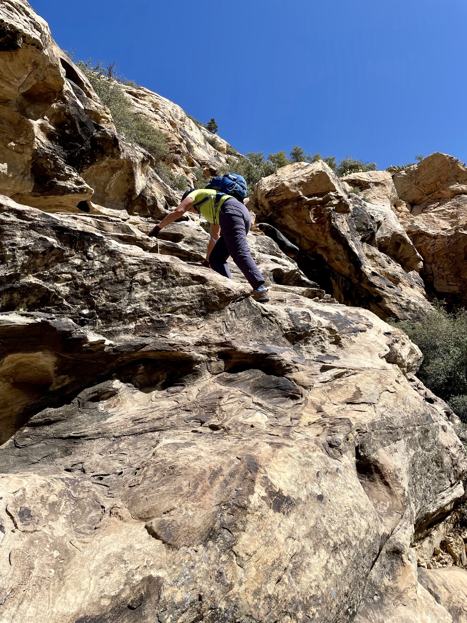 Leaving the canyon invert, we groveled up the rockslide until coming to a short cliff beside a dead pine tree. We hiked out to our left to get around the short cliff, then re-entered the rockslide adjacent to a second, higher pine tree. More groveling took us past a third pine tree to the base of a tall sandstone face pockmarked with solution holes. We performed a right-angling scramble up this face to a small V-shaped gully, where we had to make an exposed Class 3 move onto a higher ledge.
