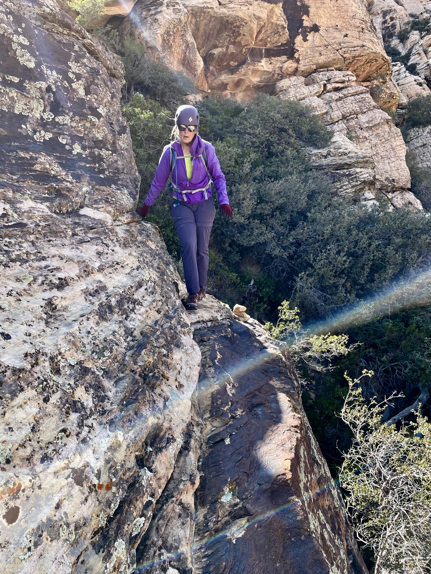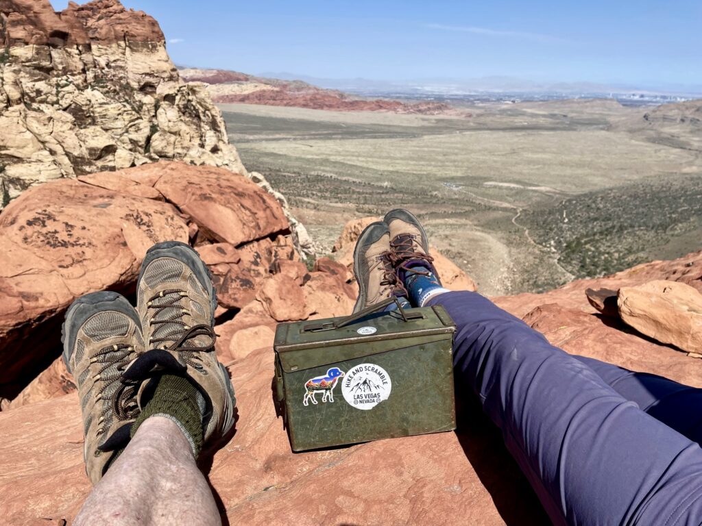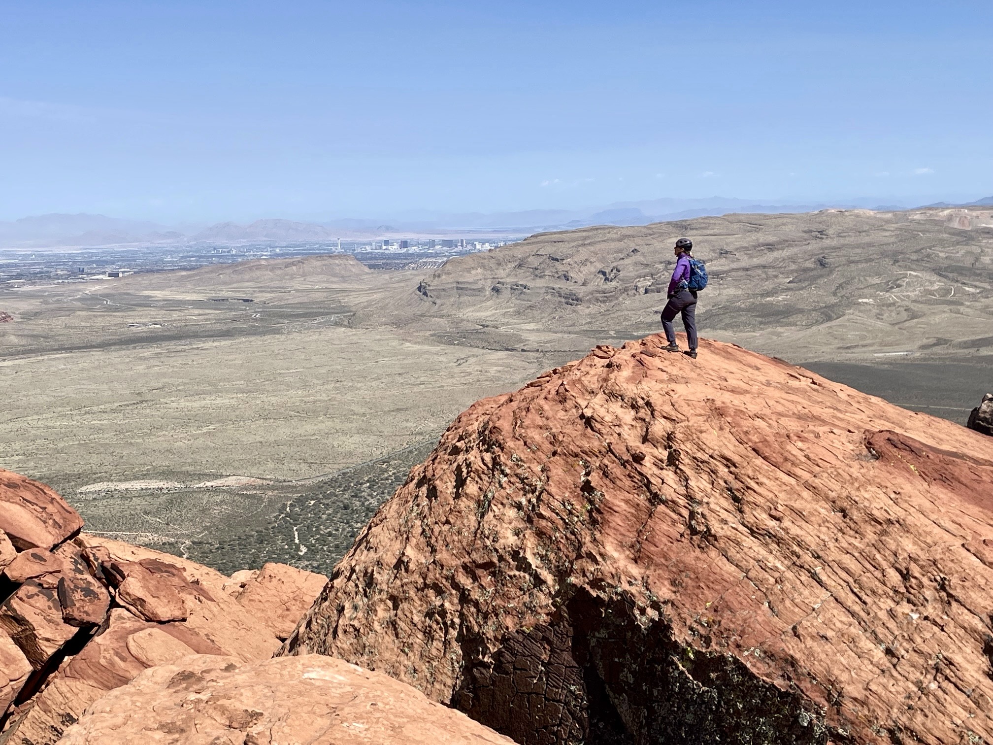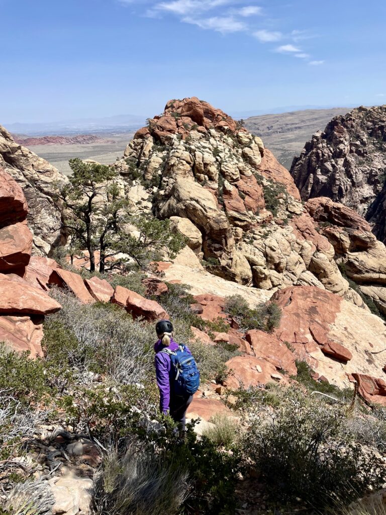 As advertised, Mescalito Peak offers stunning views of the surrounding summits and climbing walls. To the north was Bridge Mountain, and to the south were Juniper Peak and Rainbow Mountain. Red Rock Basin spread out 1500 feet below us to the east, and the high-rise buildings of Las Vegas were visible in the distance.