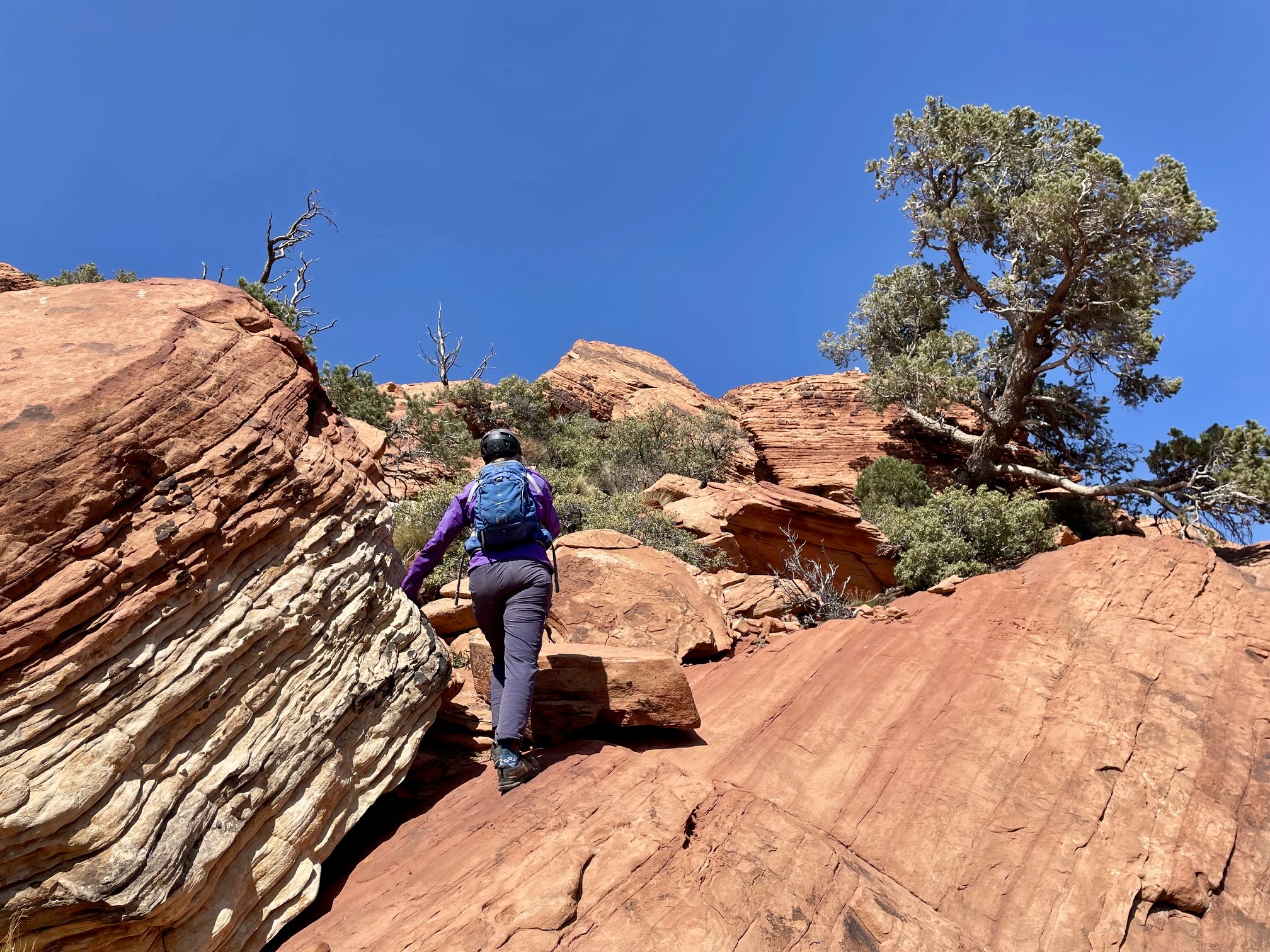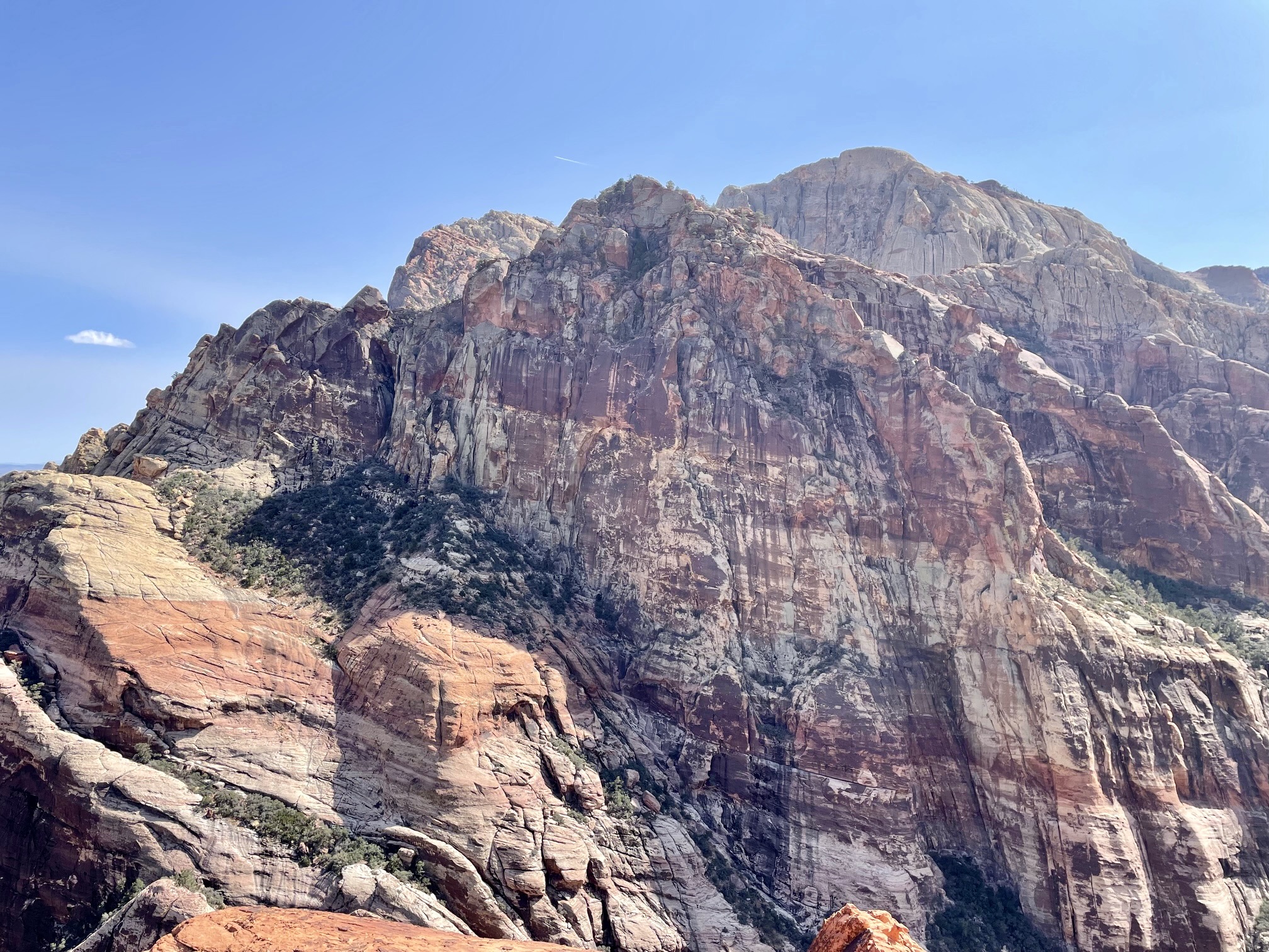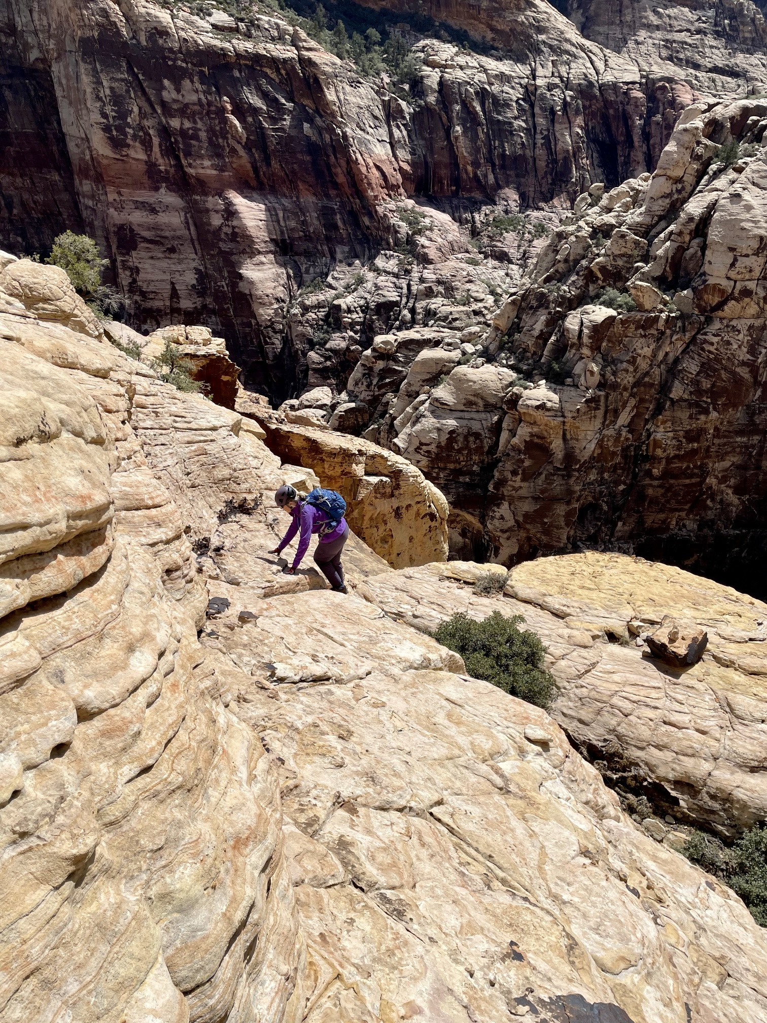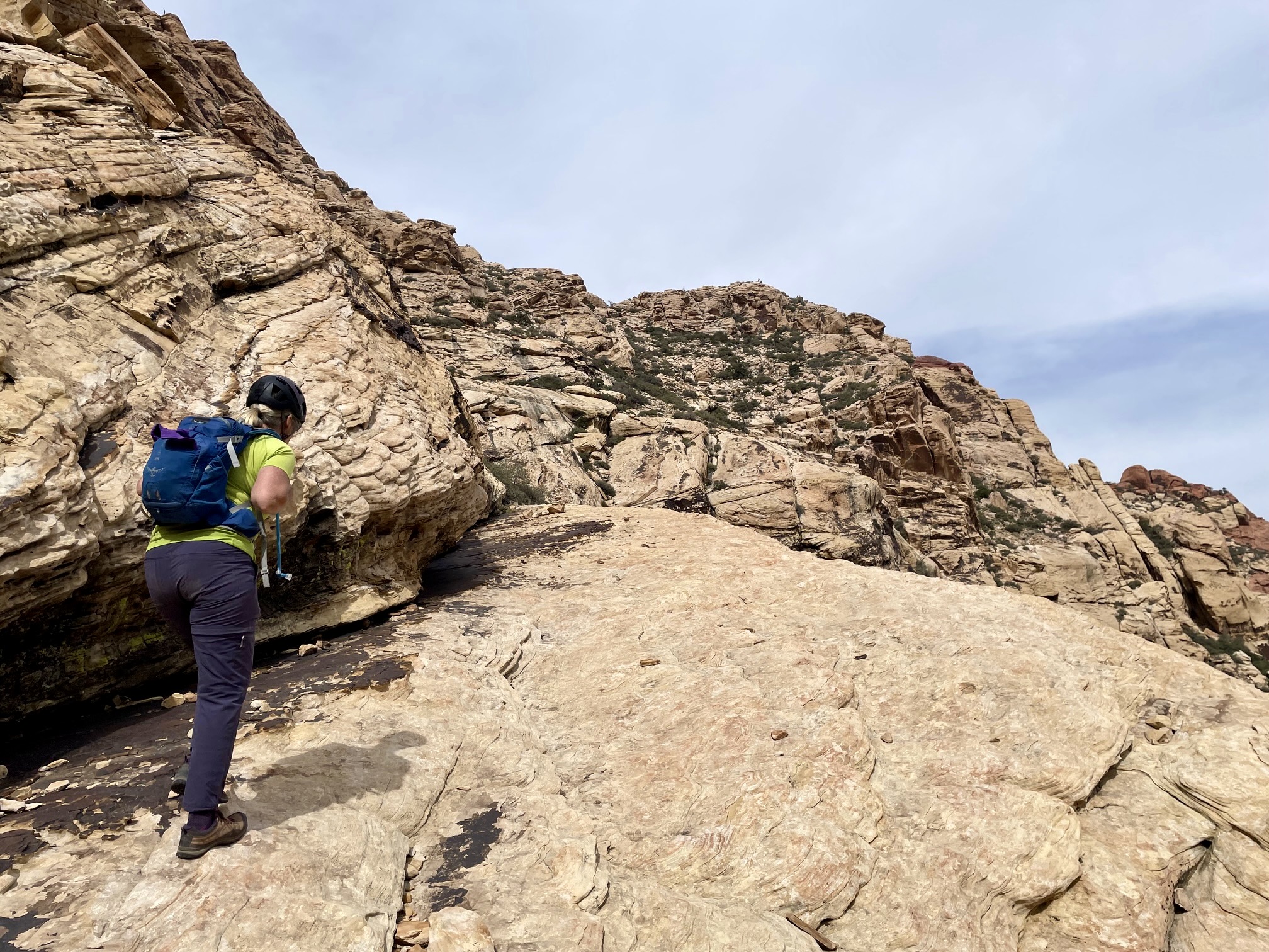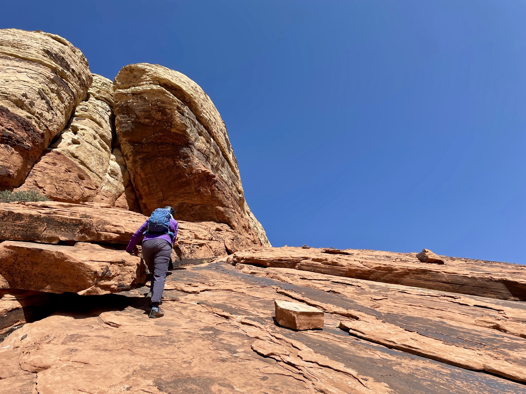 Once through the narrow gap, we traversed over to a wide ramp composed of strikingly red sandstone. It was fairly steep but very grippy. Interestingly, this red rock is composed of the same Aztec Sandstone as the whitish rock below; the color is derived from oxidation of iron contained within the formation. At the top of the red ramp, we rounded a corner and zigzagged up toward the summit dome.