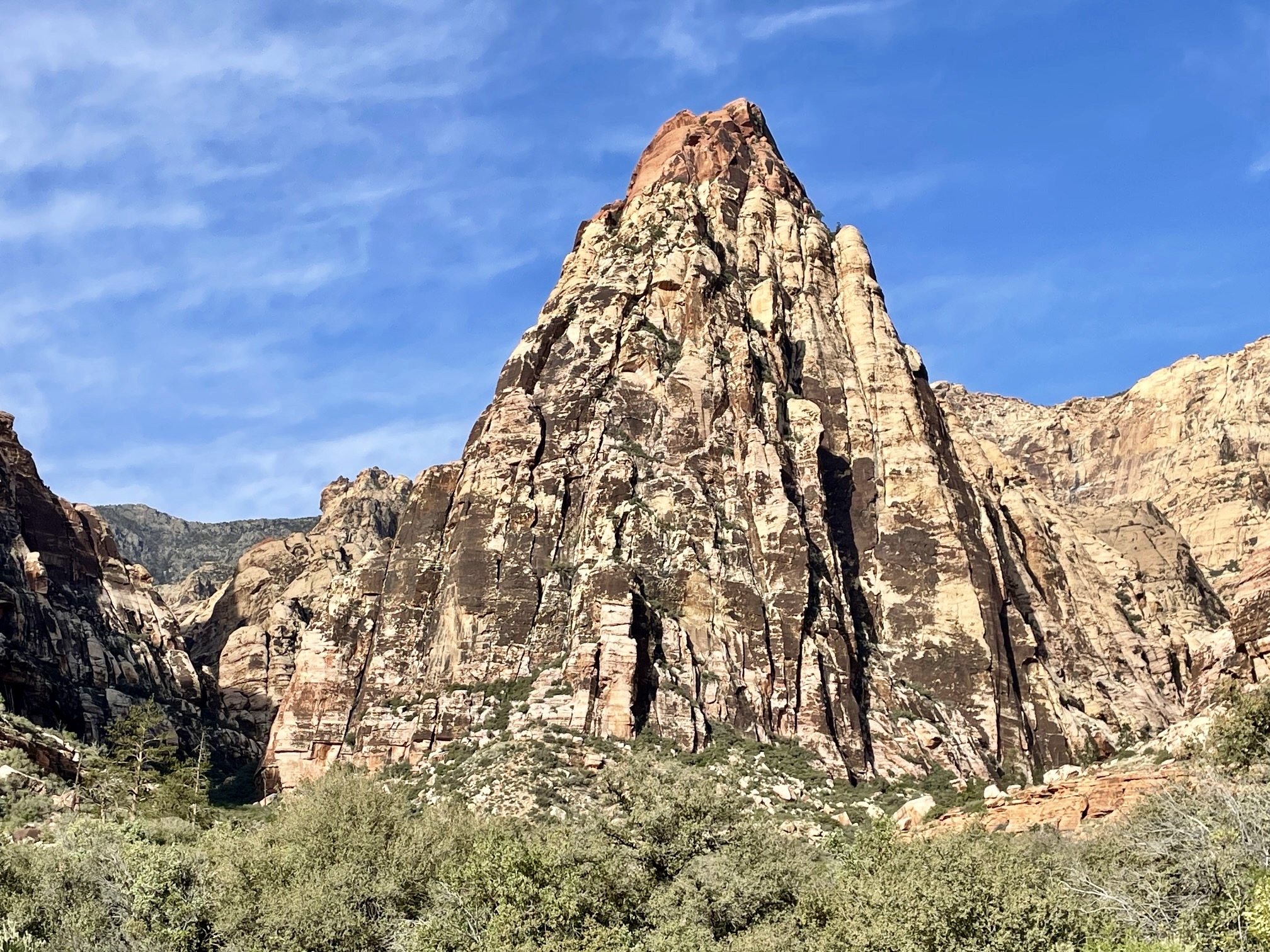 Mescalito Peak is a minor summit located in the Sandstone Bluffs of Red Rock Canyon National Conservation Area (“Red Rocks”) near Las Vegas. When seen from the east, It has the attractive shape of a large sandstone teepee, with steep white ribs rising out of the ground and culminating in a cap of maroon sandstone. However, due to its position between much higher peaks—particularly Bridge Mountain and Mt. Wilson—Mescalito is virtually unknown to Red Rocks visitors except for climbers and scramblers.