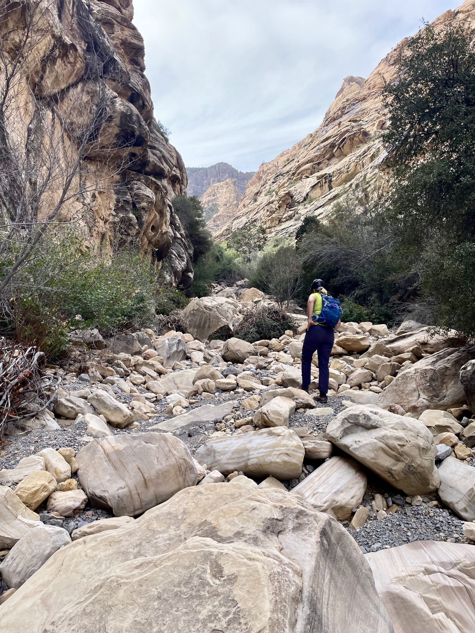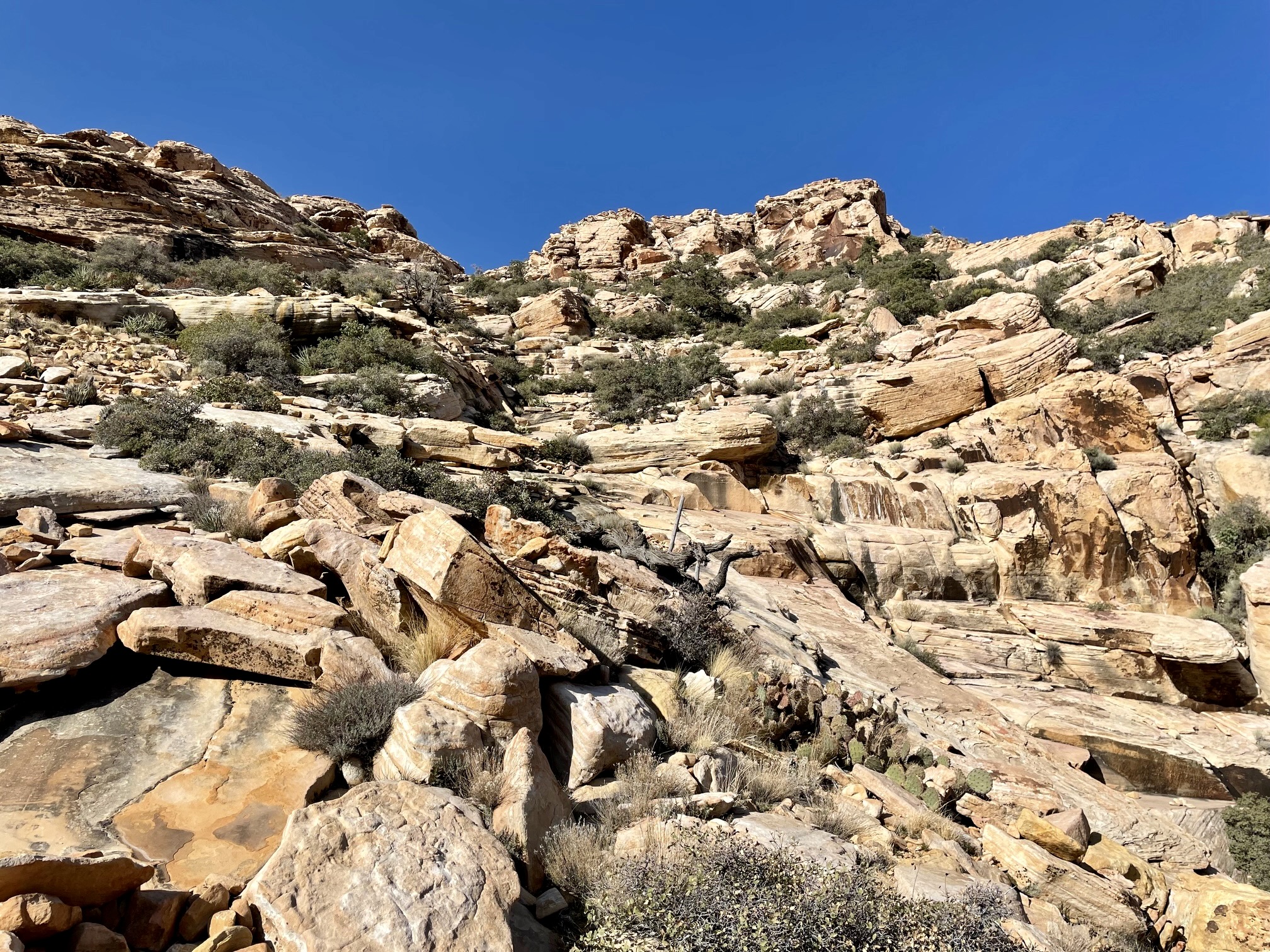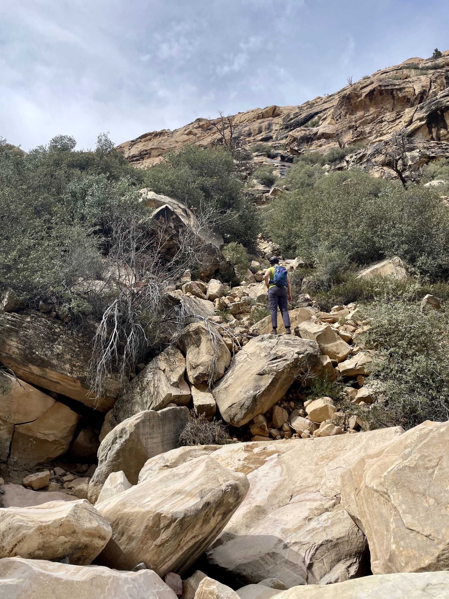 Once past The Three Amigos, Eileen and I settled into a relatively easy hike up the canyon invert, traveling over loose gravel and frequently scrambling over smaller boulders. In ¼ mile, we arrived at a place where the canyon widens and the vegetation closes in (2.5 hours + 2.3 miles + 700 feet from TH). There were several ducks and cairns here, letting us know that this is the key departure point. Immediately to our right (north) was a steep, narrow rockslide angling up the hillside.