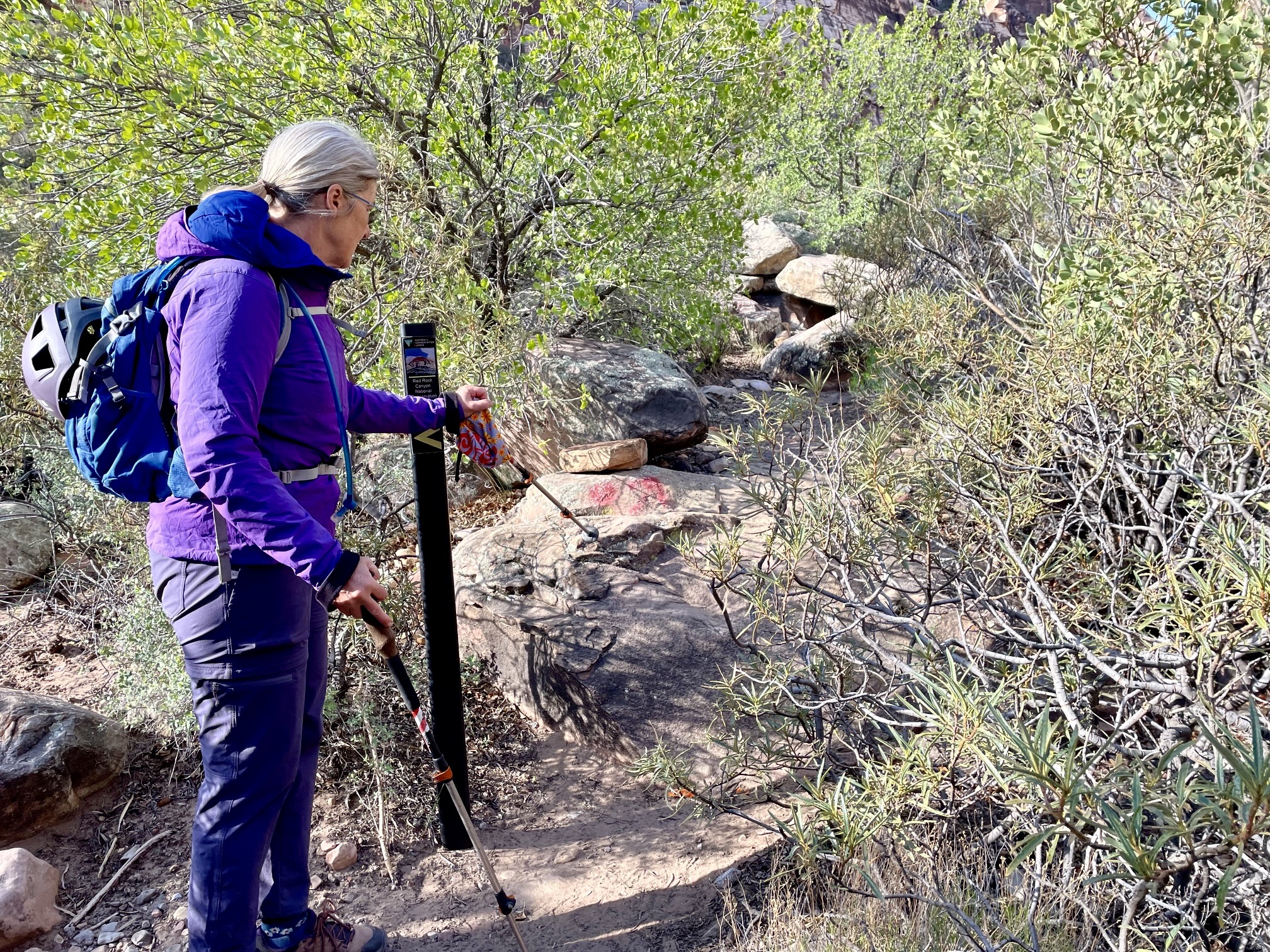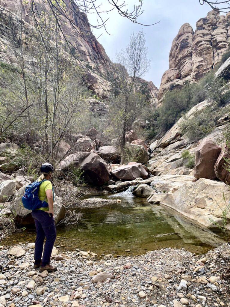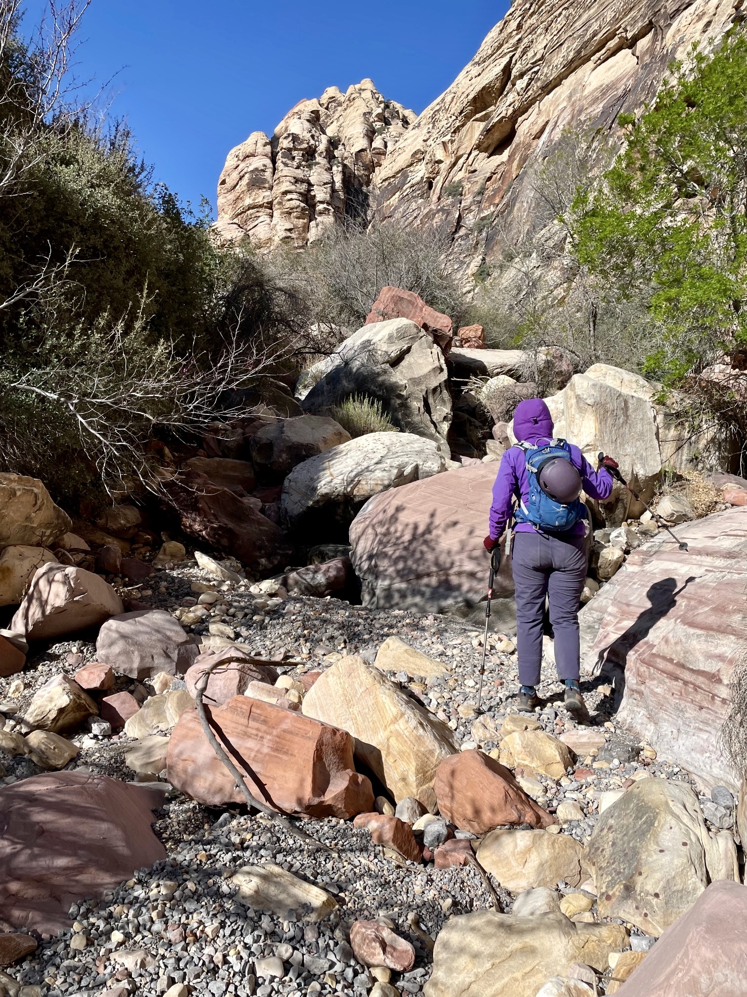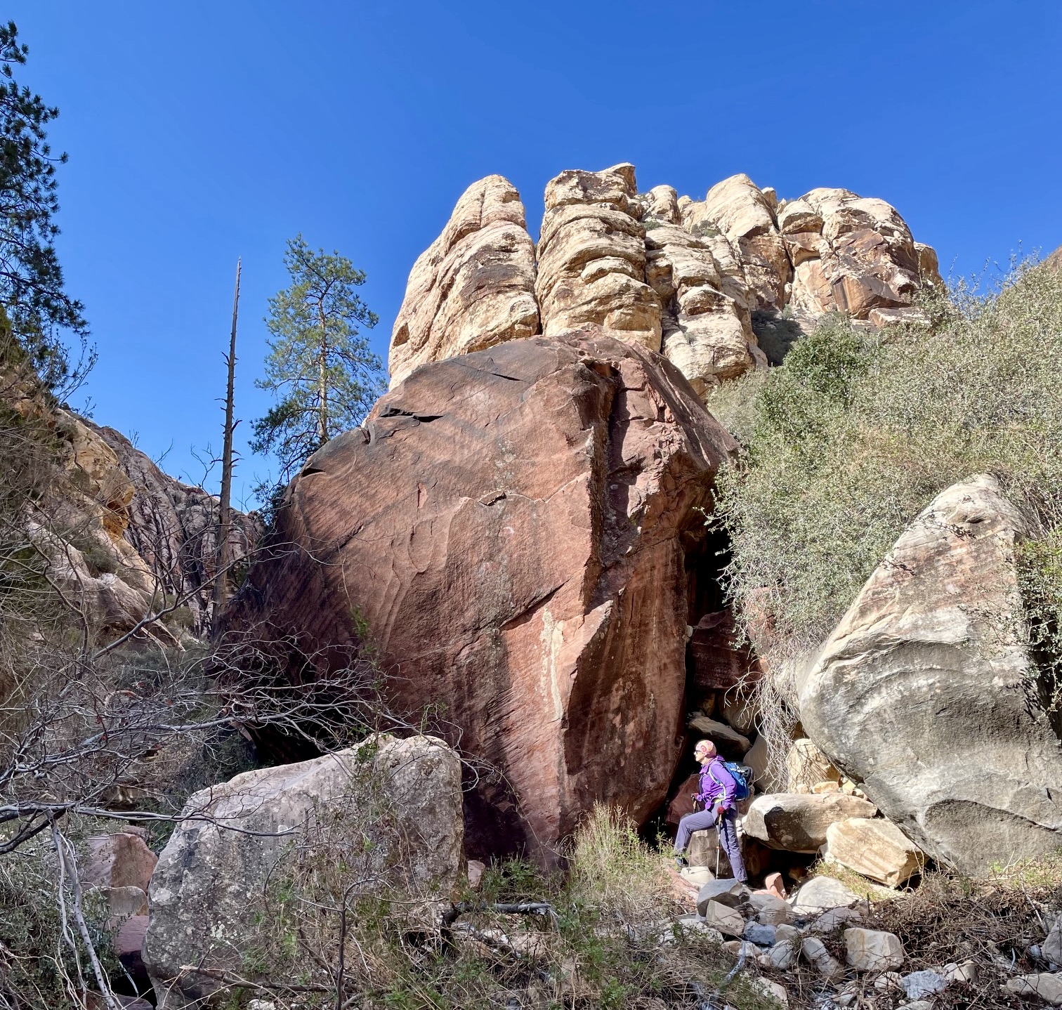 After a long mile, we came to a fork. Here, an informal climber’s path branched off to the right and proceeded up North Fork Pine Creek, whereas the formal Pine Creek Loop Trail branched off to the left. We went left and crossed a narrow wash, then quickly came to another informal junction marked by a cairn. We departed from the loop trail and veered right onto a well-trodden climber’s path that proceeds up South Fork Pine Creek Canyon.