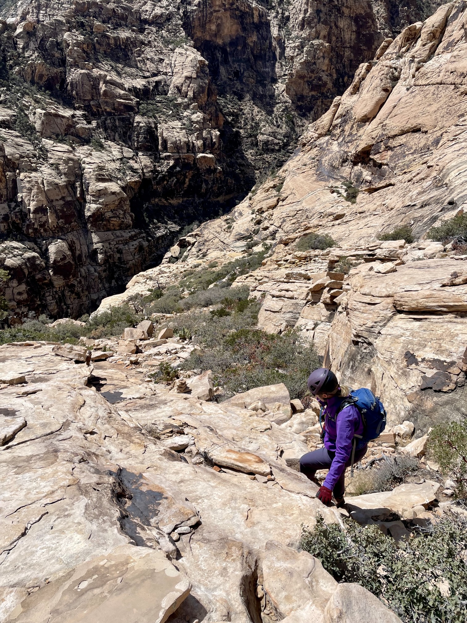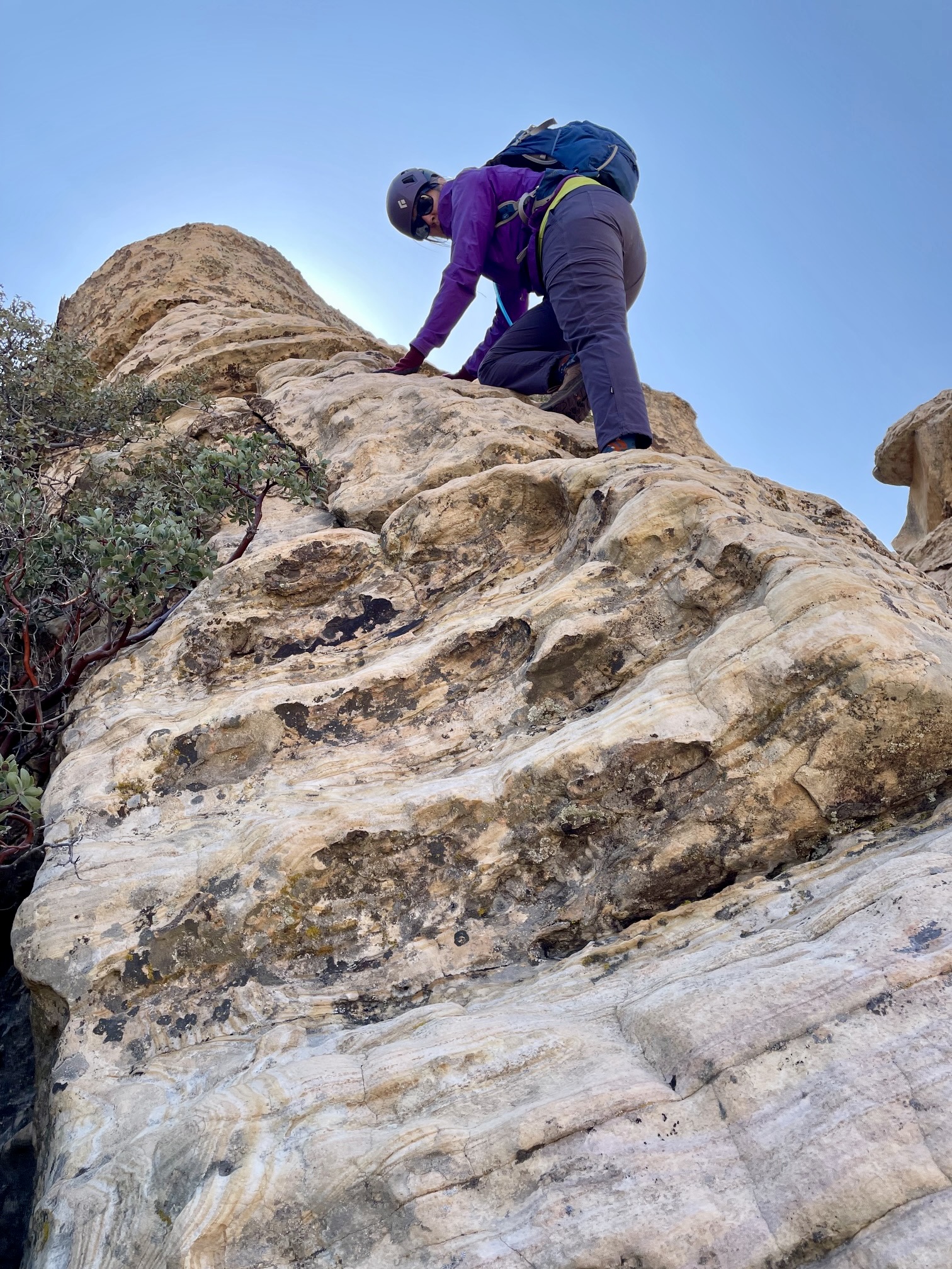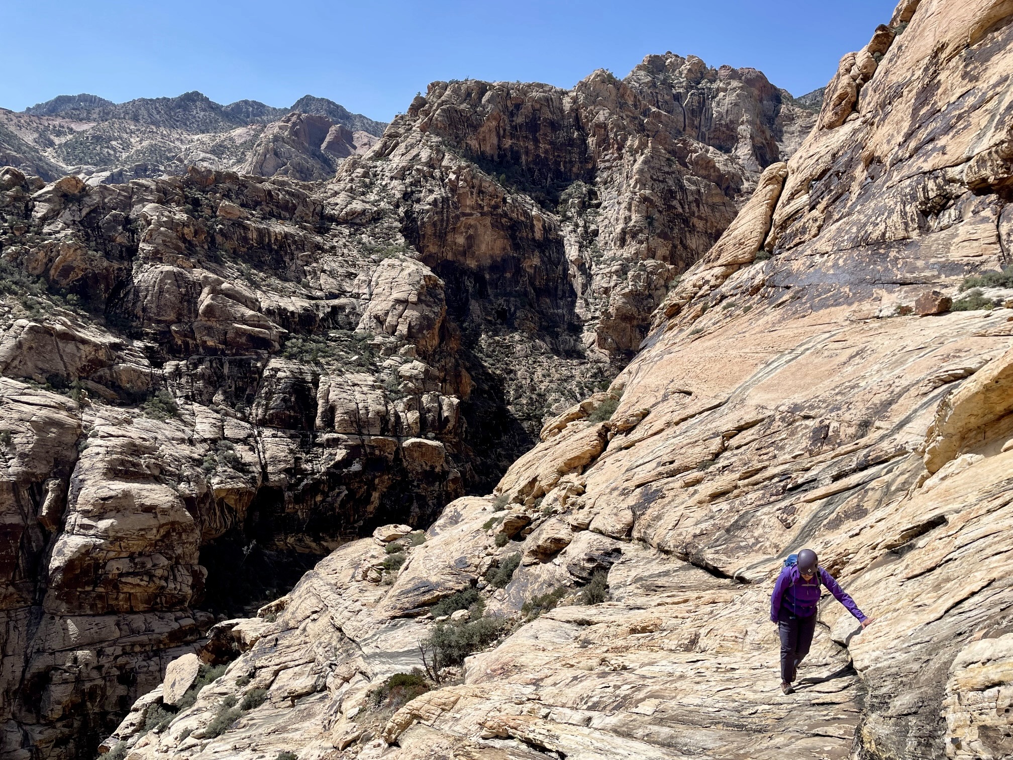 In retrospect, I would say that Mescalito Peak was probably the most convoluted scramble I’ve ever done. Compared to its neighbors, Mescalito has more route finding challenges than Bridge Mountain or Mt. Wilson, and it has far more technical difficulties and exposure than the latter. We followed the detailed directions given in Branch Whitney’s comprehensive Hiking Las Vegas guidebook but still found the micro-routefinding to be tricky and, at times, even bewildering. This is one scrappy little peak!