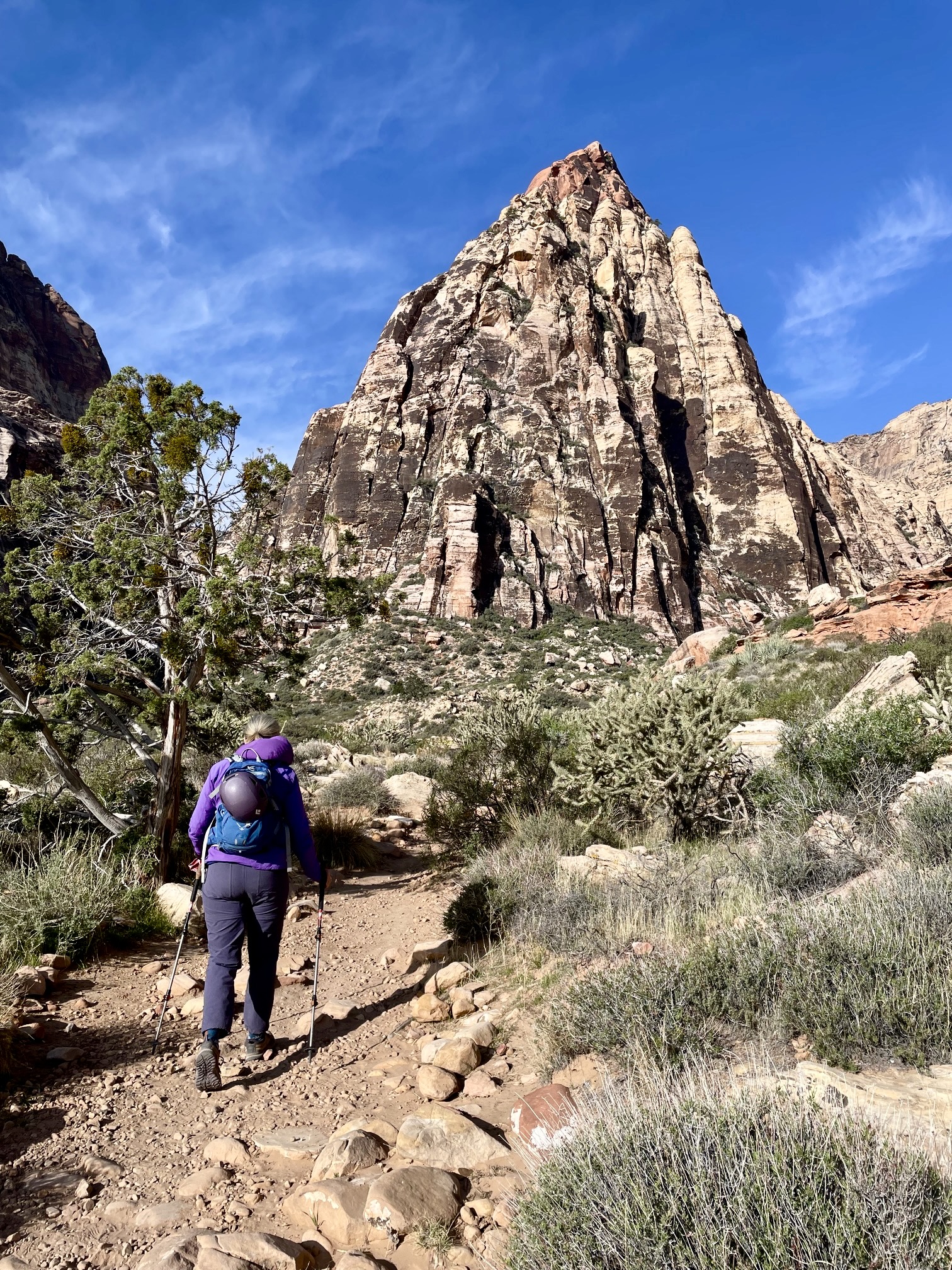 Eileen and I headed out from the Pine Creek Canyon Trailhead on a chilly and very windy Sunday morning, accompanied by numerous climbing parties laden with ropes and racks. As we hiked across a broad desert plain, scattered clouds and sun breaks intermittently spotlighted the eastern face of our objective peak.