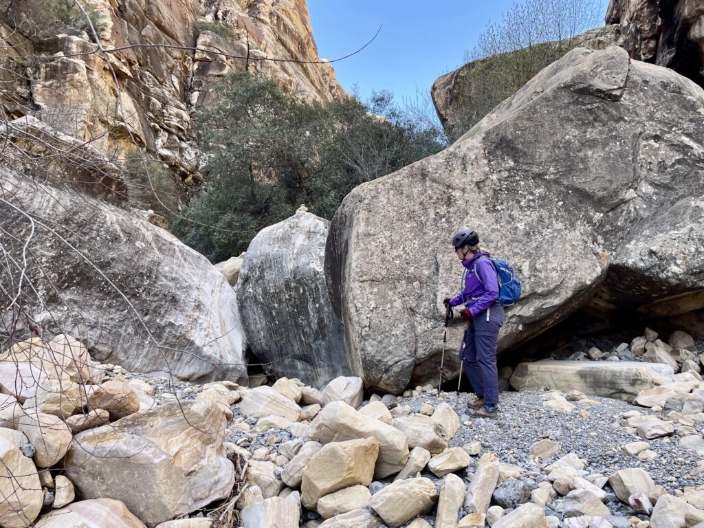 Shortly beyond the little pond, South Fork Pine Creek Canyon divides into two subsidiary canyons. We angled up the right fork, which is known as Mescalito Canyon. It initially required a lot of Class 2-3 boulder scrambling, with dozens of stone ducks marking the best route. We soon passed two giant red boulders that sit in the canyon invert. After another ¼ mile, we came to The Three Amigos—a trio of huge gray boulders that appear to form a blockade across the canyon. Fortunately, they were easily circumvented on the right side.